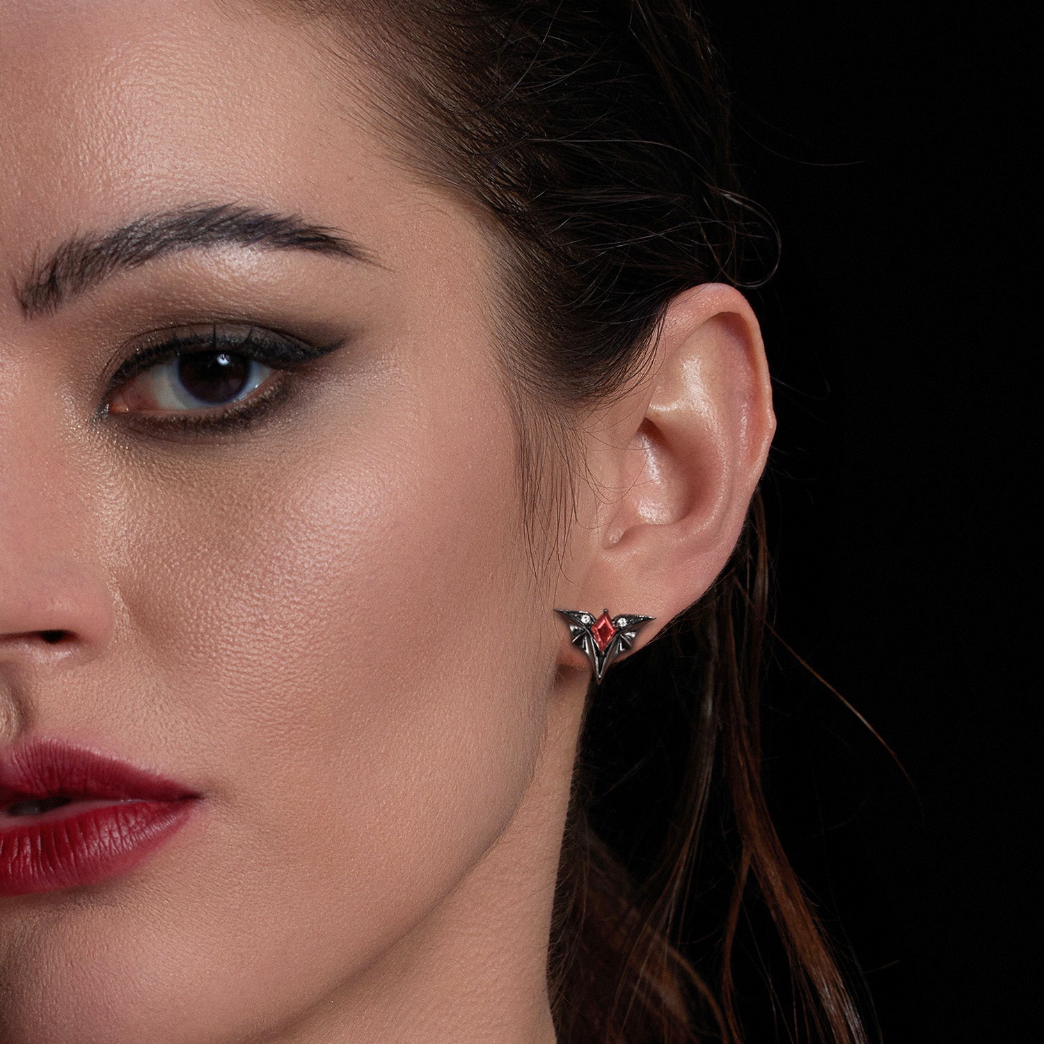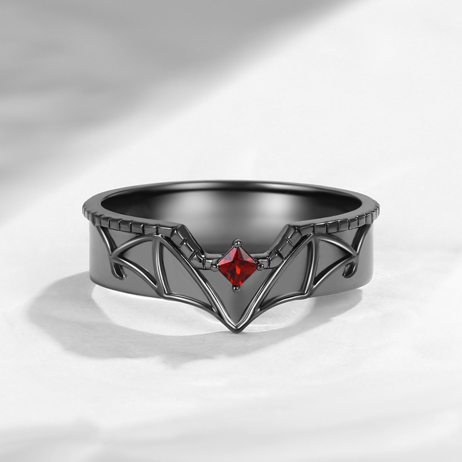 Coffin Cut Garnet Gothic Inspired Black Gold Engagement Ring - Bat Ring