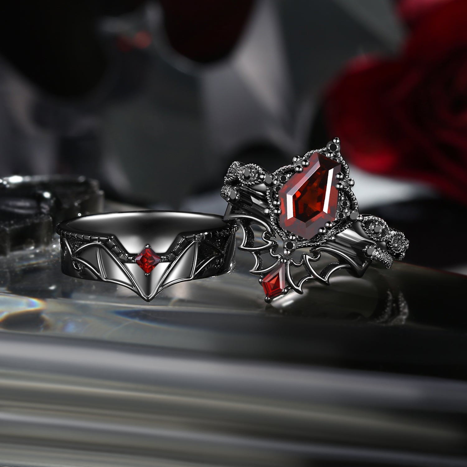 Kite Cut Garnet Bat Wing Inspired Thorns Engagement Ring Set 2pcs - Bat Ring