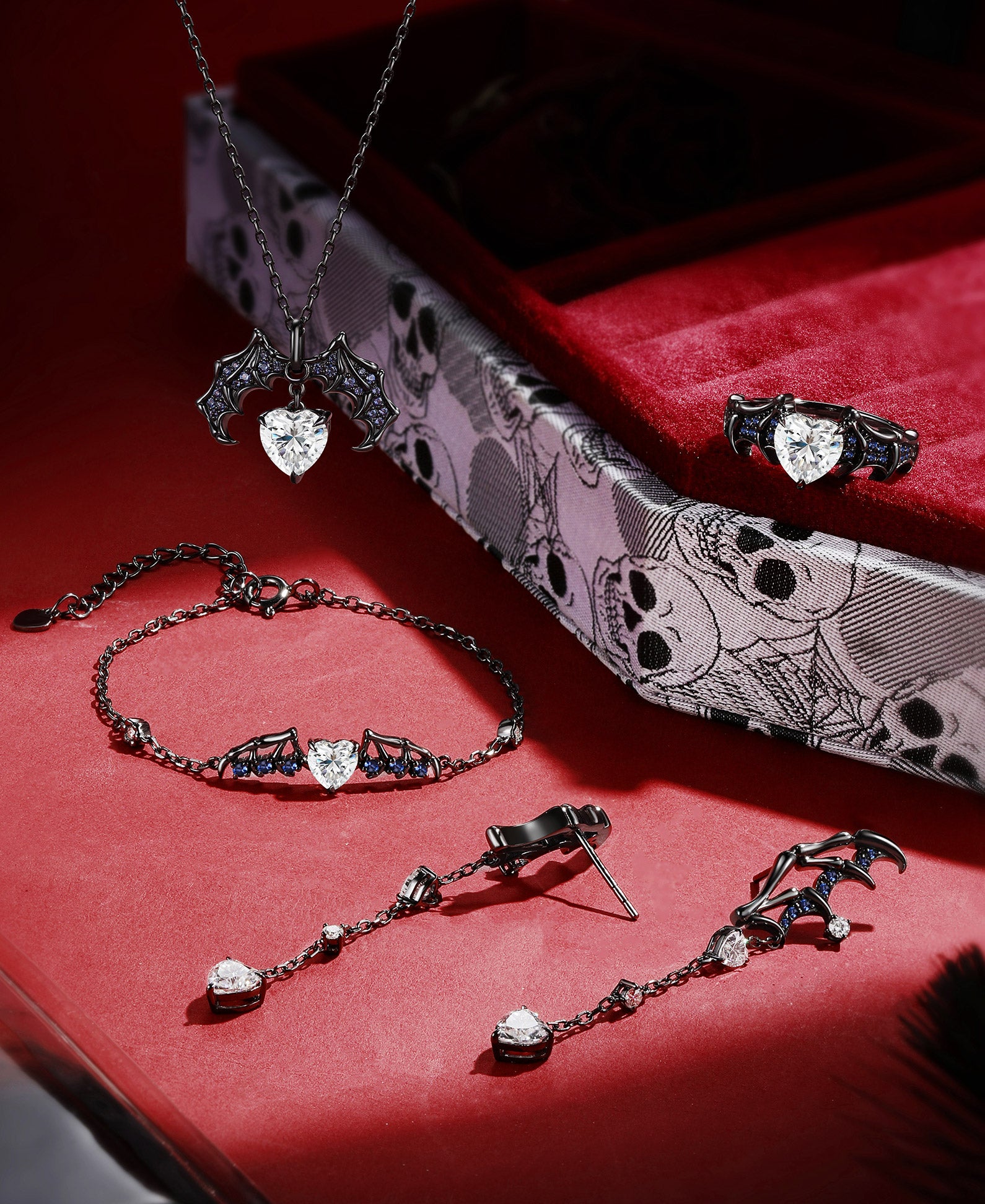 Heart Shaped Moissanite Gothic Inspired Black Gold Engagement Ring - Bat Ring