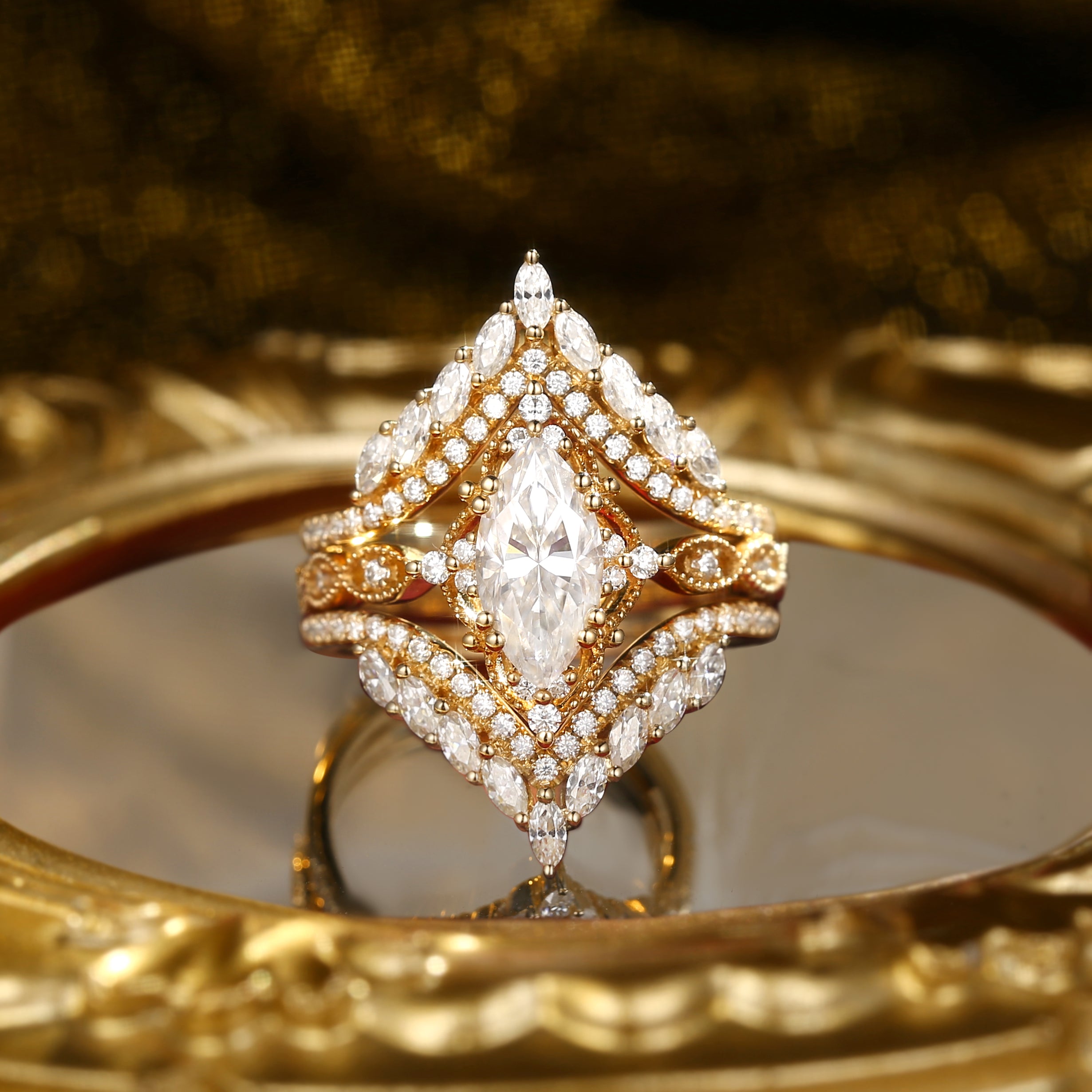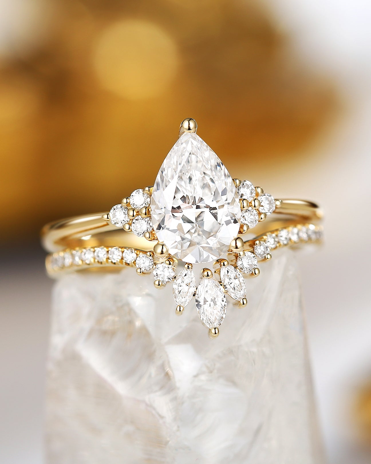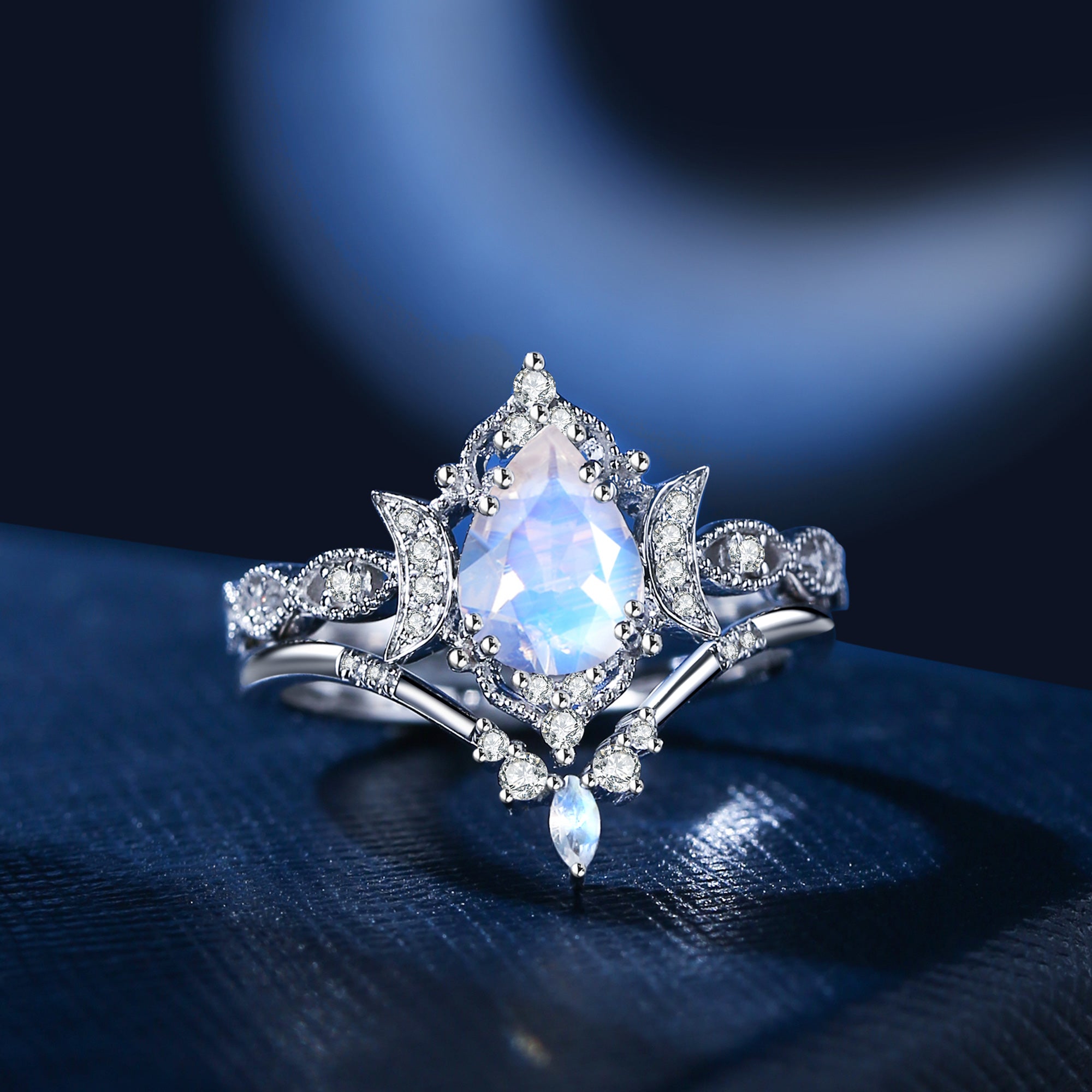 Crescent Moon | Pear Cut Moonstone Galaxy Engagement Ring Set 2PCS 18K
