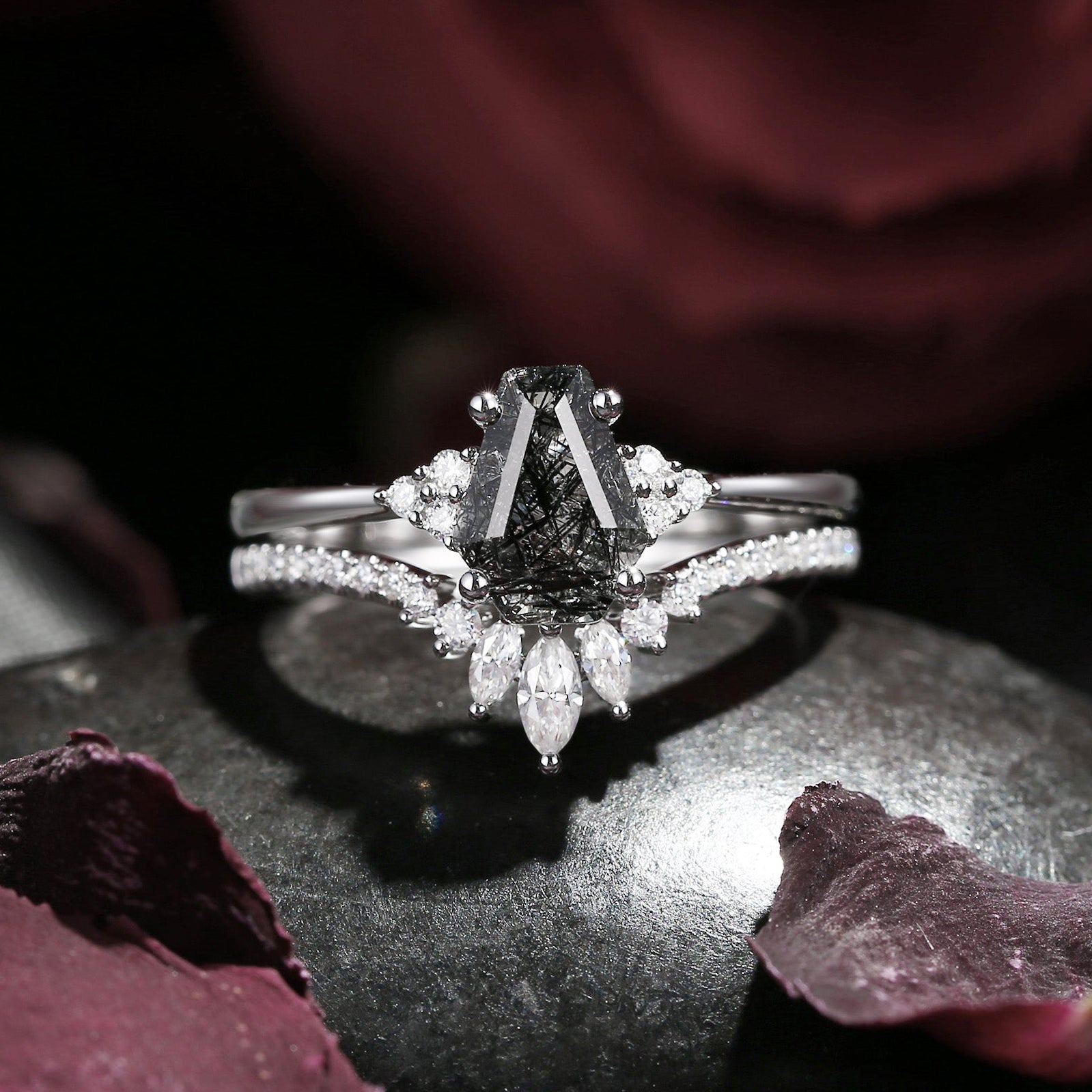Coffin Black Rutilated Quartz Engagement Ring 2PCS - White Dress