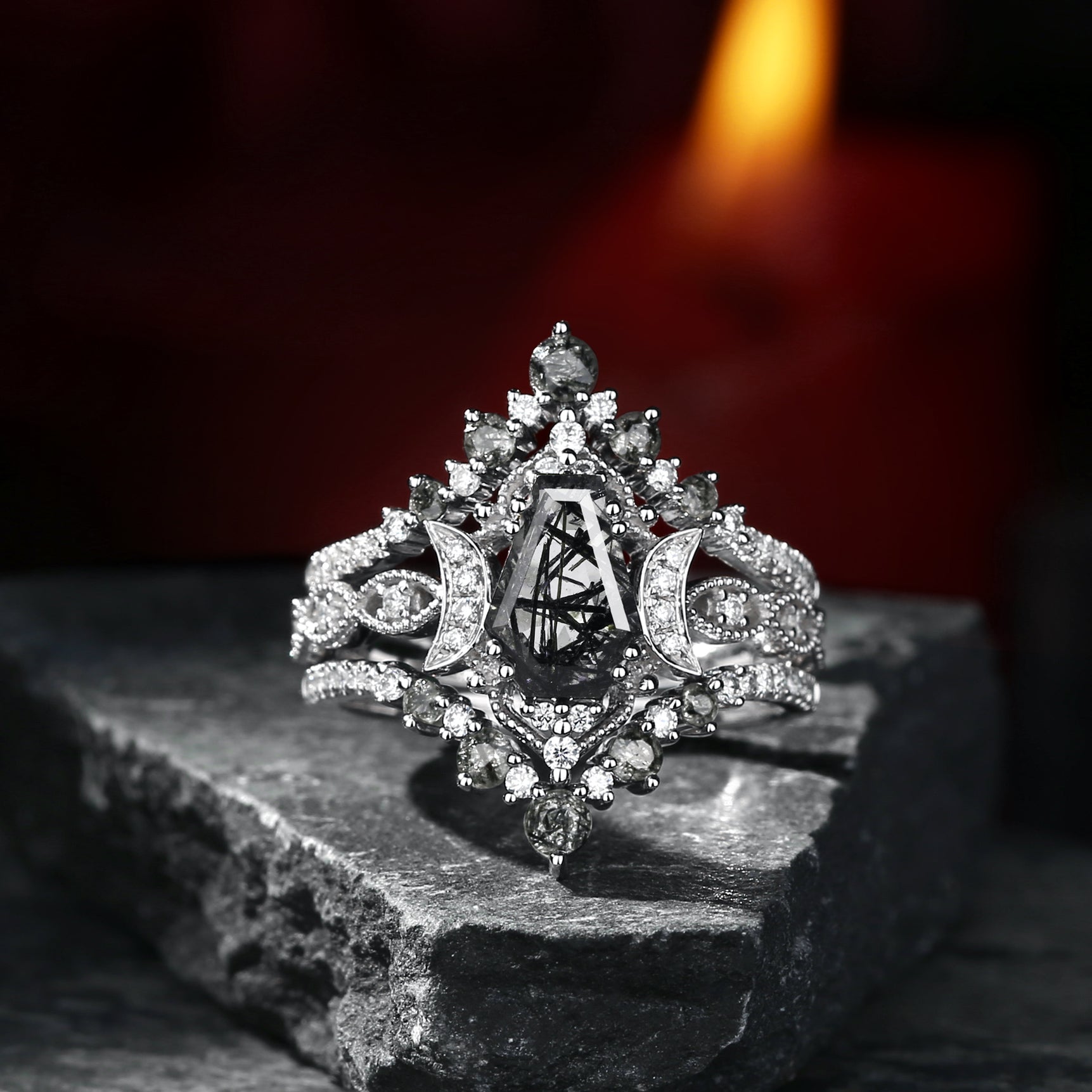 Crescent Moon | Hexagon Salt and Pepper Diamond Engagement Ring Set 2pcs