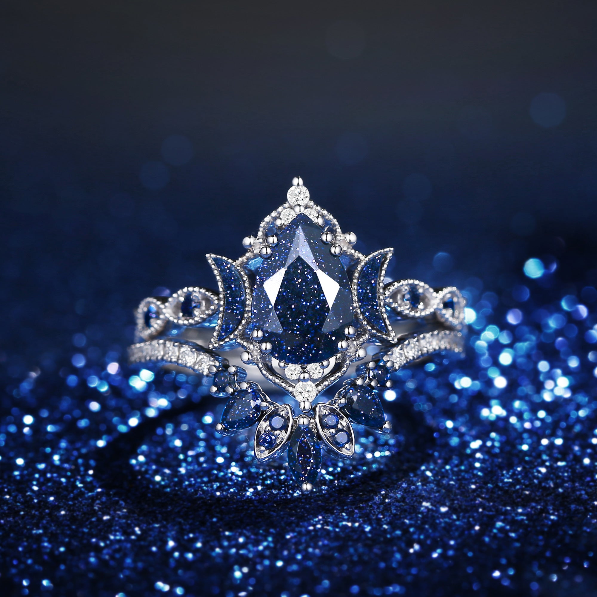Crescent Moon | Pear Cut Blue Sandstone 'Ultra Galaxy' Engagement Ring Set 2pcs