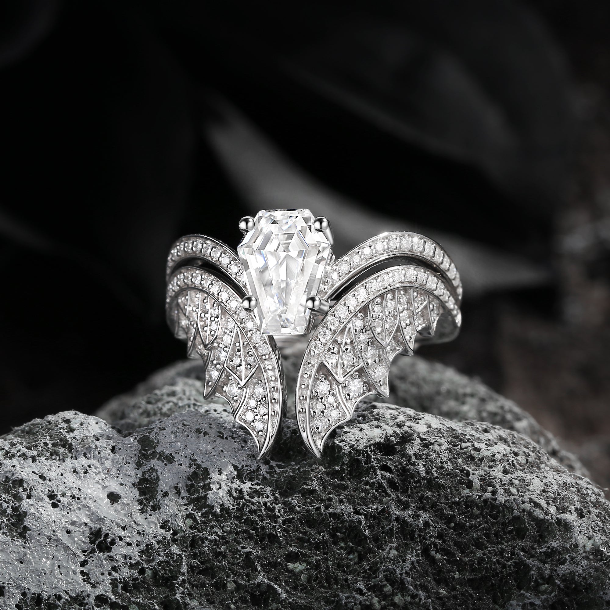 Coffin Cut Moissanite Vintage White Gold Bridal Set 2pcs - Bat Ring
