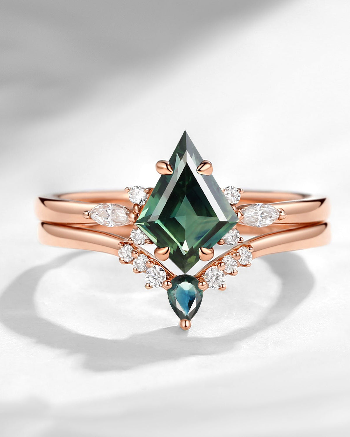 18K Kite Shaped Natural Teal Sapphire Engagement Ring Set 2pcs