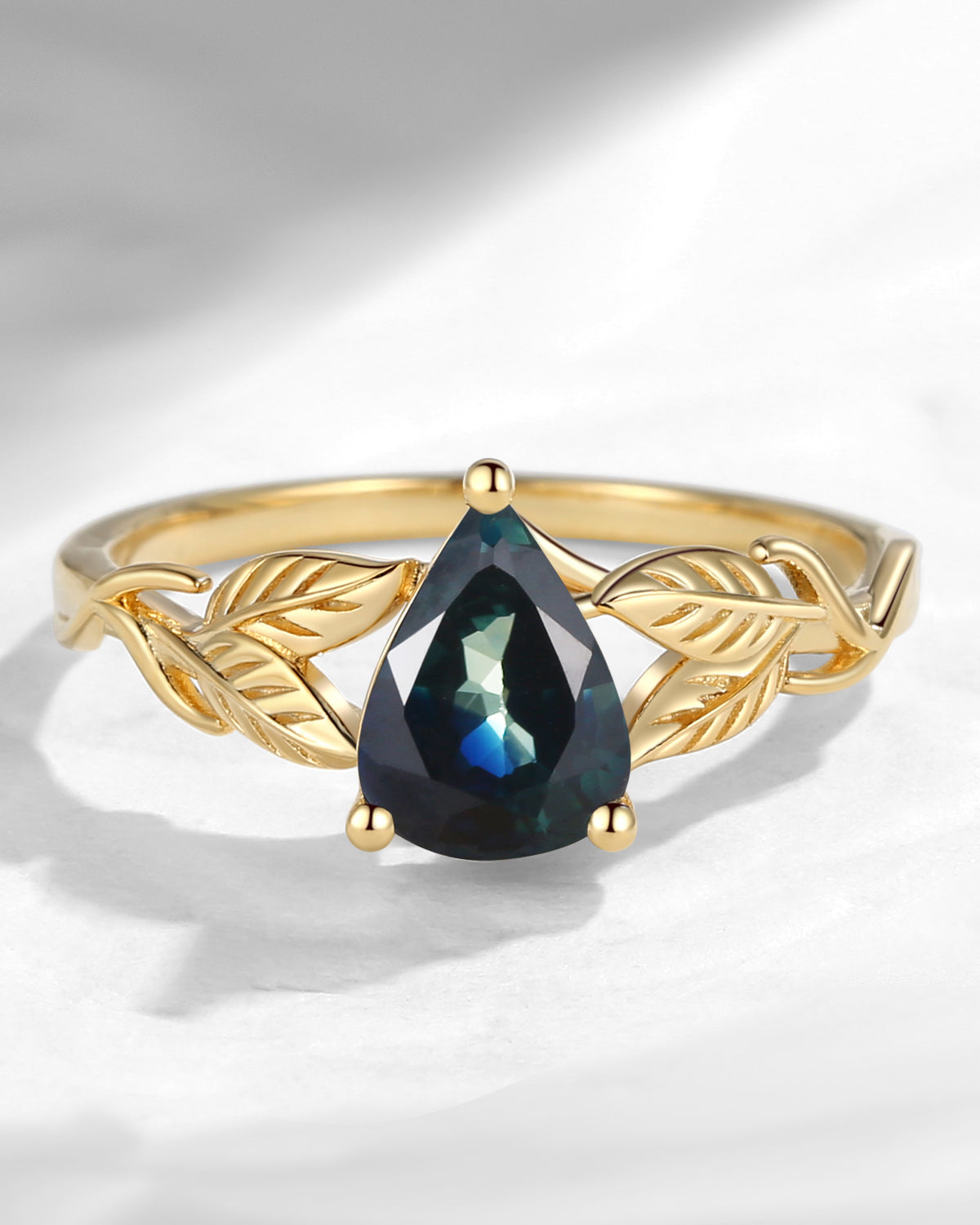 Nature Inspired Pear Shaped Natural Teal Sapphire Halo Leaf Engagement Ring