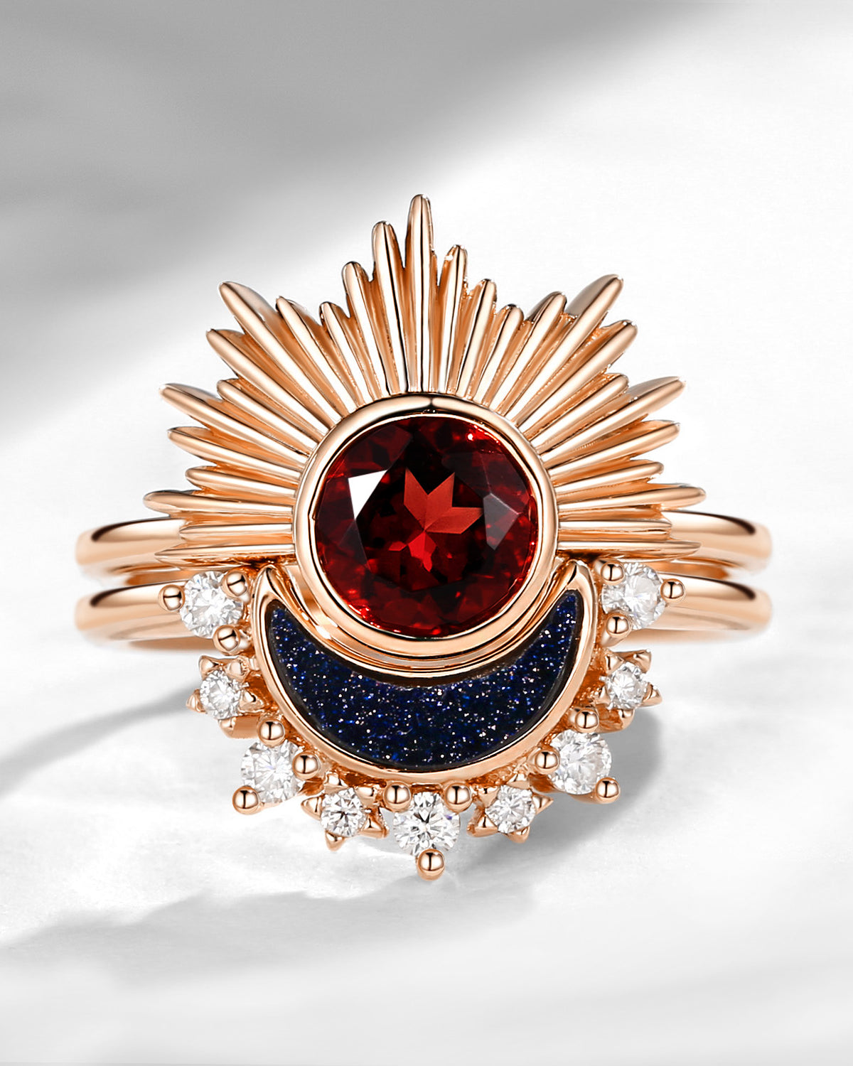Round Garnet Solitaire Retro Sun & Moon Engagement Ring Set 2pcs