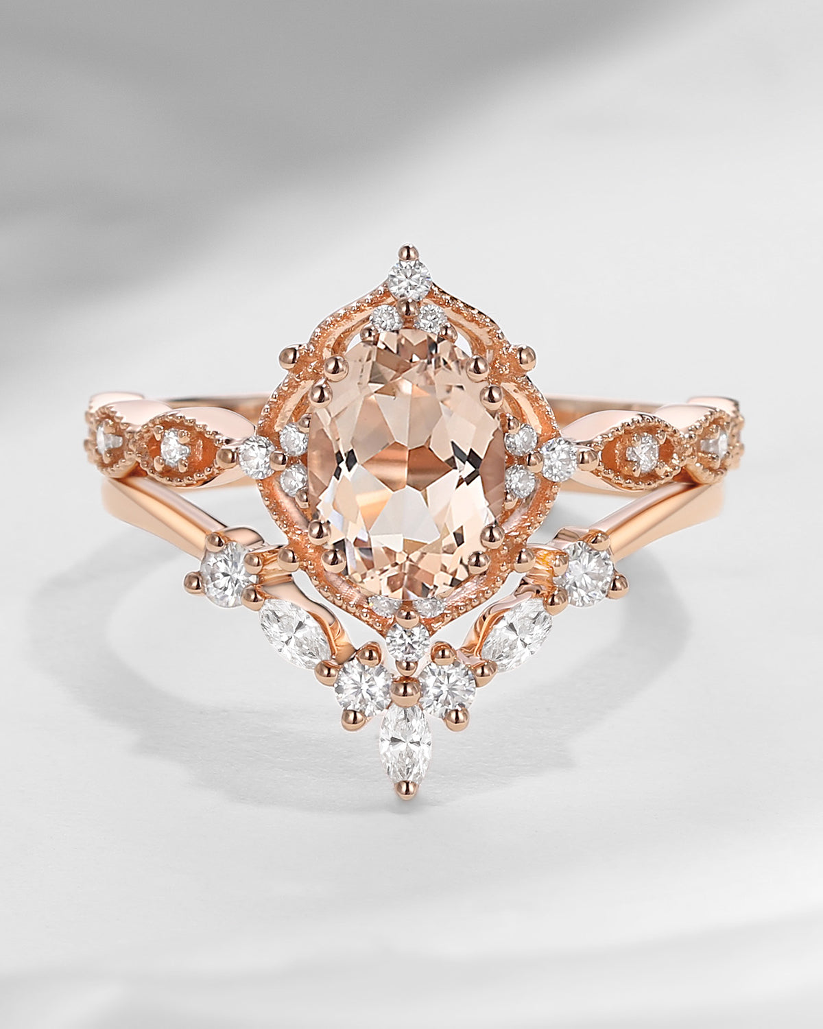 Oval Peach Morganite Engagement Ring Set 2PCS