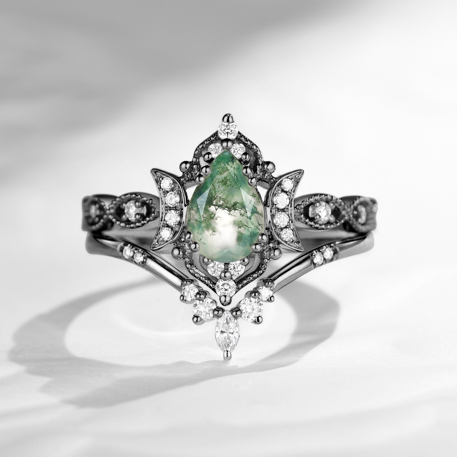 Crescent Moon | Pear Cut Moss Agate 'Ultra Galaxy' Engagement Ring Set 2pcs