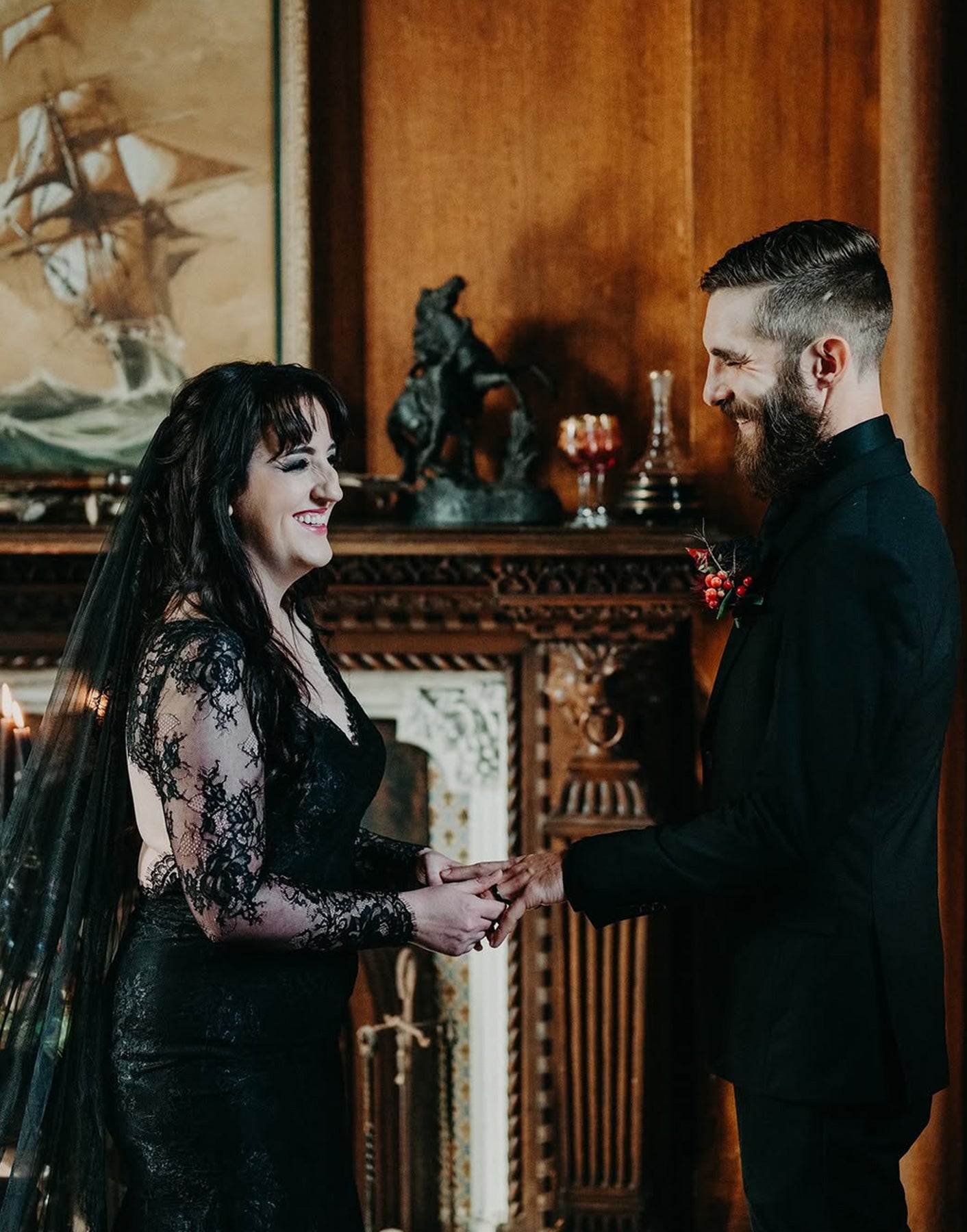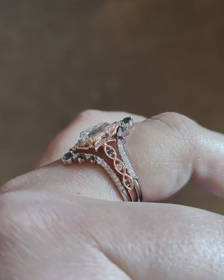 Crescent Moon | Coffin Cut Black Rutilated Quartz & Black Moissanite Engagement Ring Set 2pcs