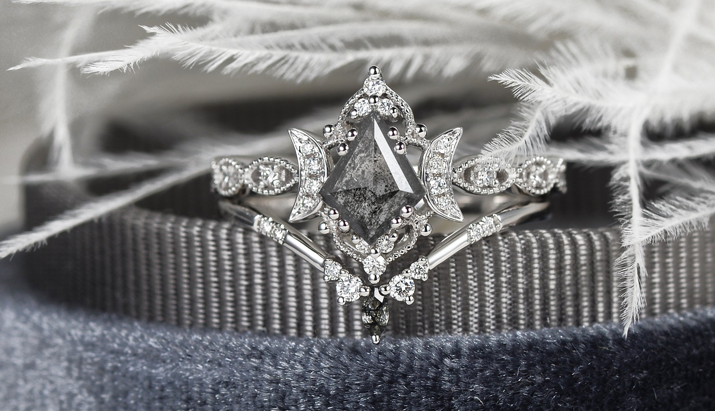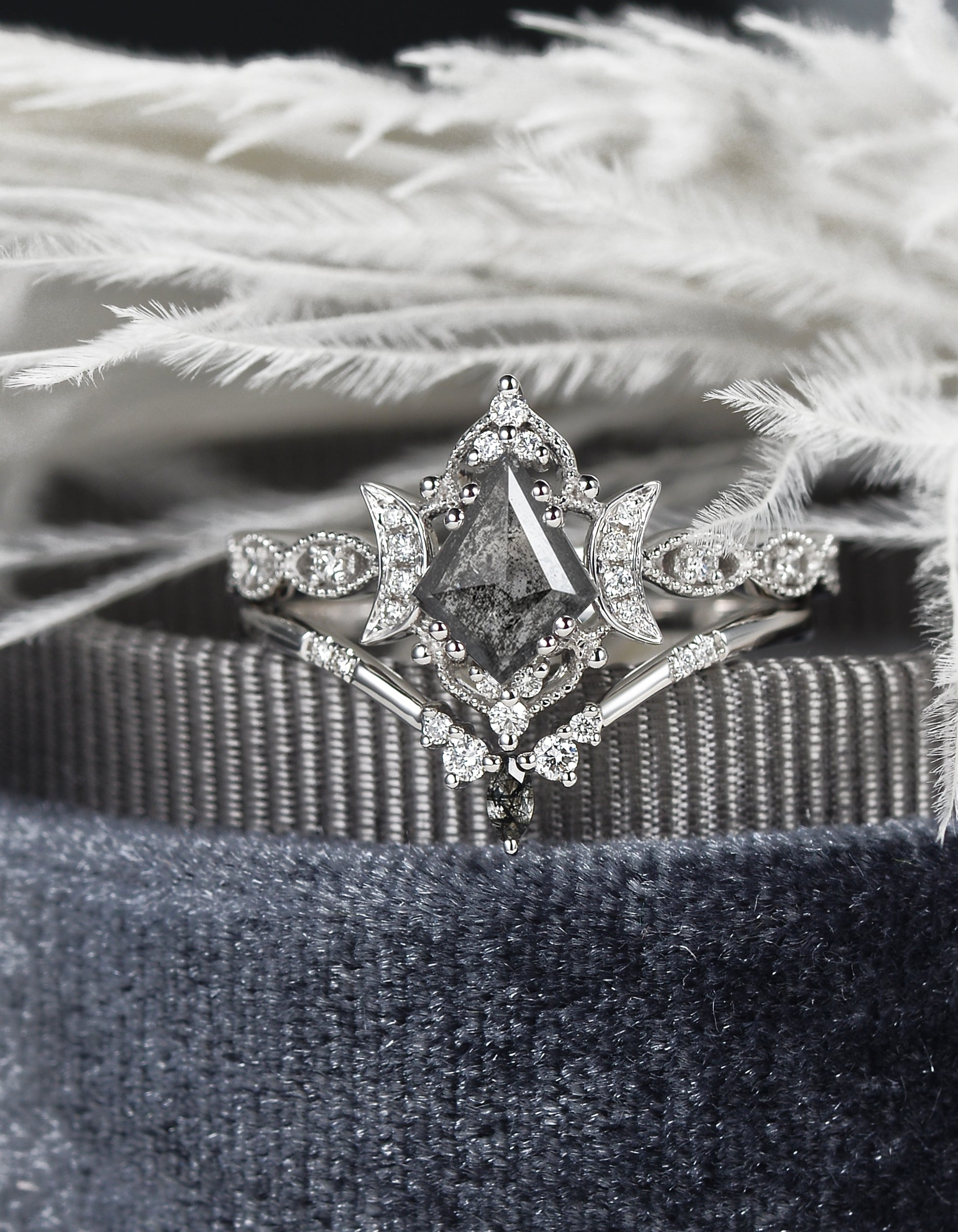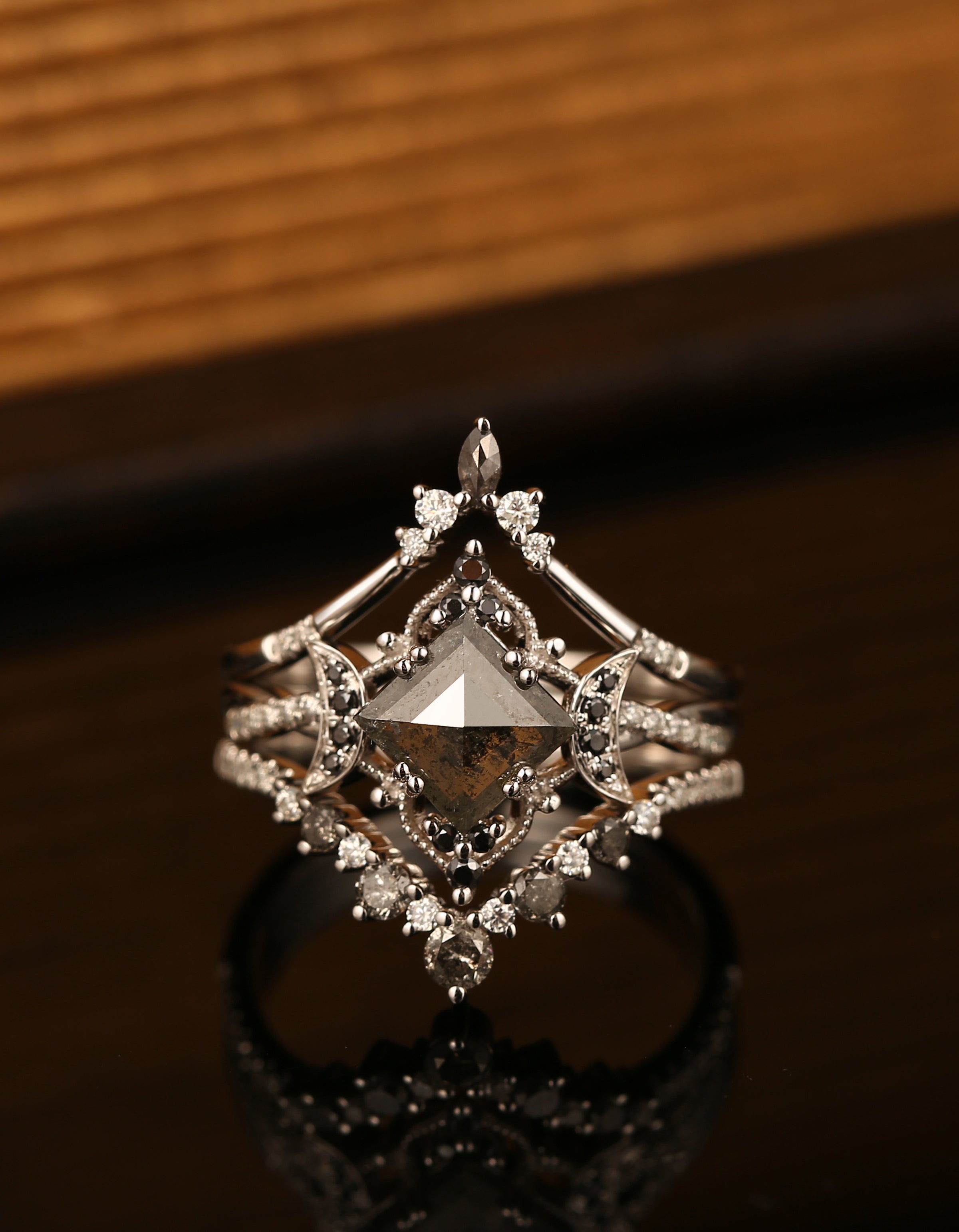 Crescent Moon | Kite Cut Salt and Pepper Diamond 'Noir' Engagement Ring Set 3pcs