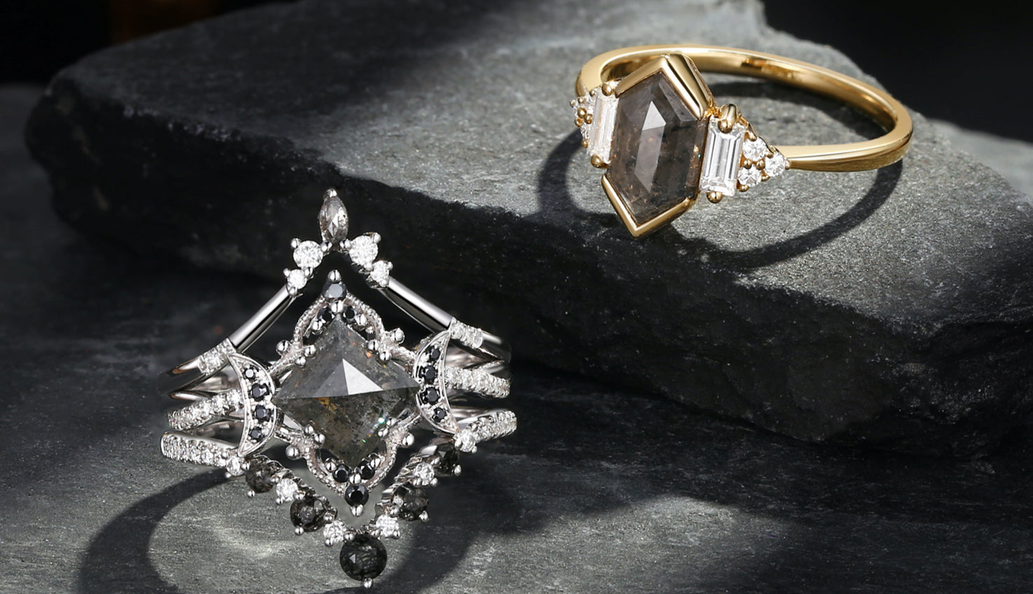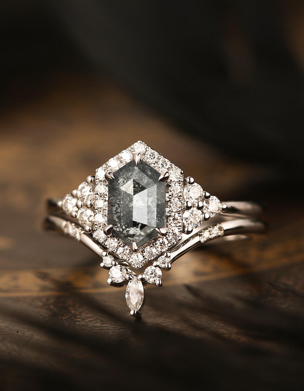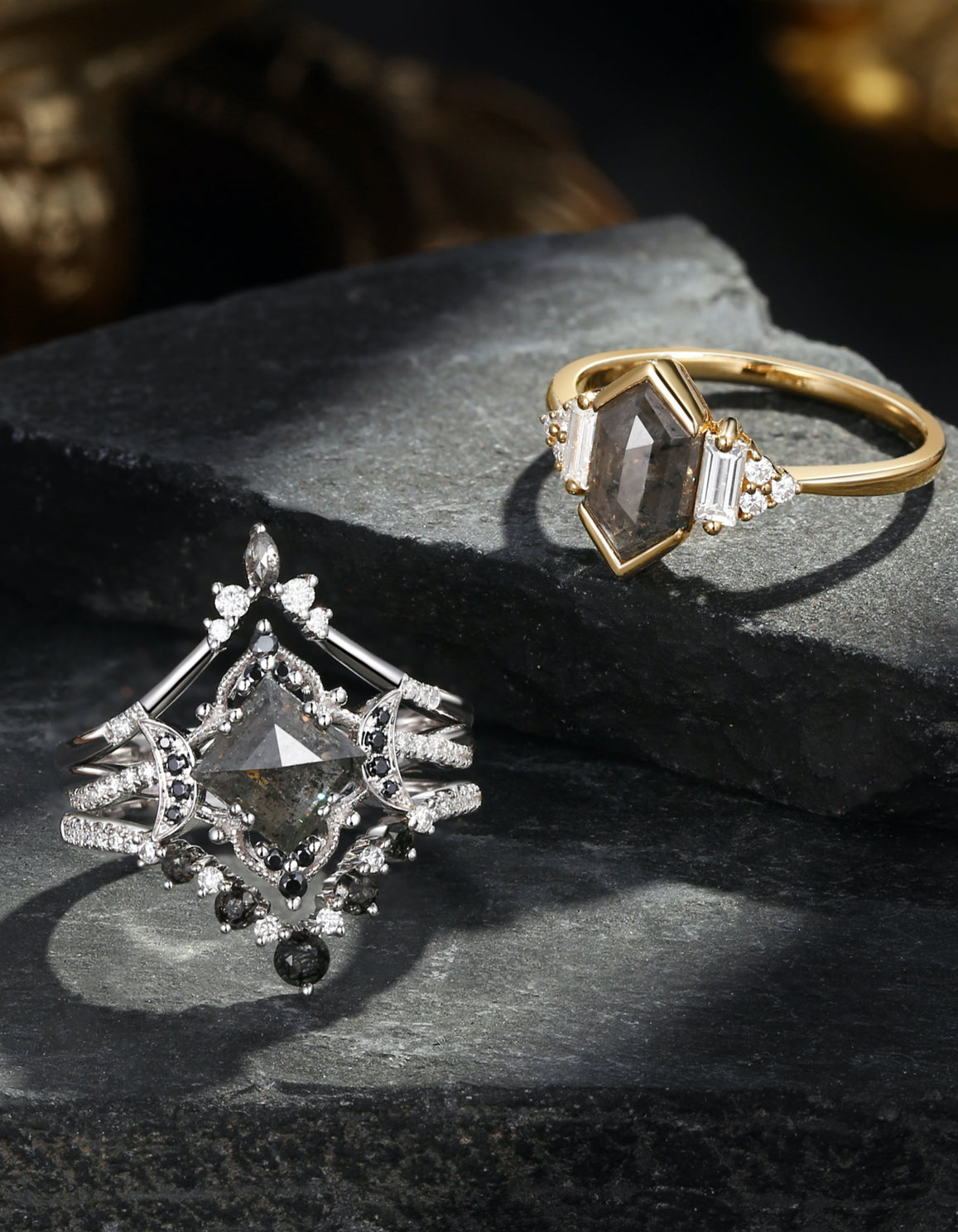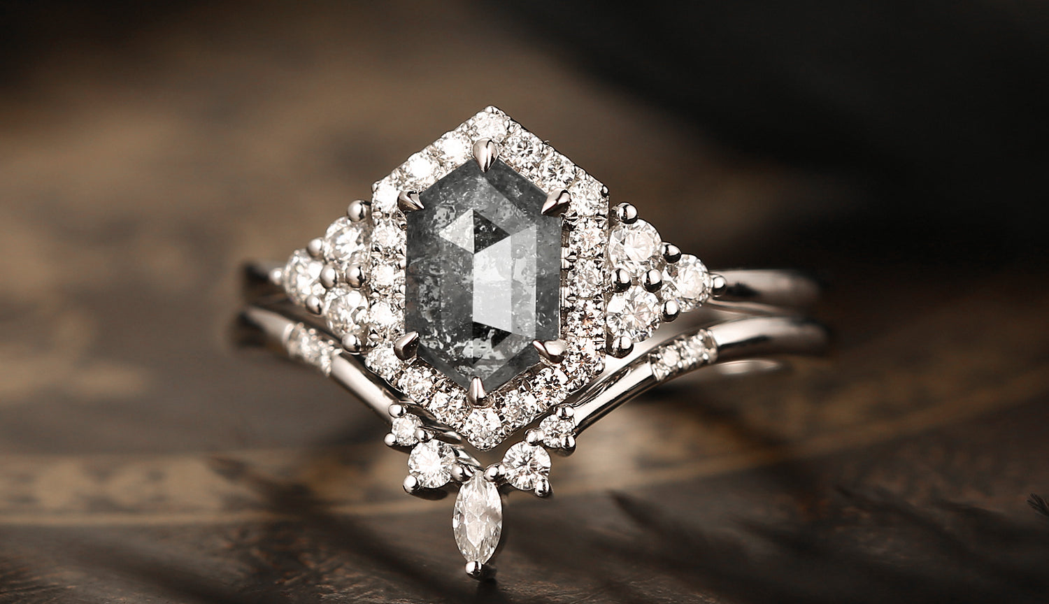 Crescent Moon | Hexagon Salt and Pepper Diamond Engagement Ring Set 2pcs