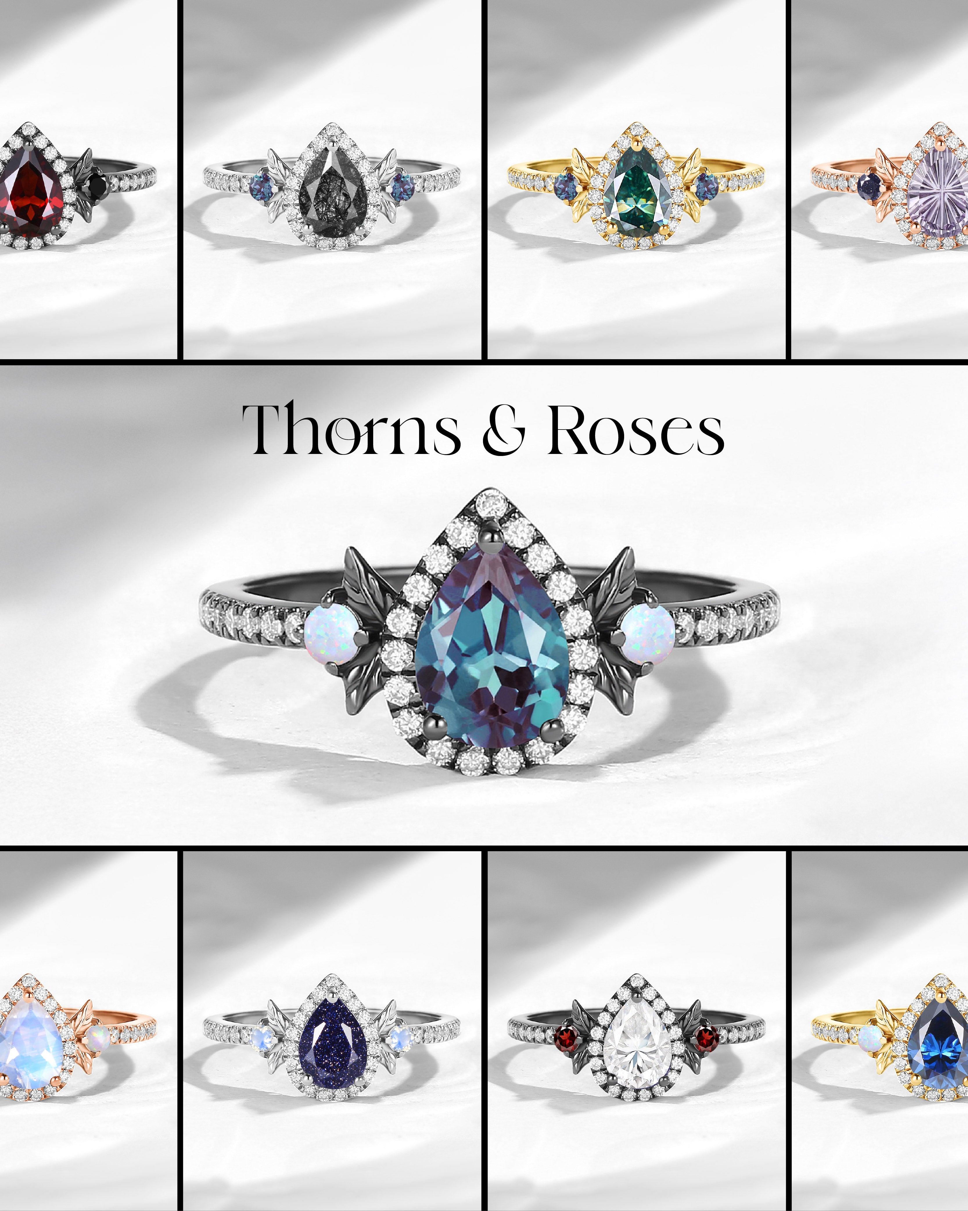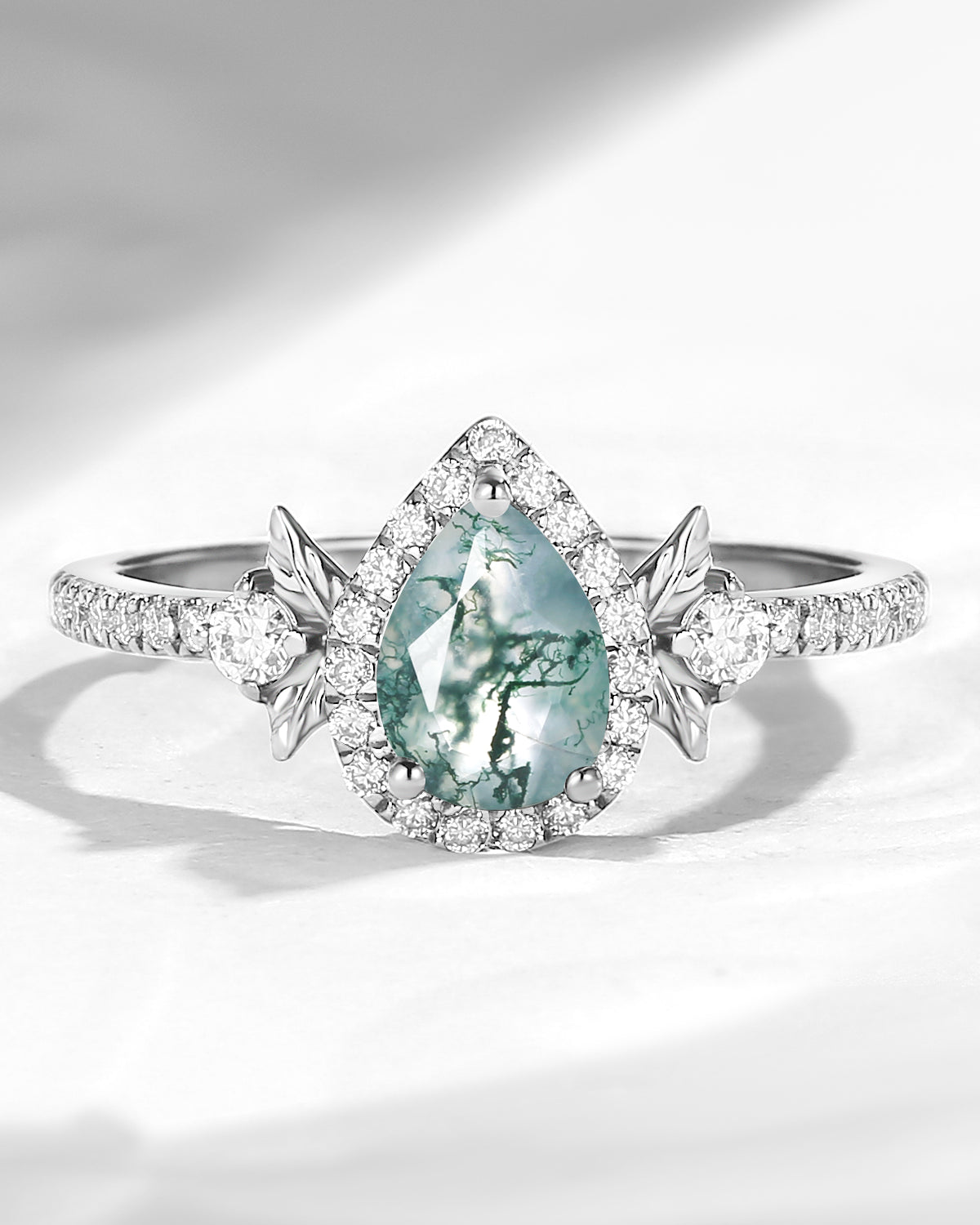 Nature Inspired Pear Cut Moss Agate 'Thorns & Roses' Halo Engagement Ring Set 2pcs