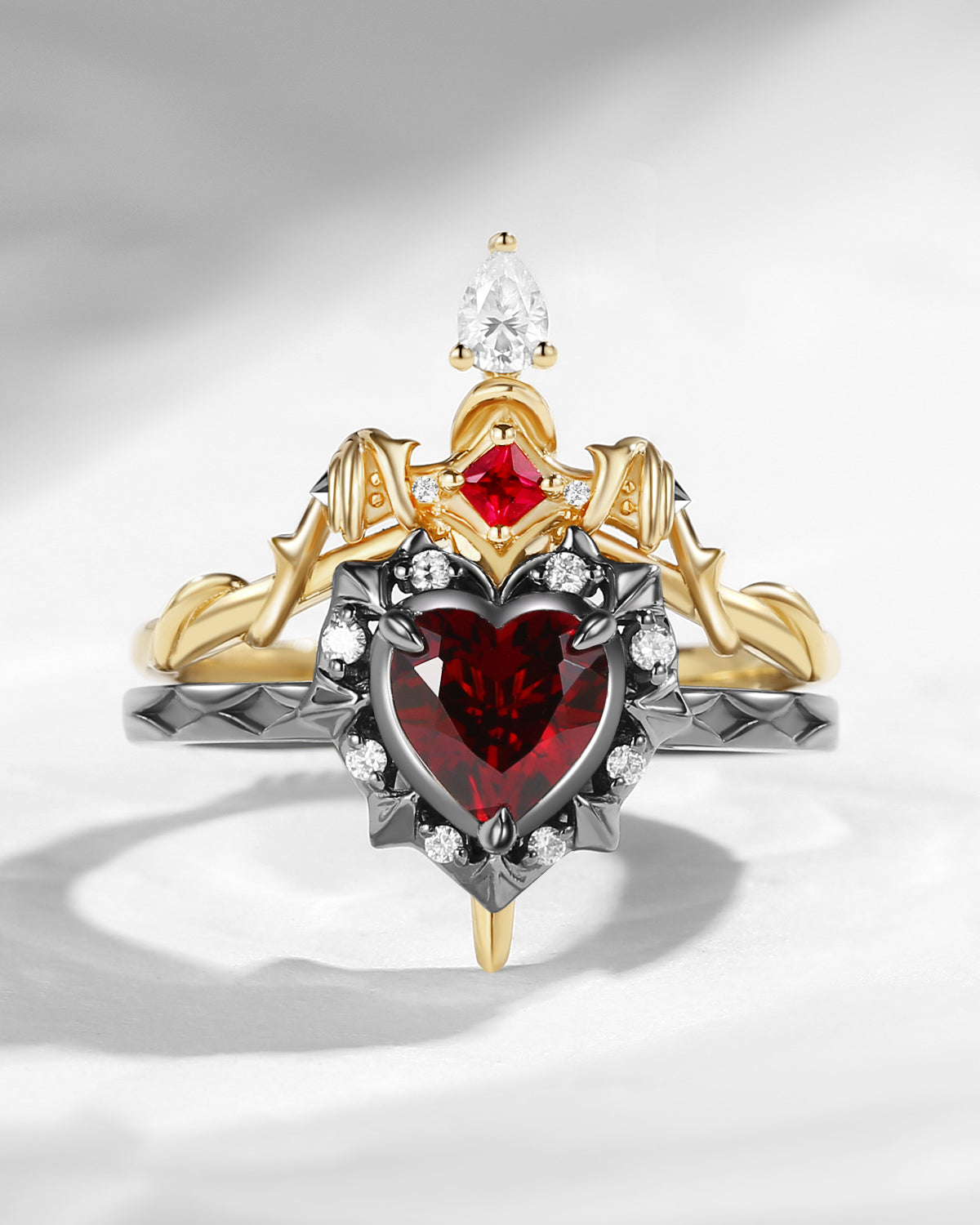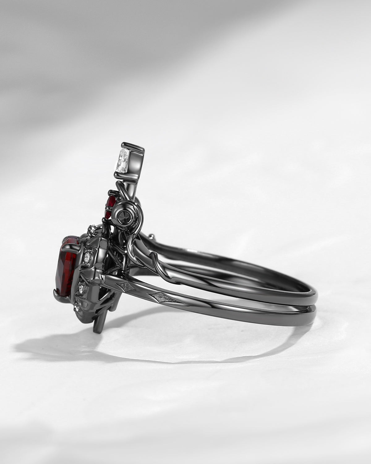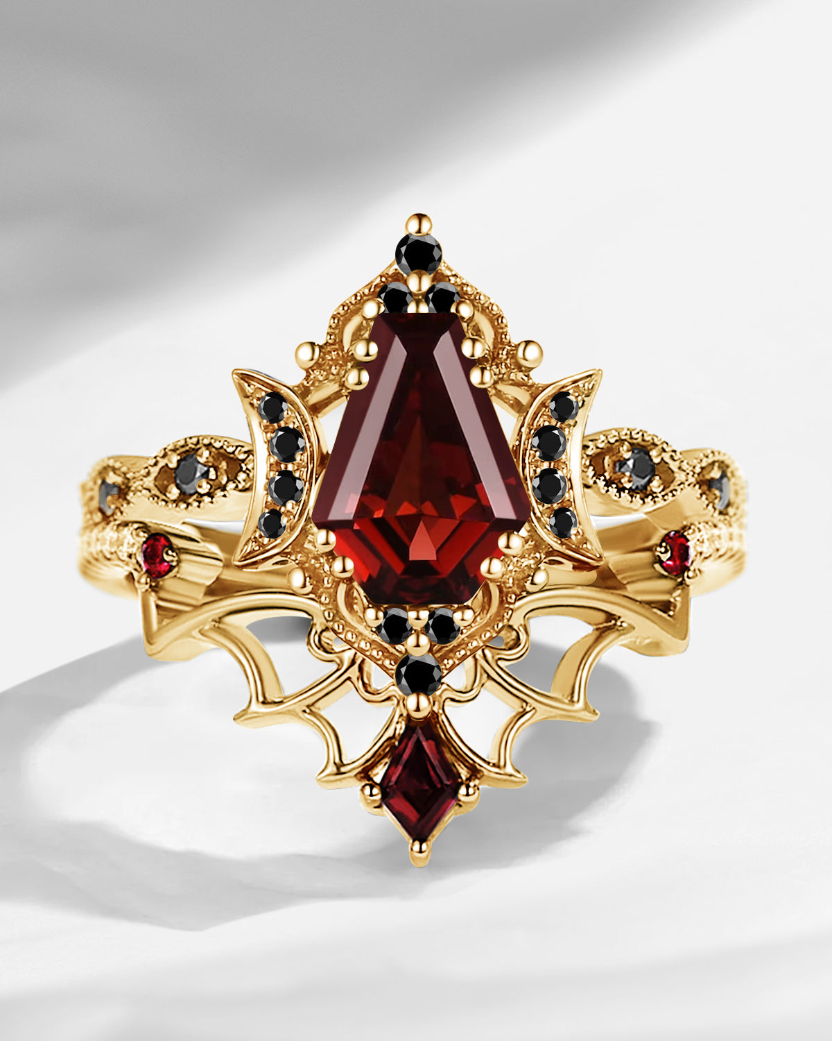 Gothic Inspired 'Dark Romance' Coffin Shaped Garnet Black Gold Engagement Ring Set 2pcs