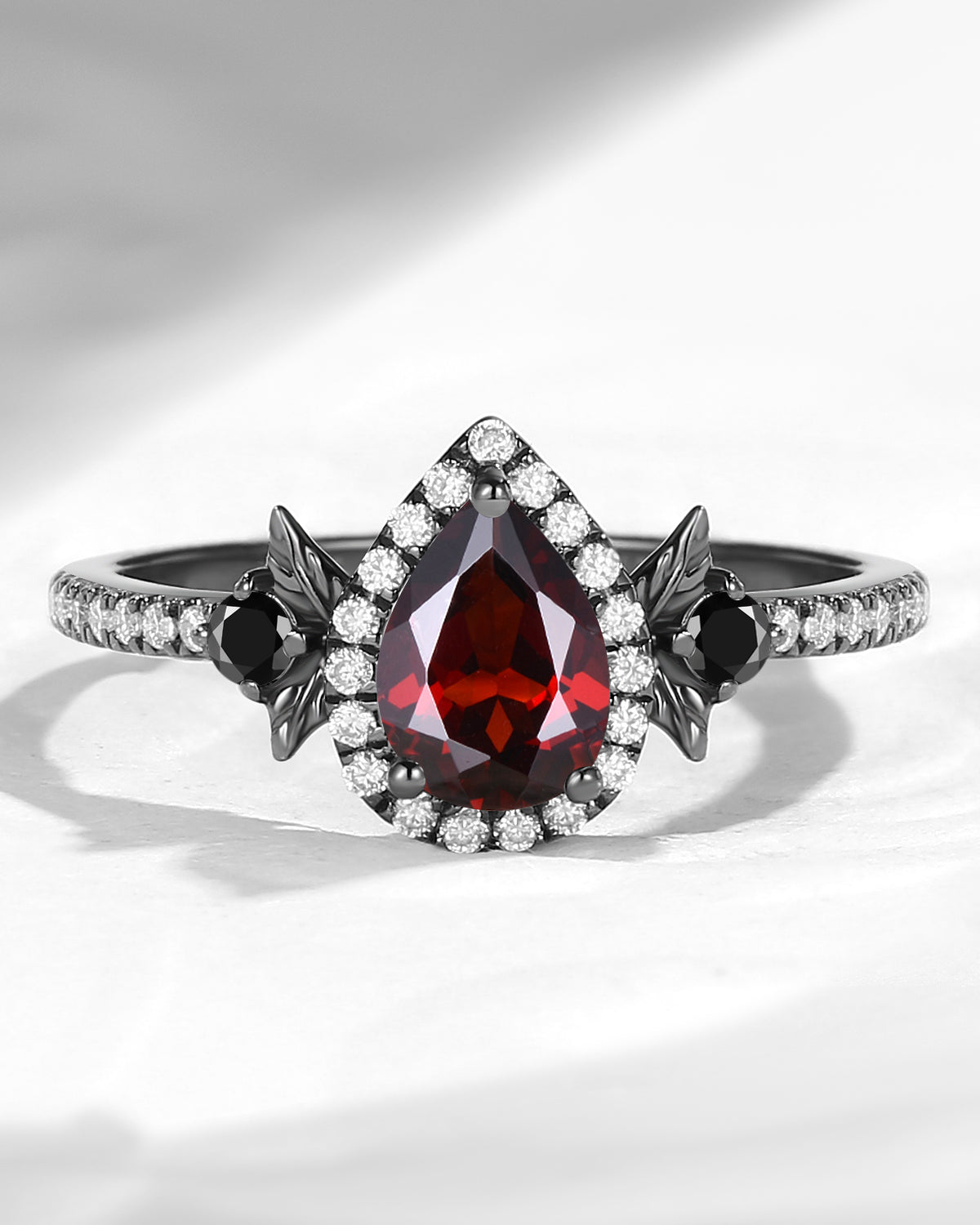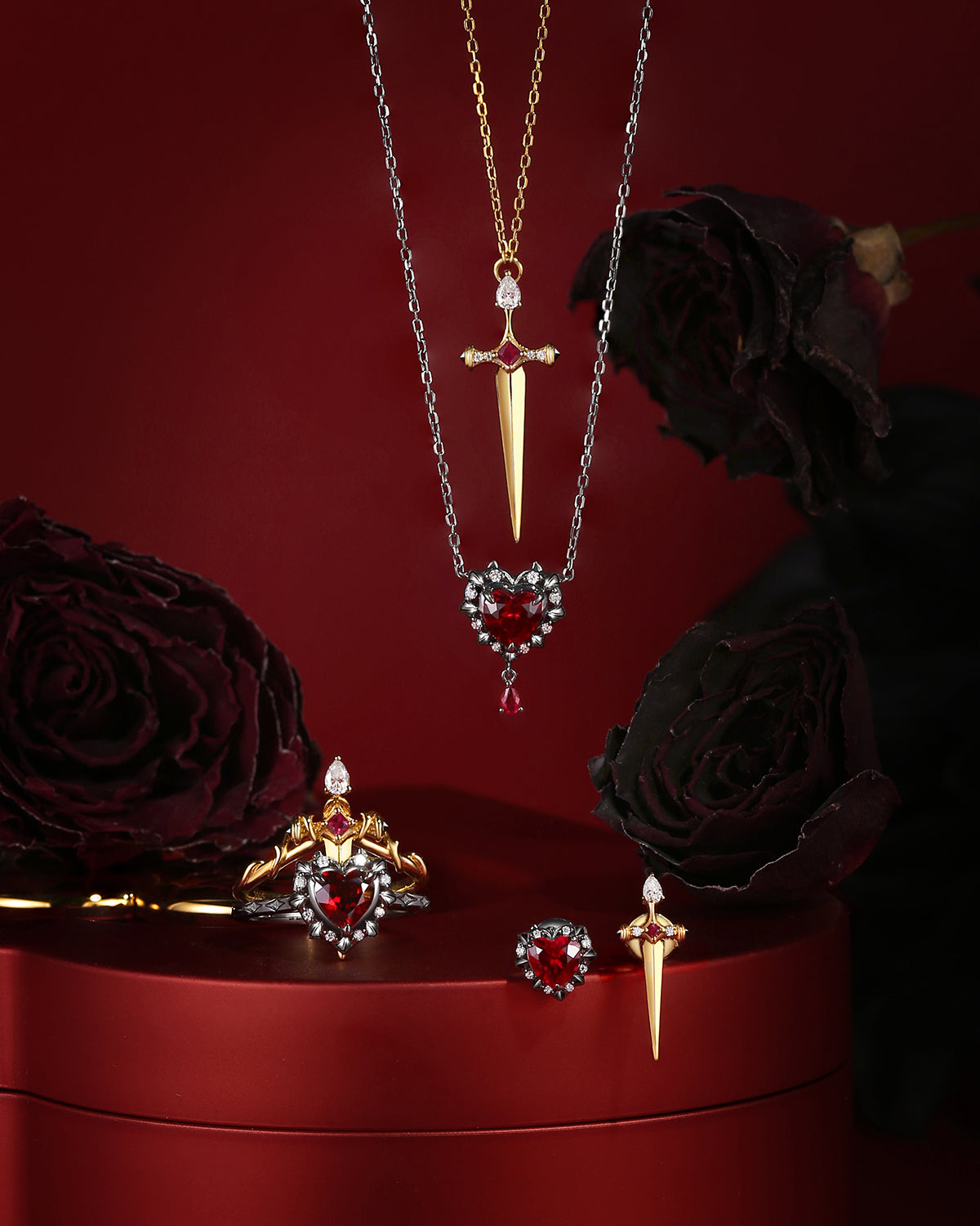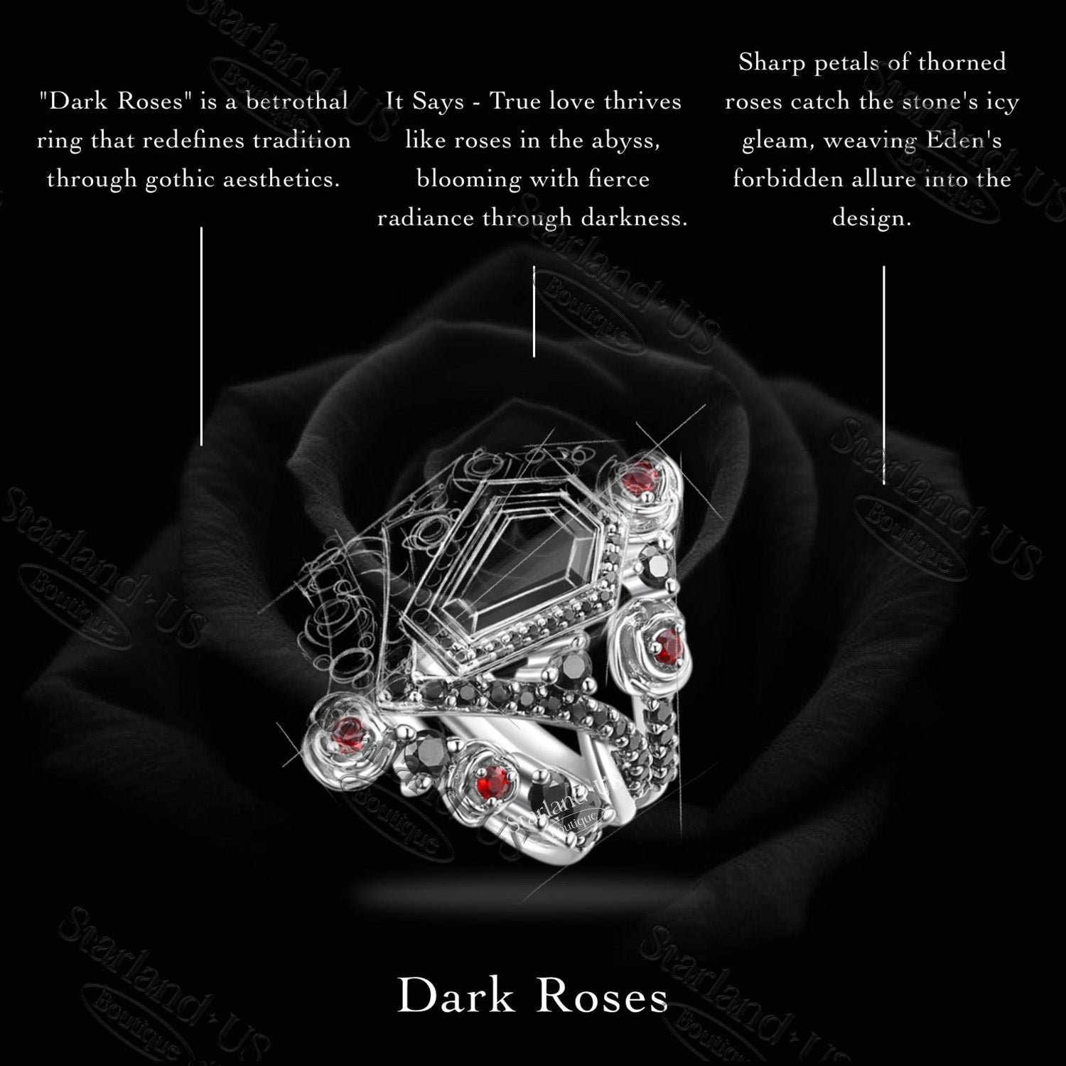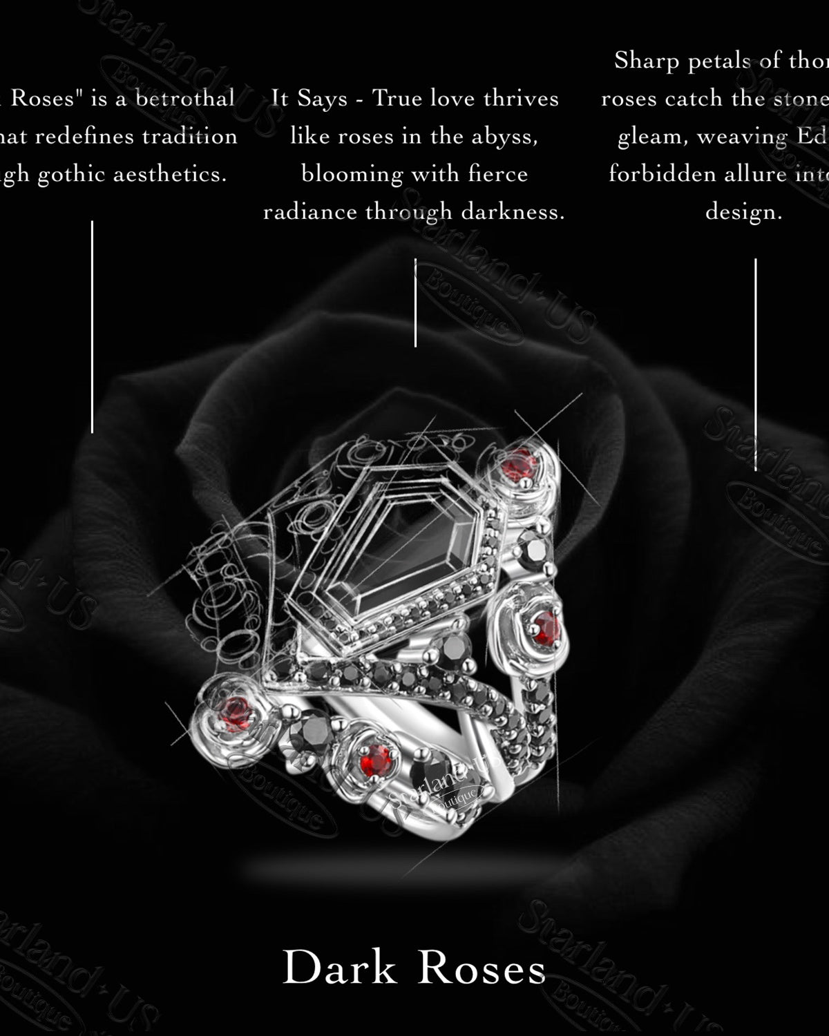Gothic Inspired 'Dark Romance' Coffin Shaped Garnet Black Gold Engagement Ring Set 2pcs