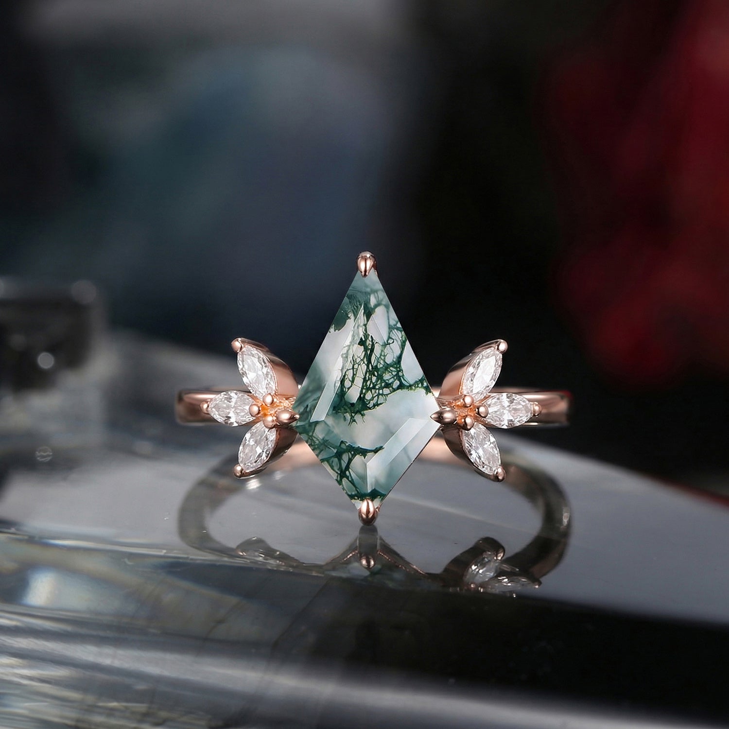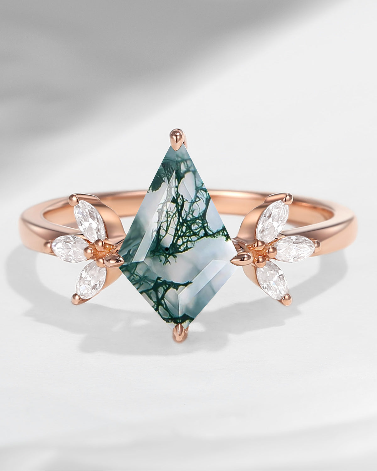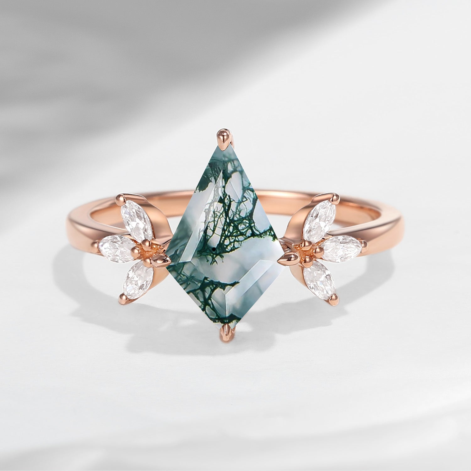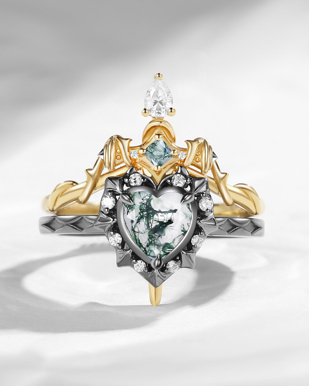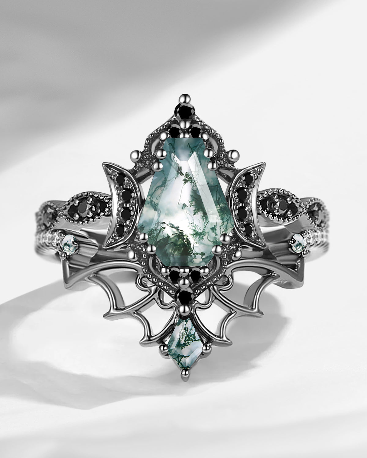 Half Moon Moss Agate + Coffin Cut Moissanite 'Tree of Life' Mushroom Engagement Ring Set 2pcs