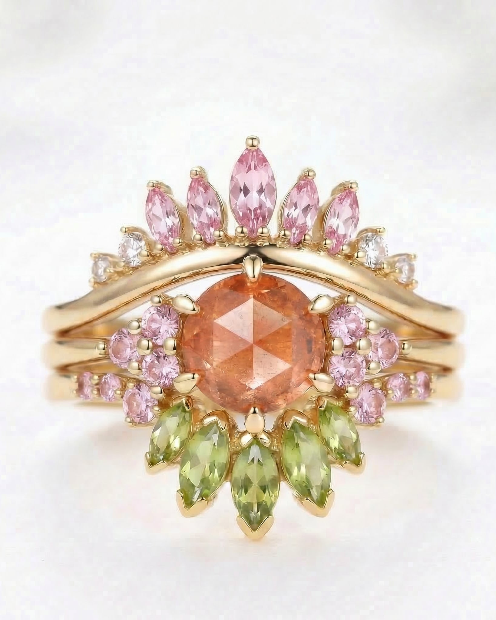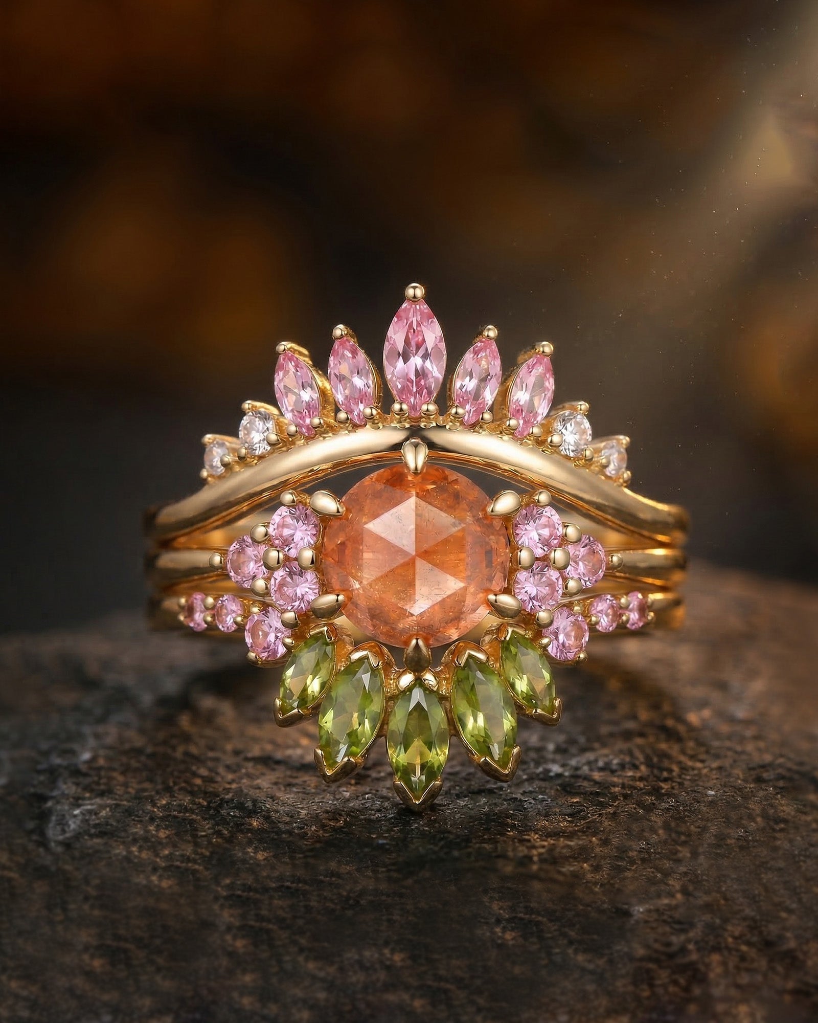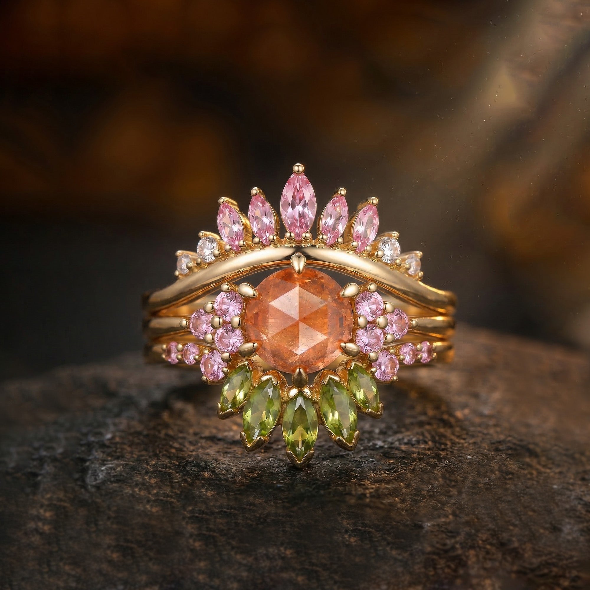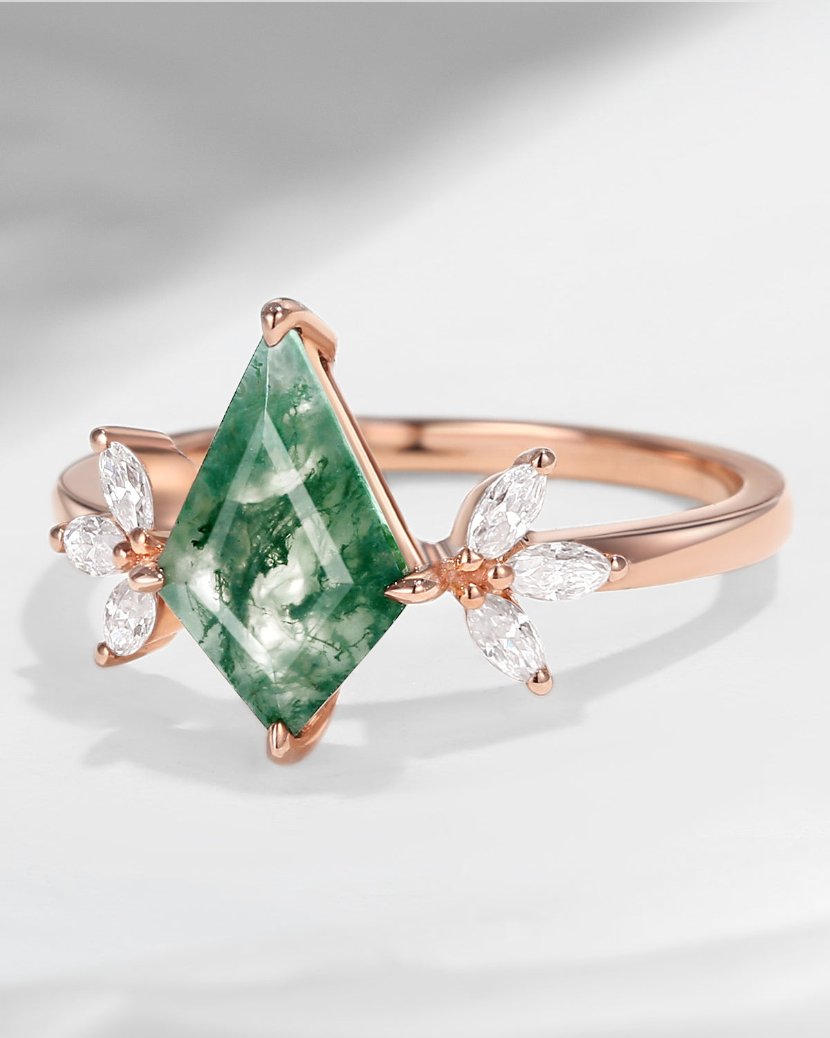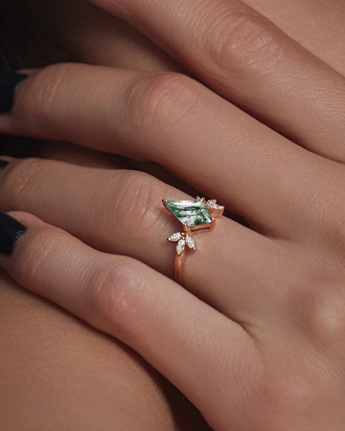 Half Moon Moss Agate + Coffin Cut Moissanite 'Tree of Life' Mushroom Engagement Ring Set 2pcs