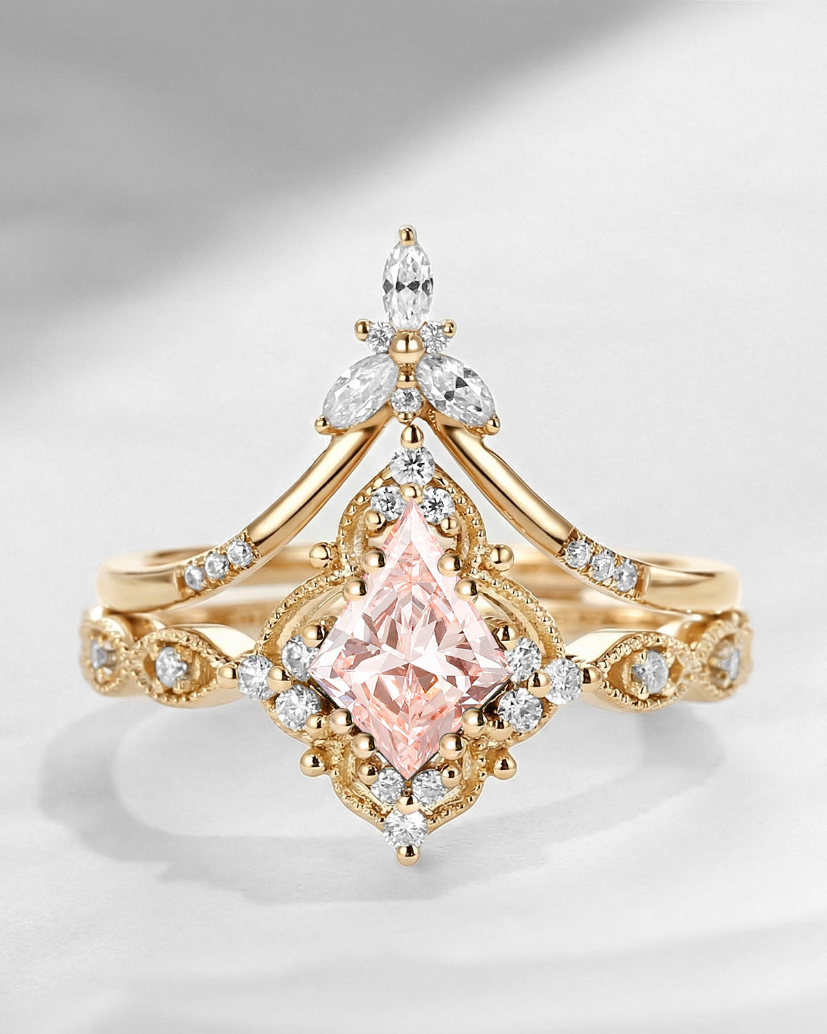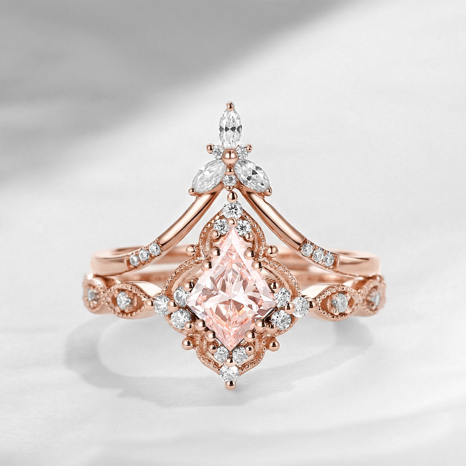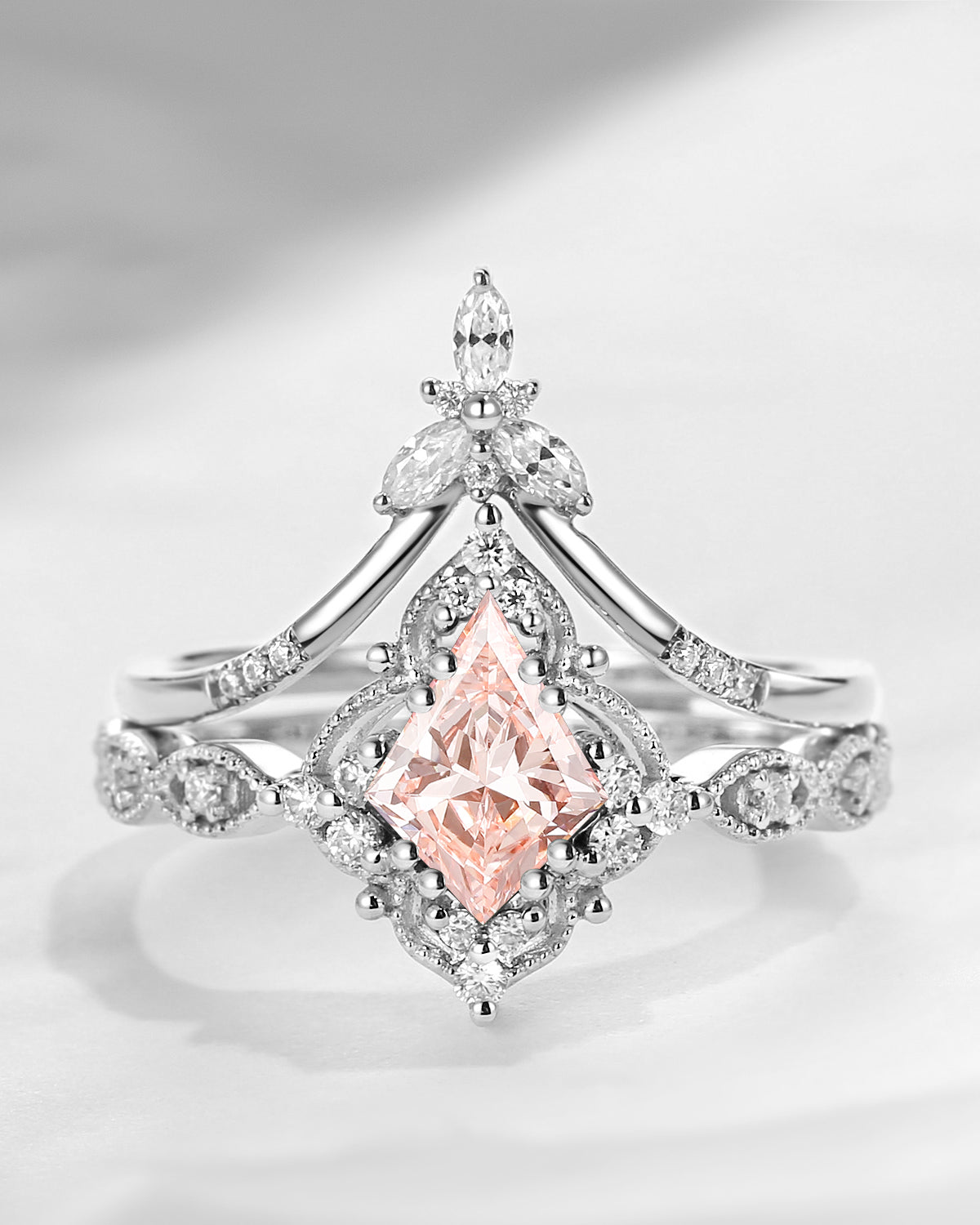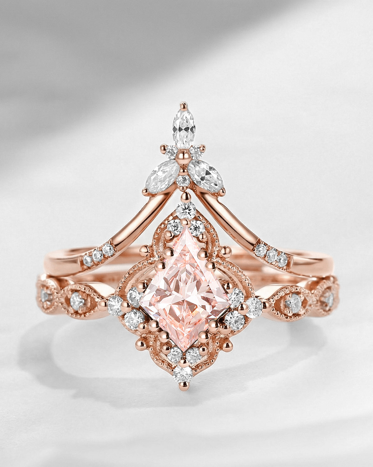 Vintage Inspired Kite Cut Lab Pink Diamond Milgrain Engagement Ring Set 2pcs