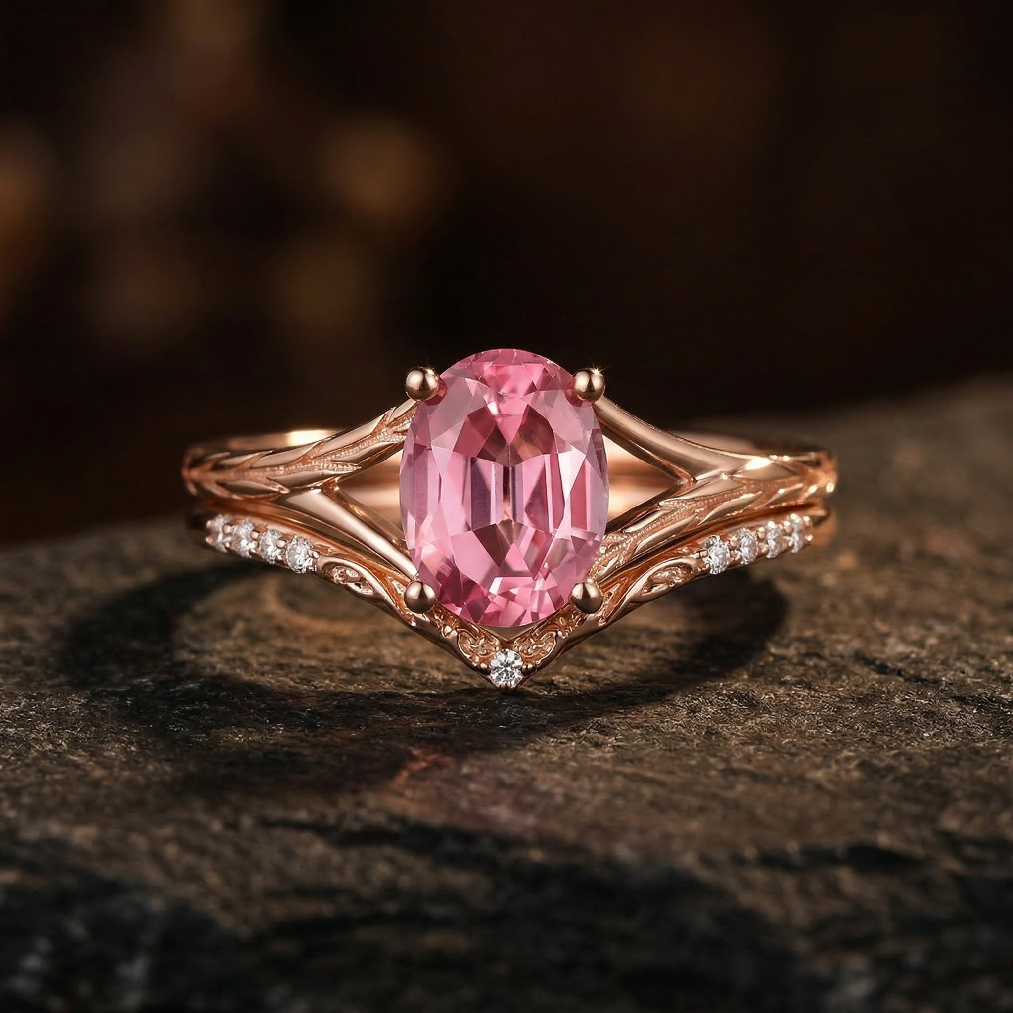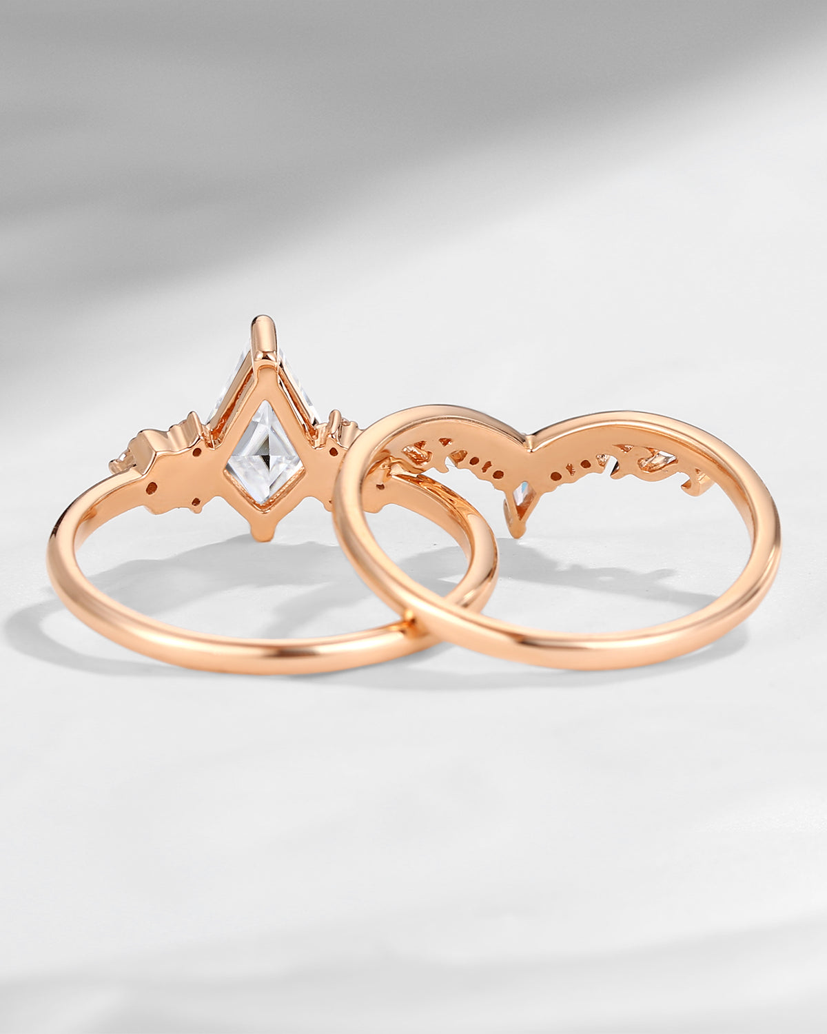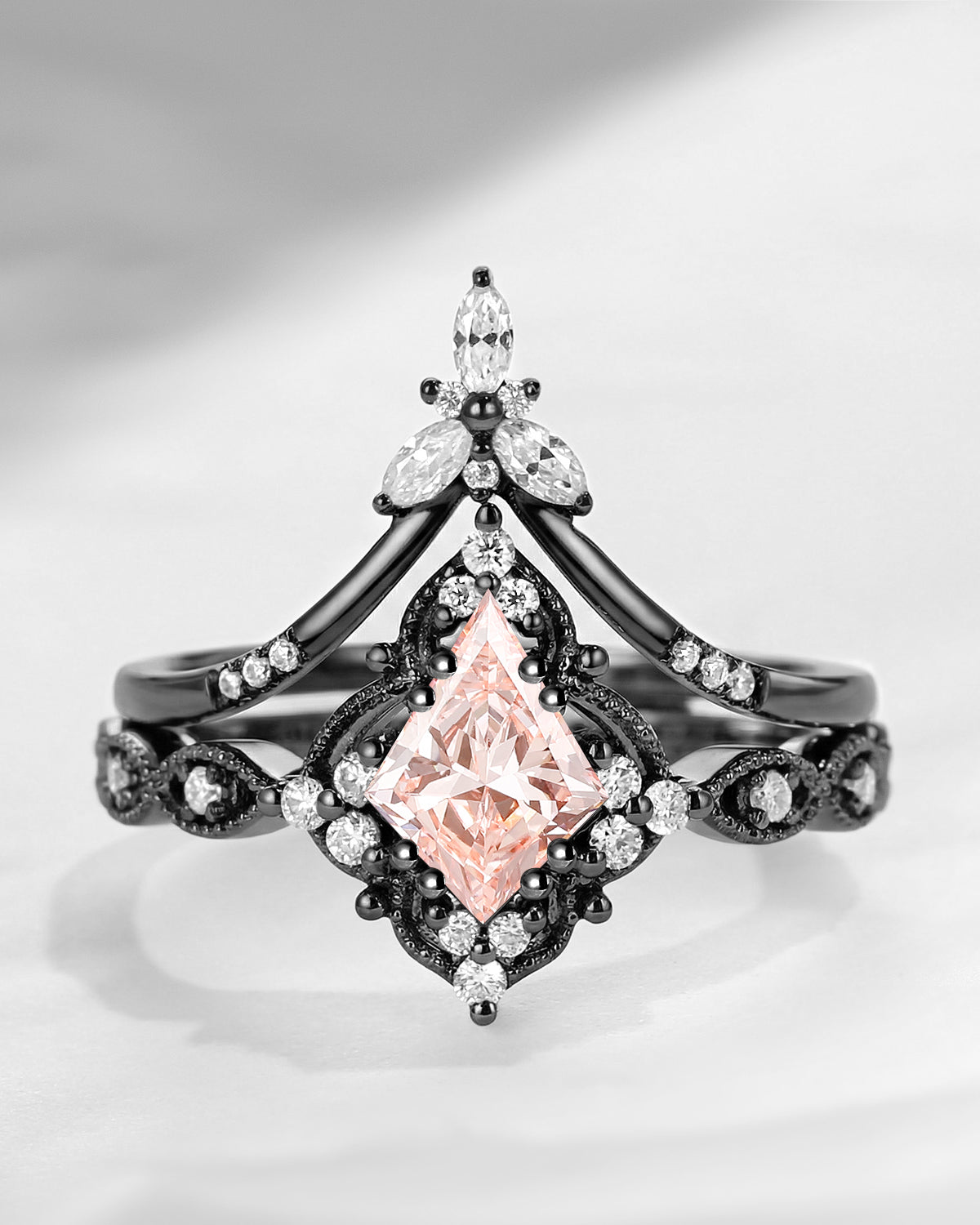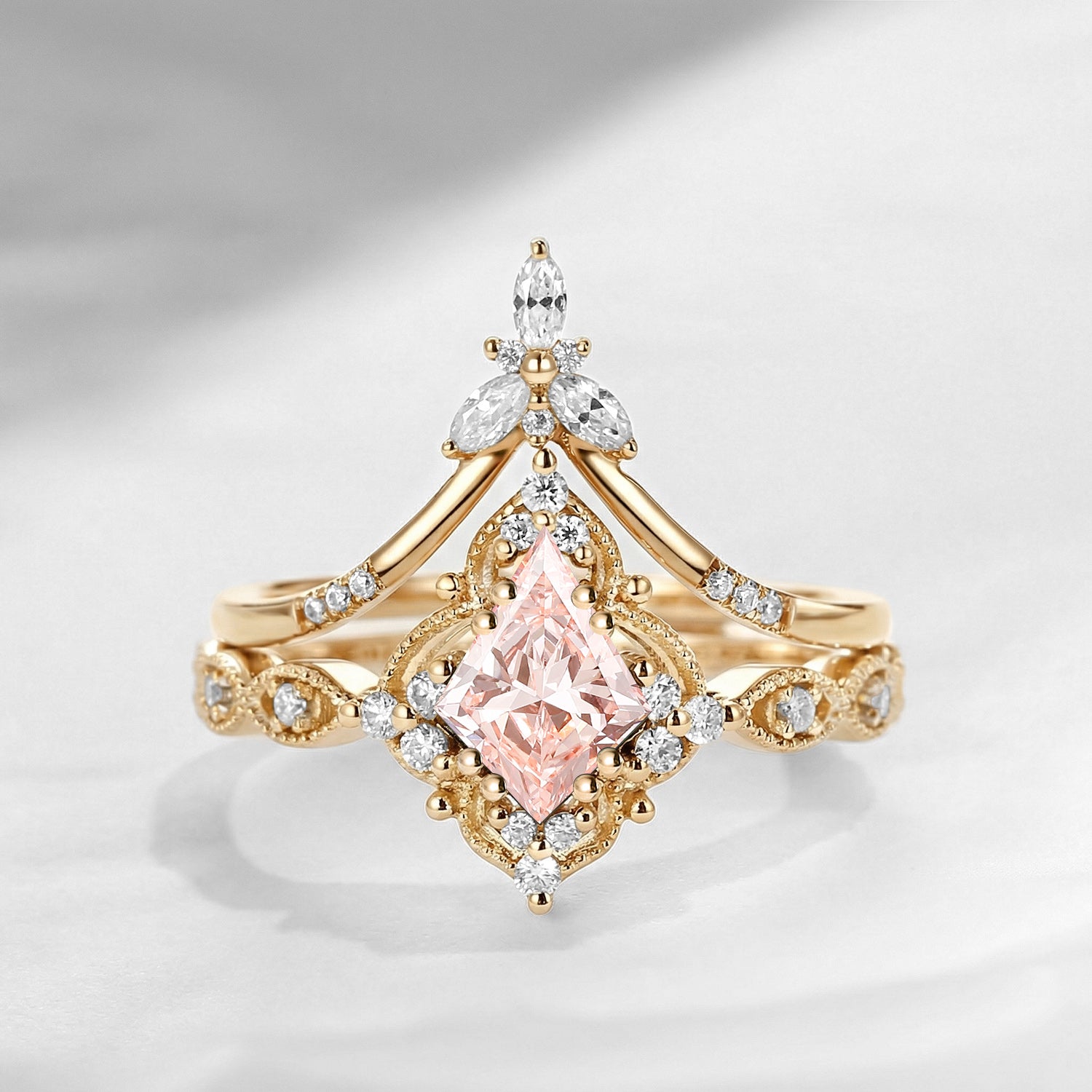 Vintage Inspired Kite Cut Lab Pink Diamond Milgrain Engagement Ring Set 2pcs