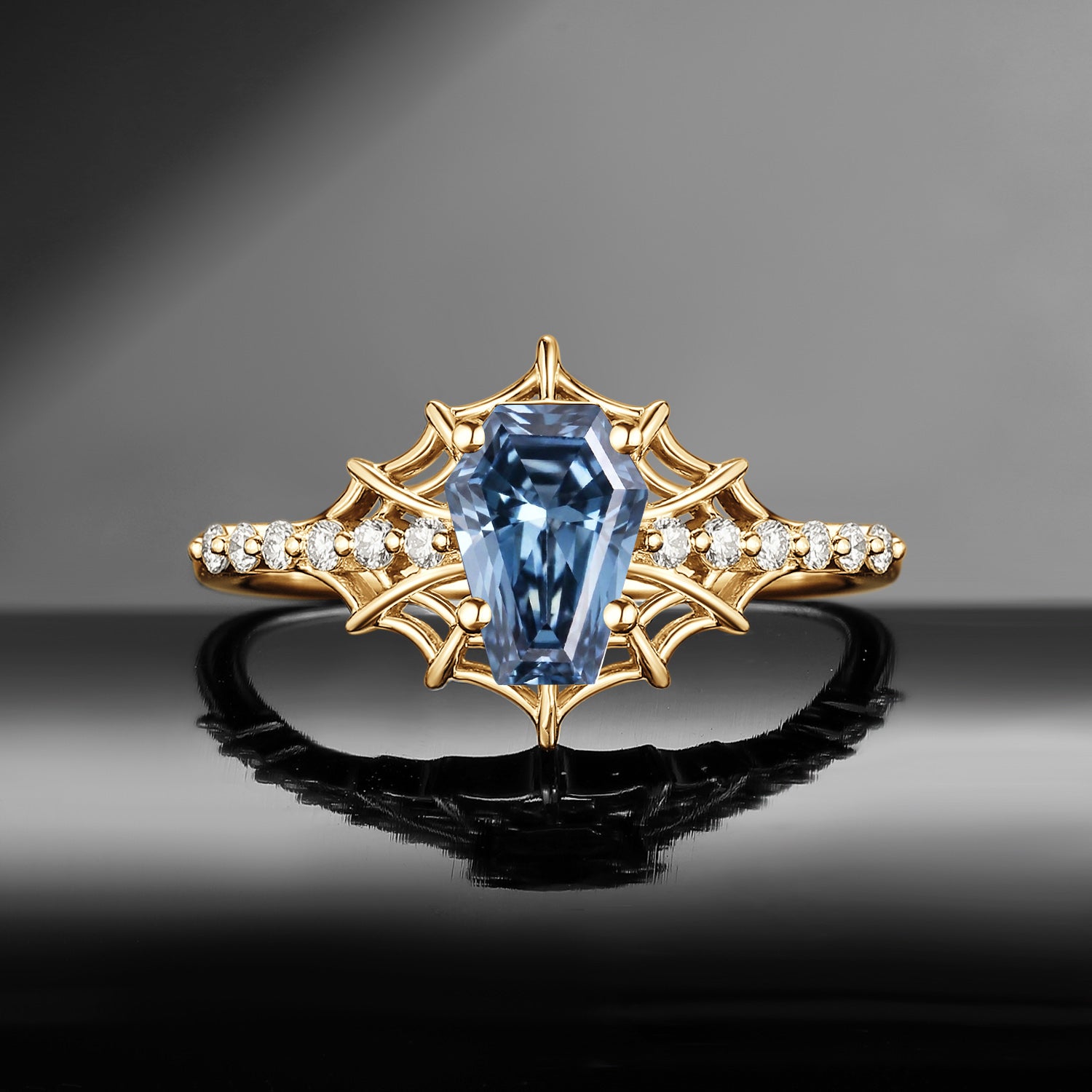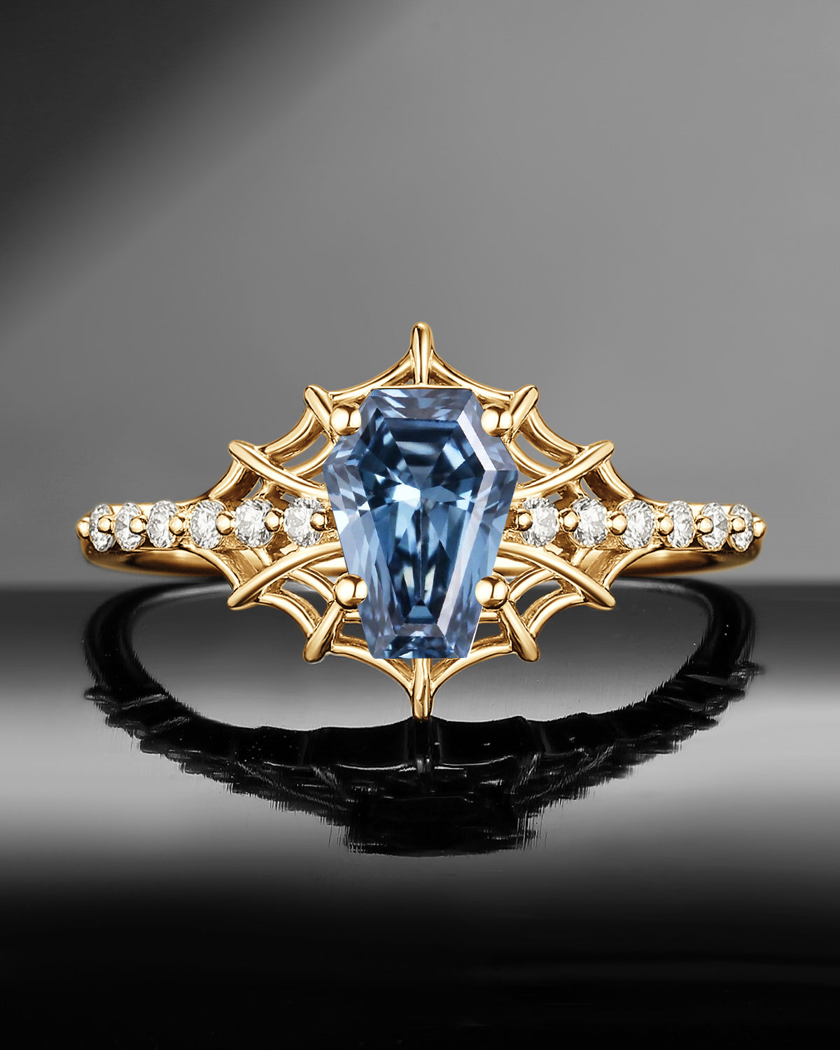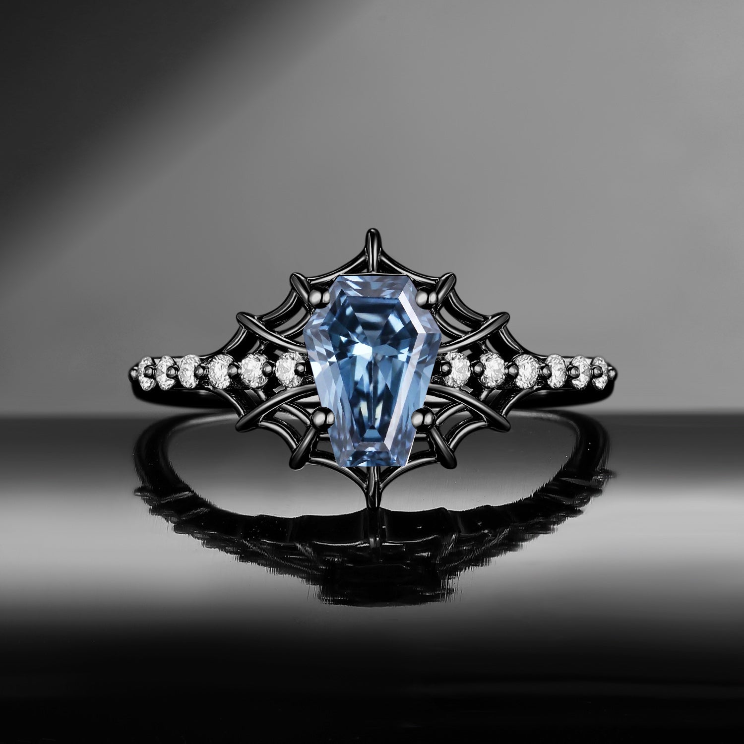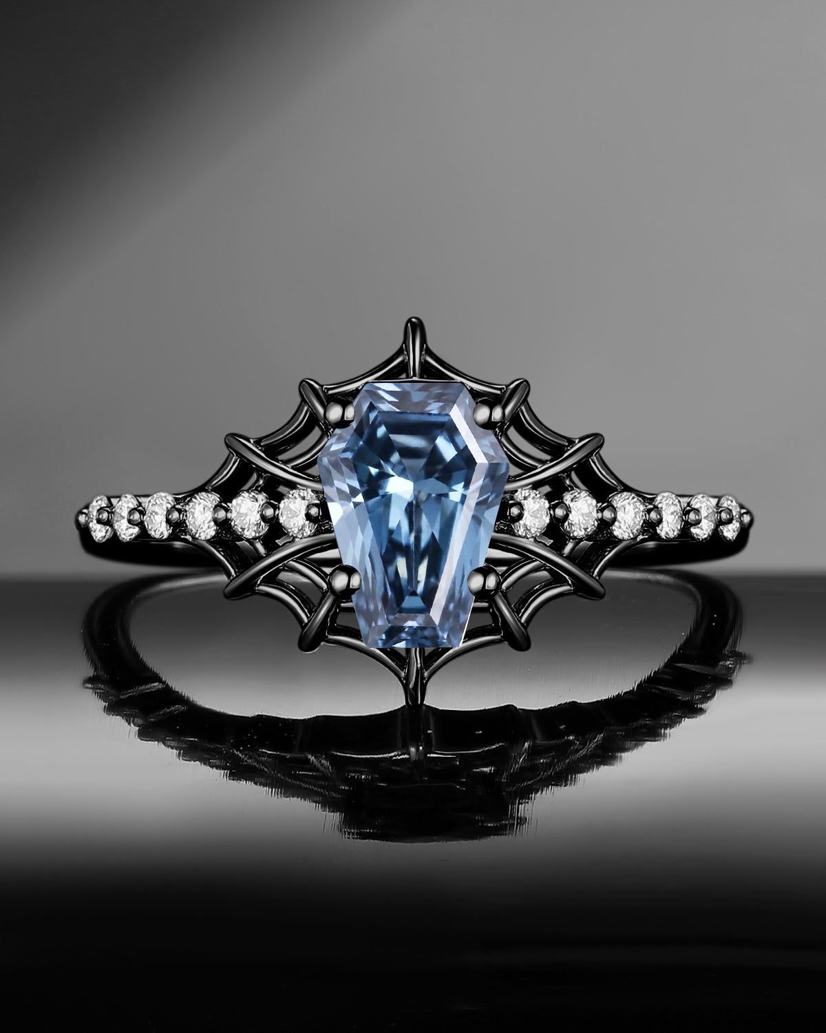 Gothic Inspired Coffin Blue Moissanite Spider Web Black Gold Engagement Ring