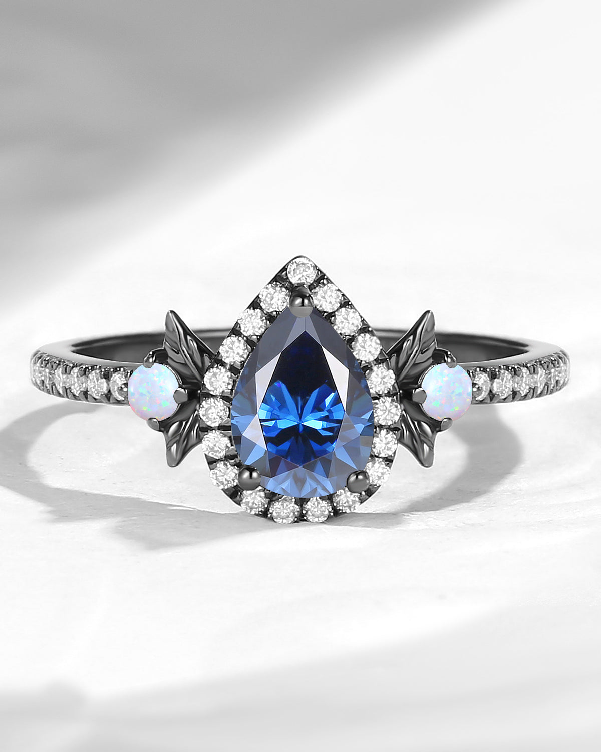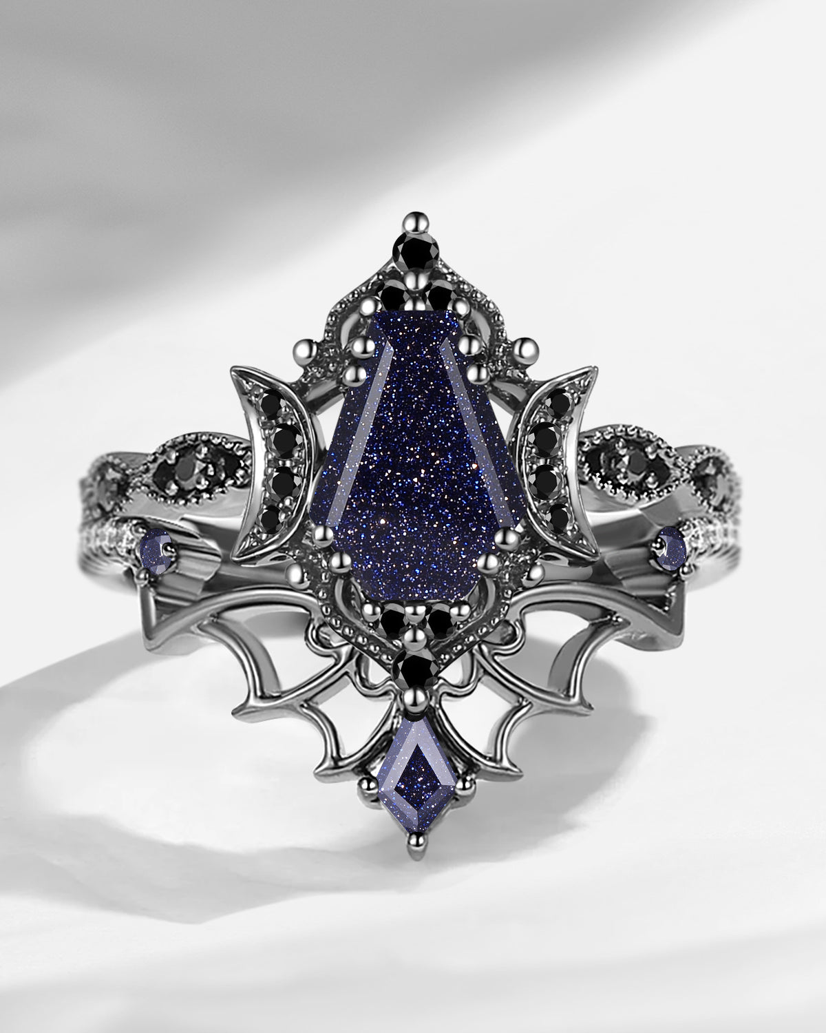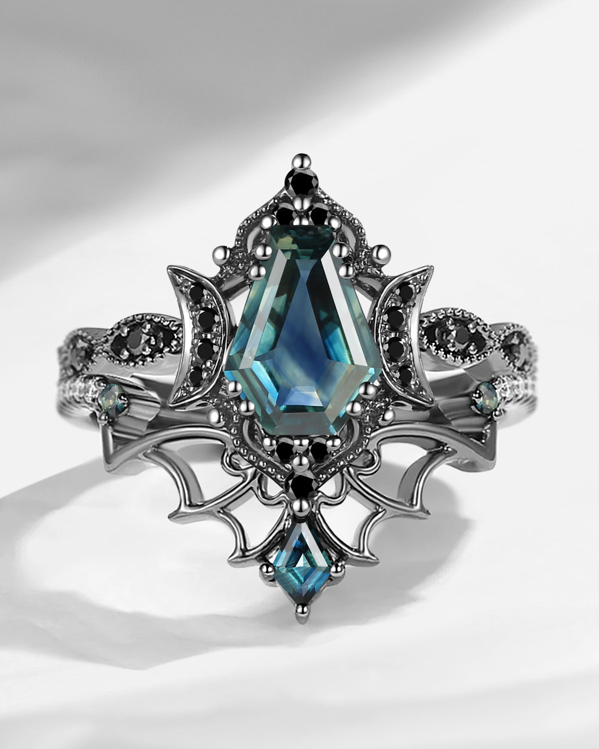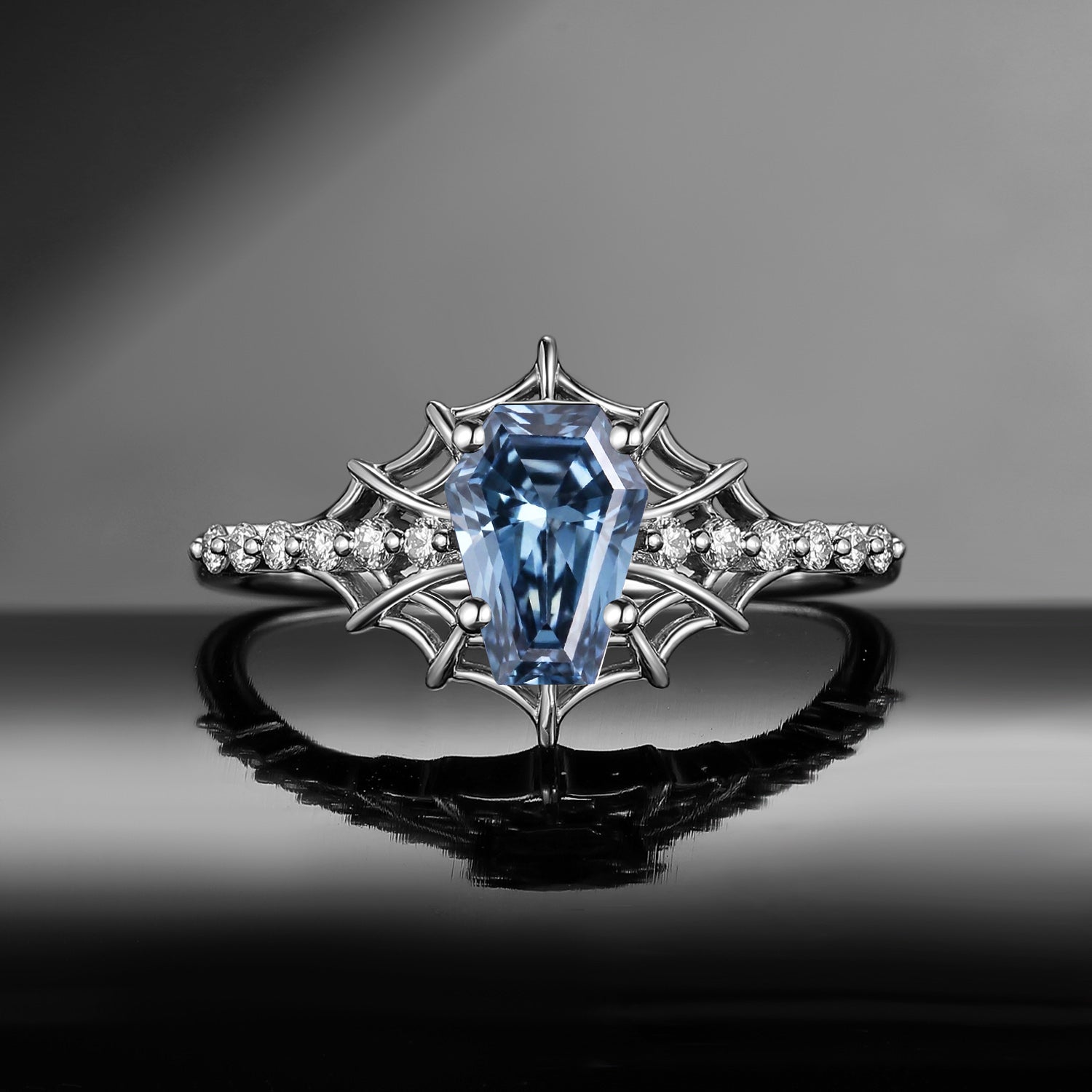 Gothic Inspired Coffin Blue Moissanite Spider Web Black Gold Engagement Ring