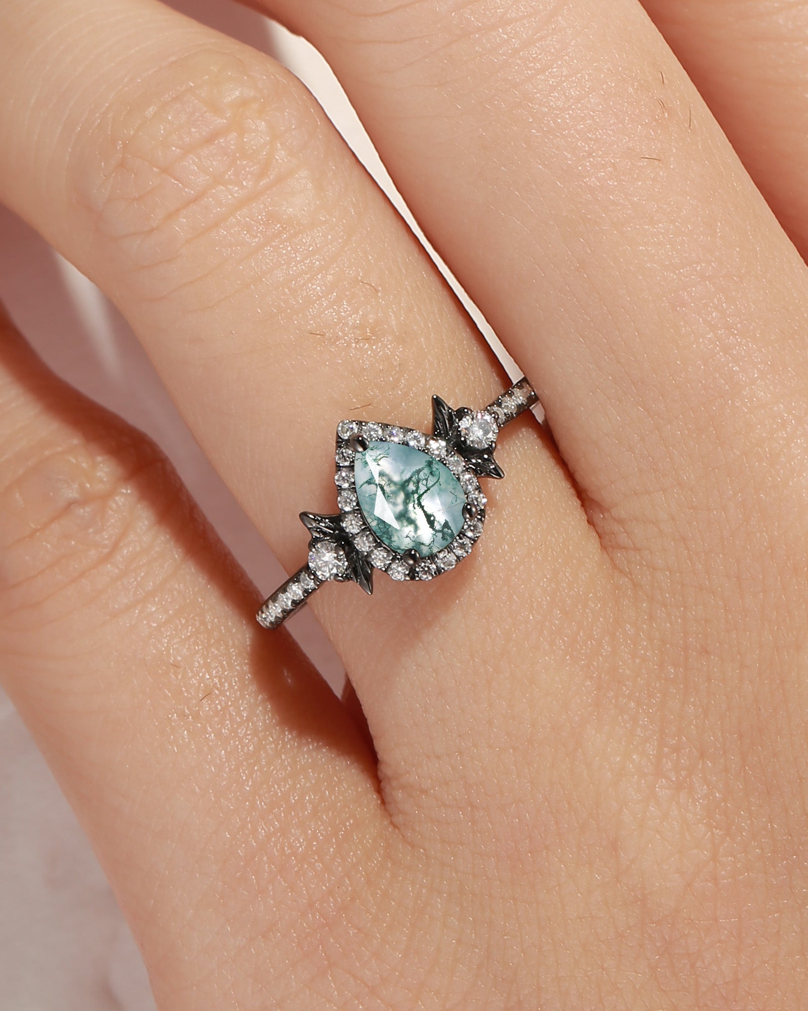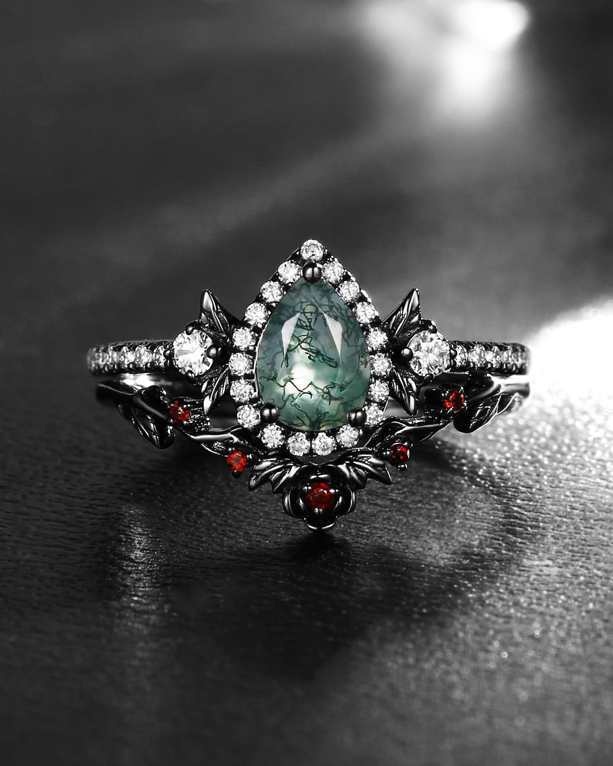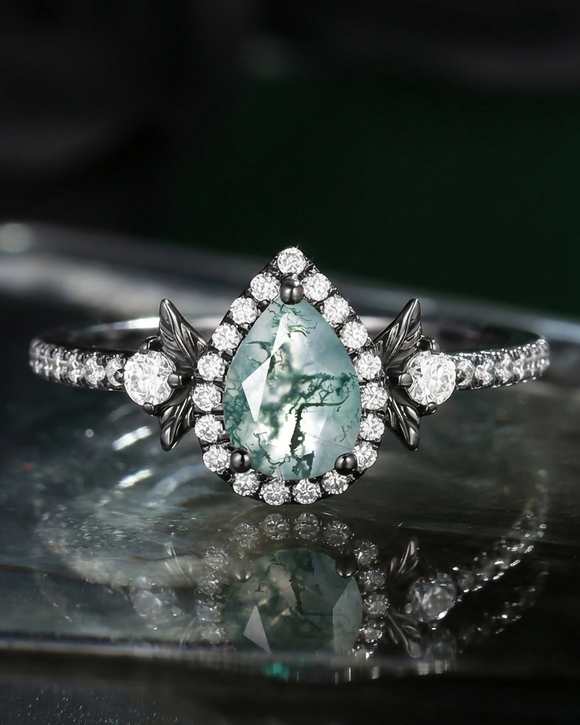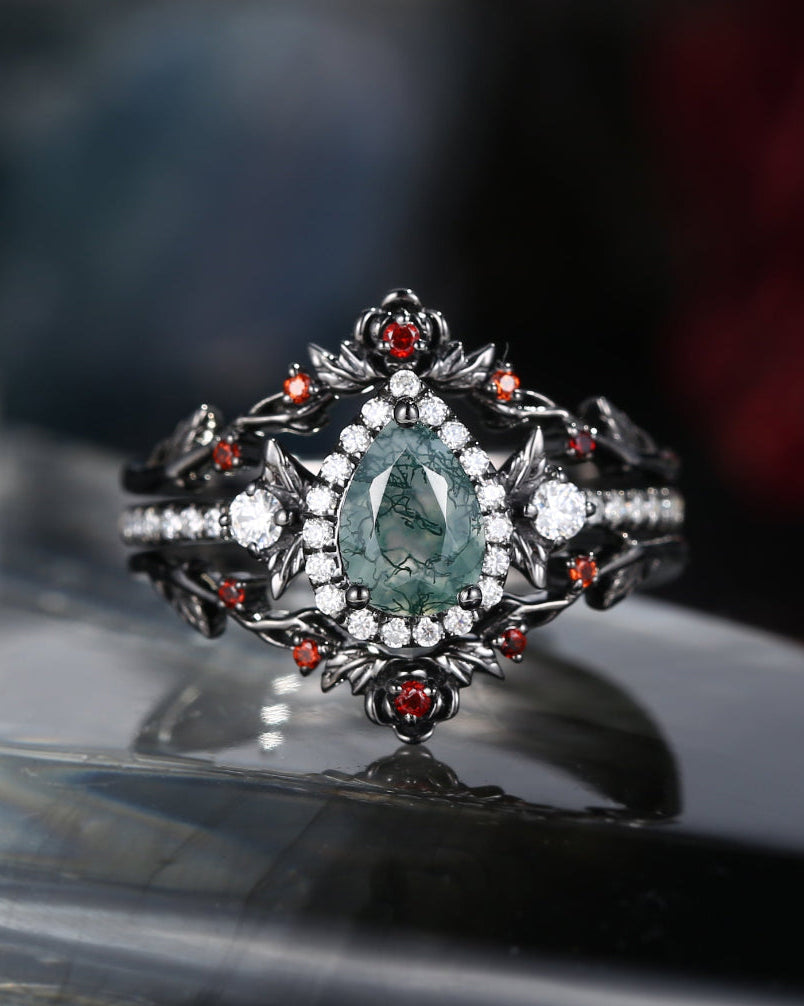 Crescent Moon | Unique Pear Shape Moss Agate Engagement Ring Set 2pcs - Luna