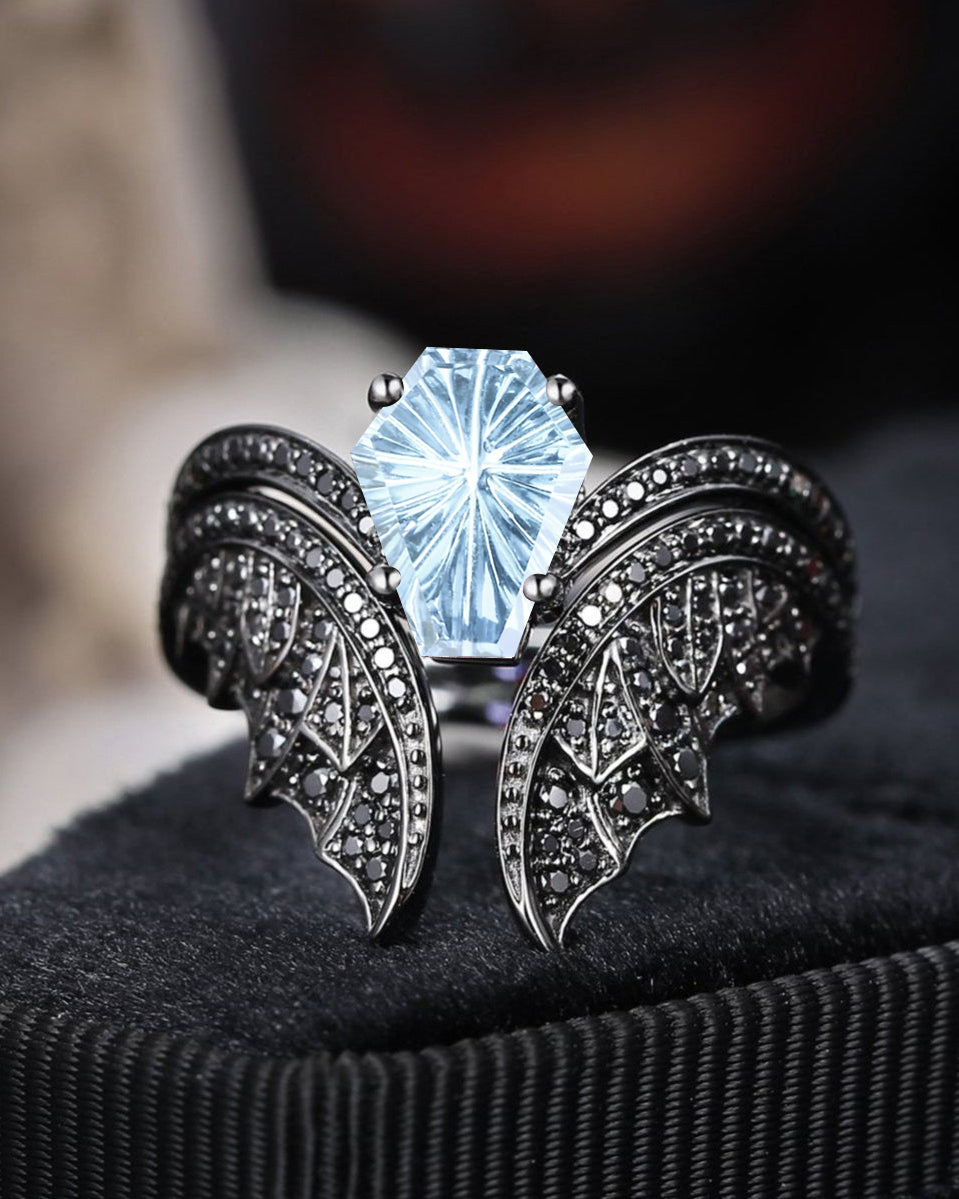 Fantasy Carved Coffin Natural Aquamarine Black Gold Engagement Ring - Bat Ring