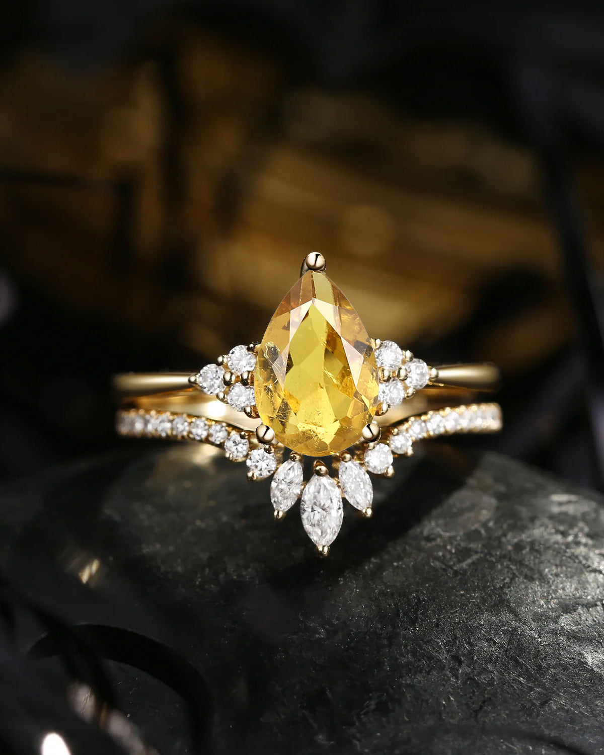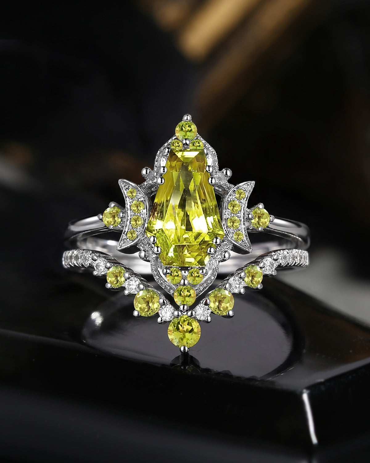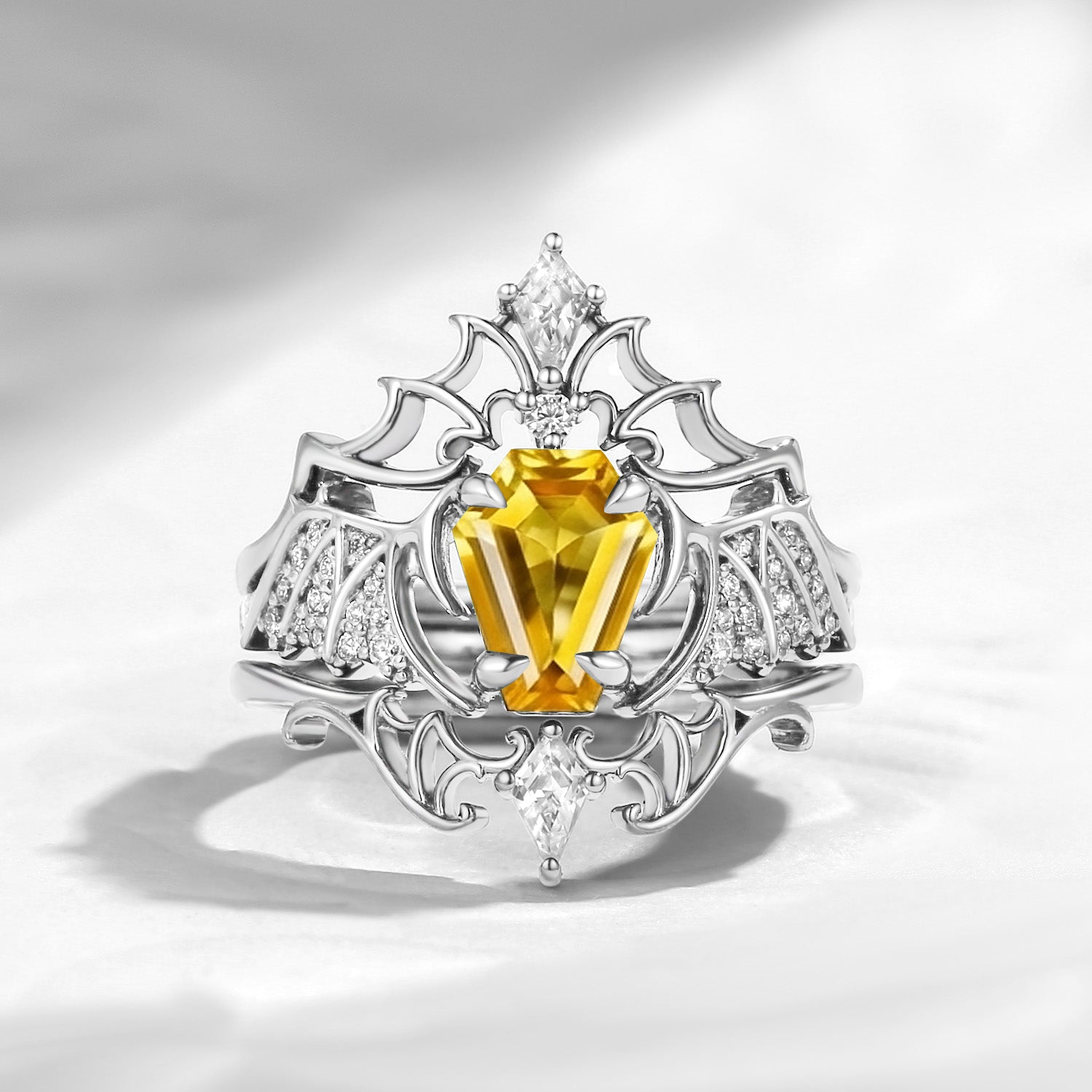 Crescent Moon | Coffin Cut Lab Yellow Sapphire Engagement Ring Set 2pcs