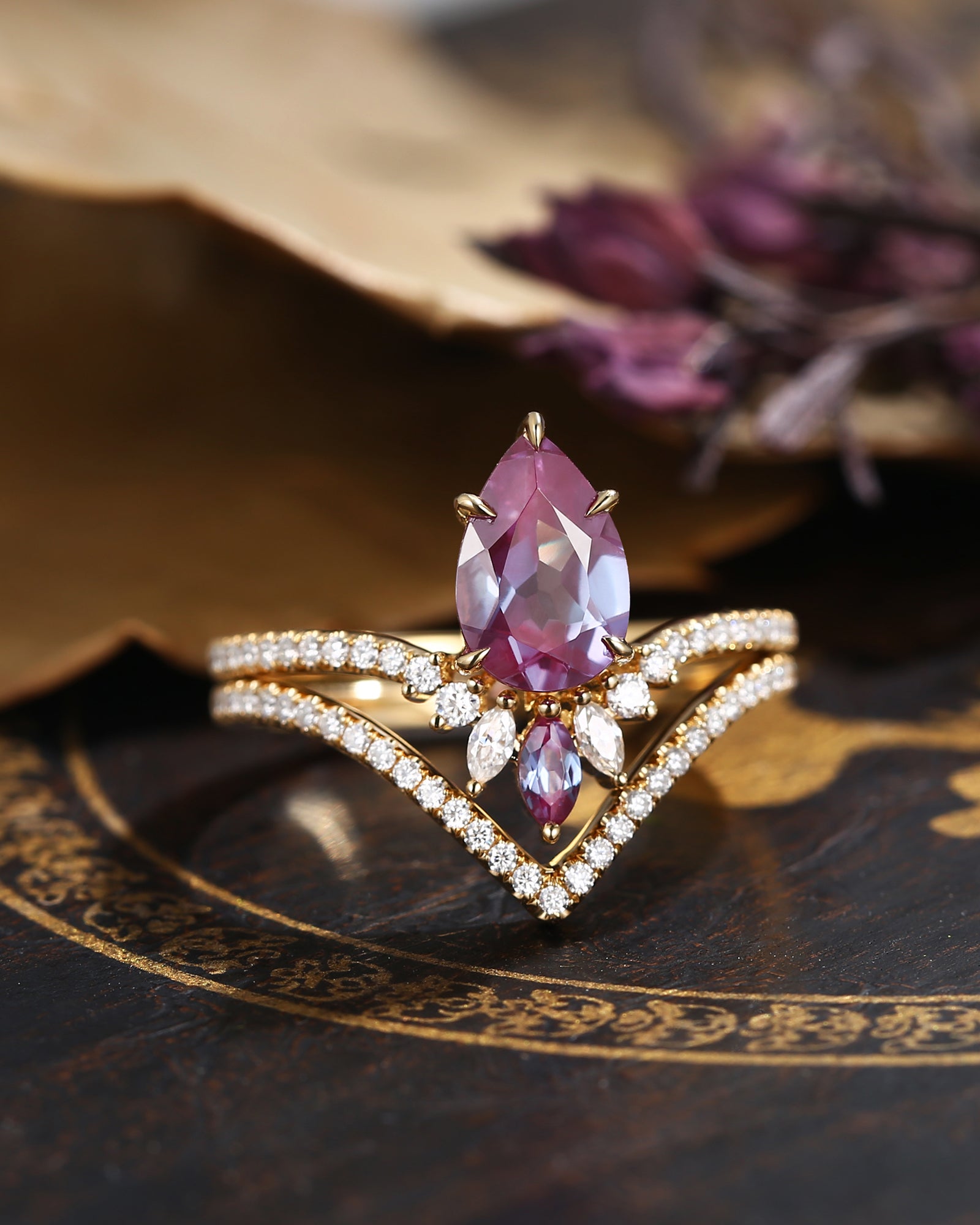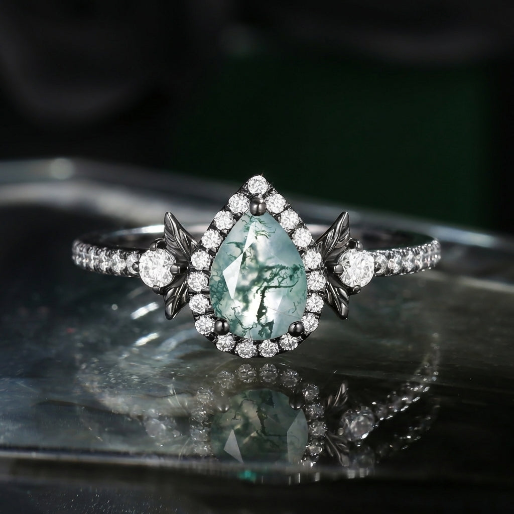 Crescent Moon | Pear Cut Moss Agate 'Ultra Galaxy' Engagement Ring Set 2pcs
