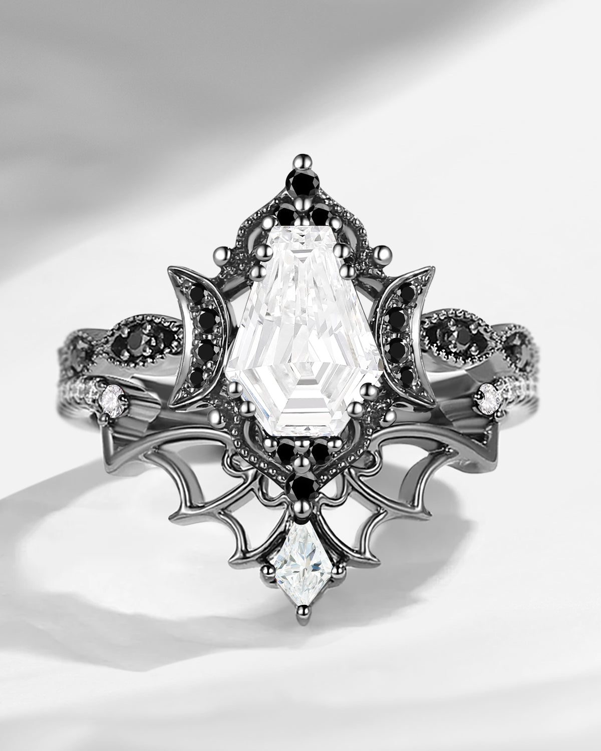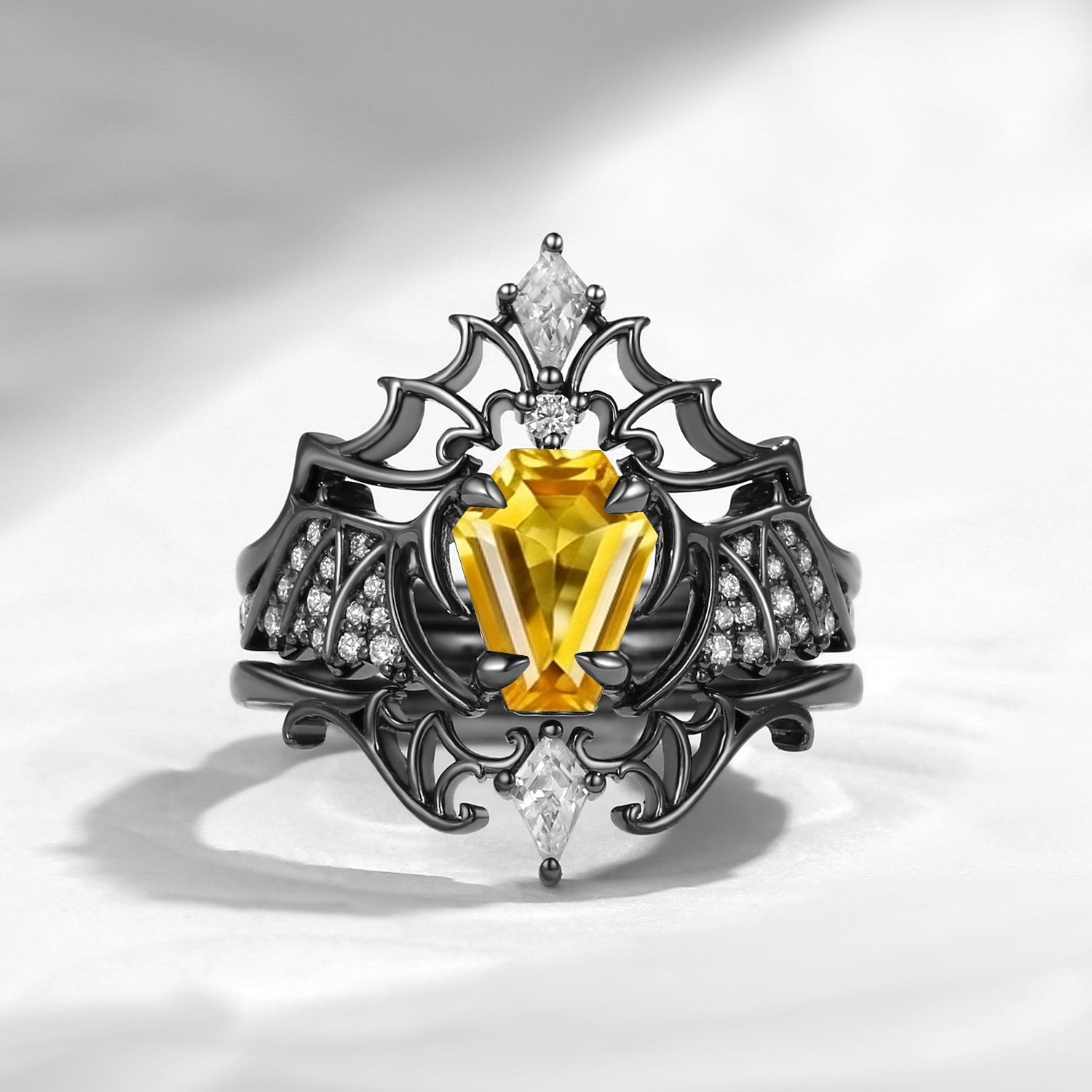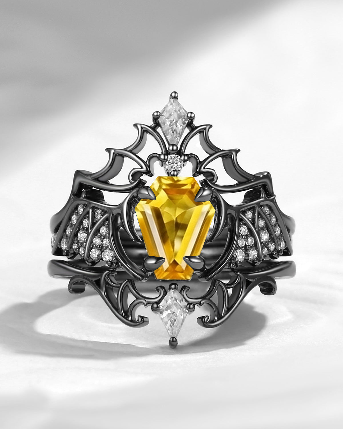 Coffin Cut Salt And Pepper Diamond Vintage Black Gold Bridal Set 2pcs - Bat Ring