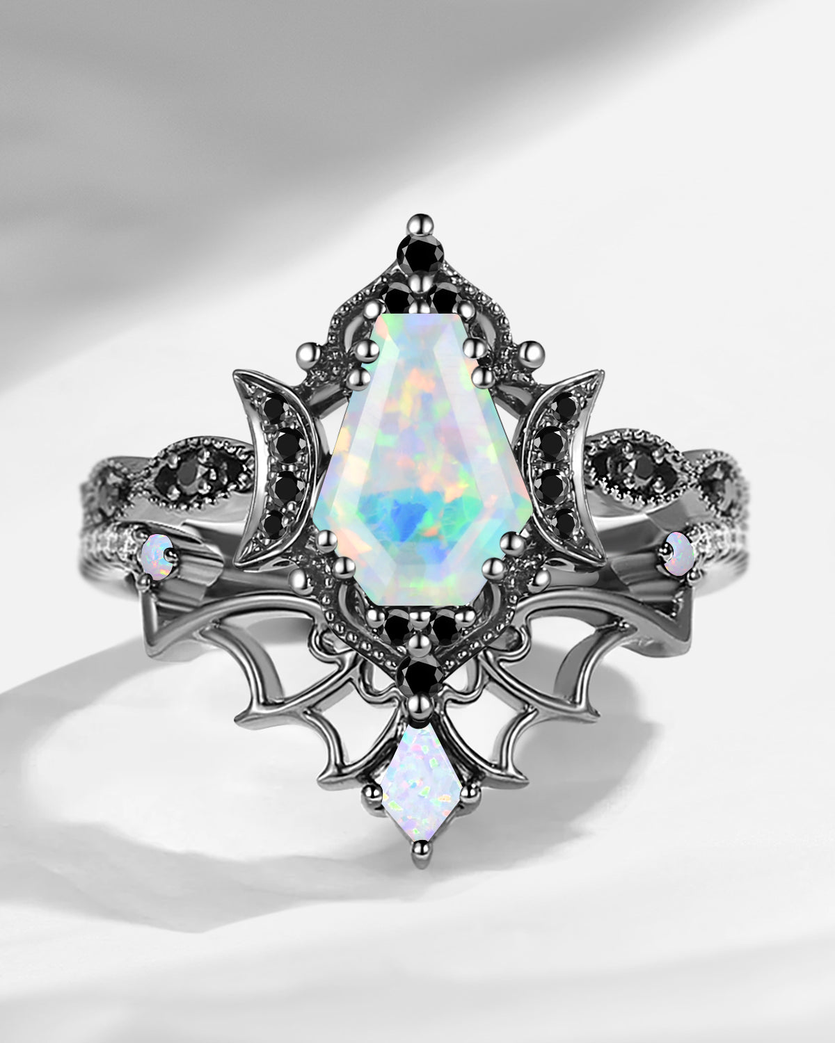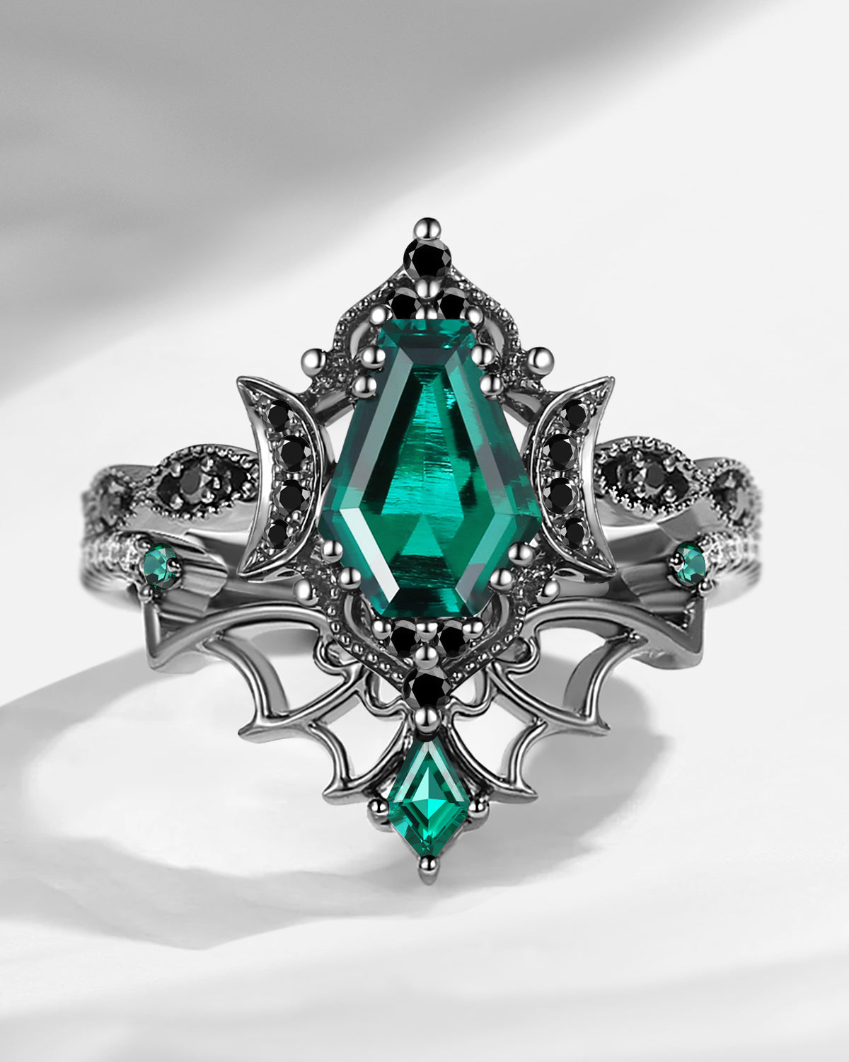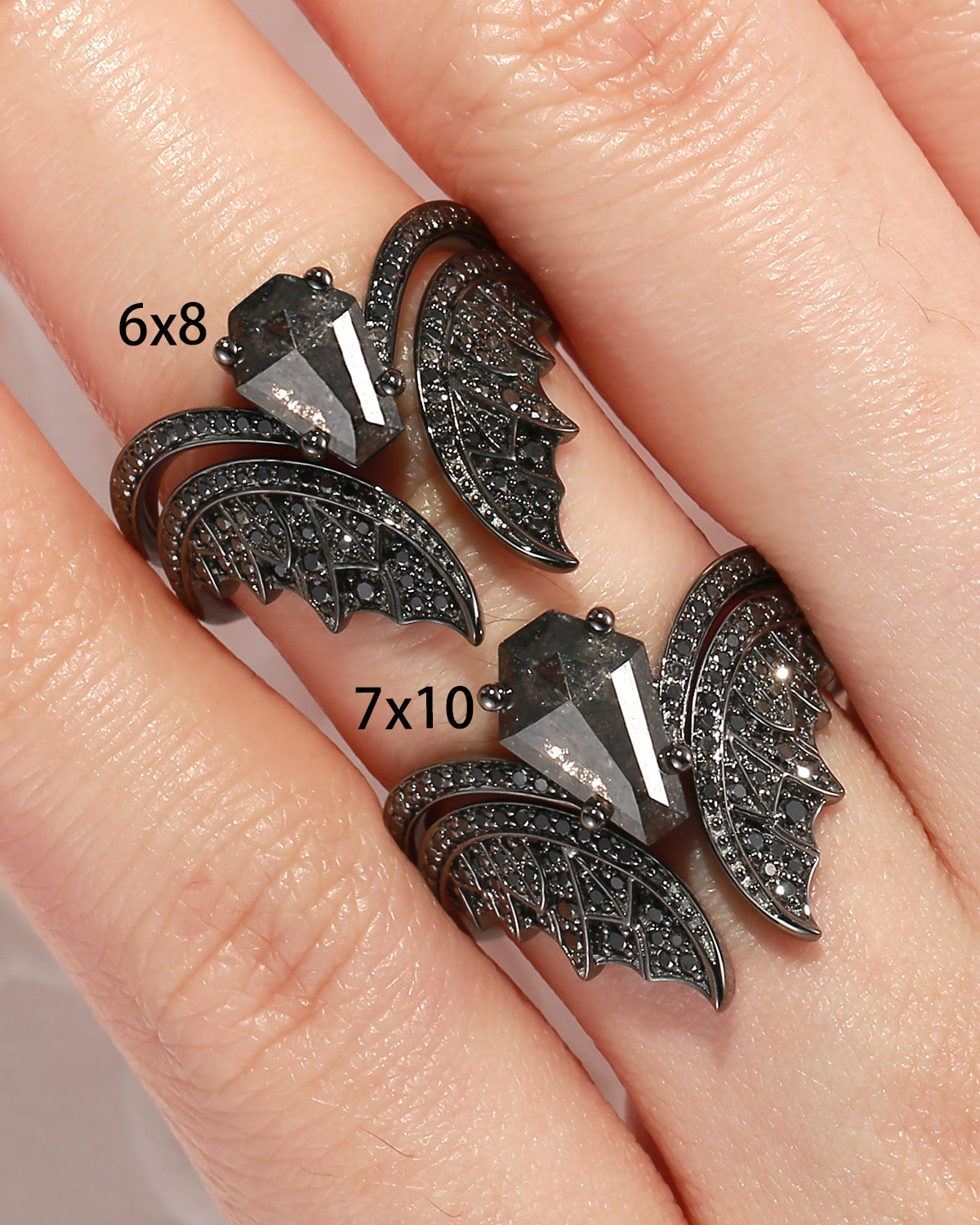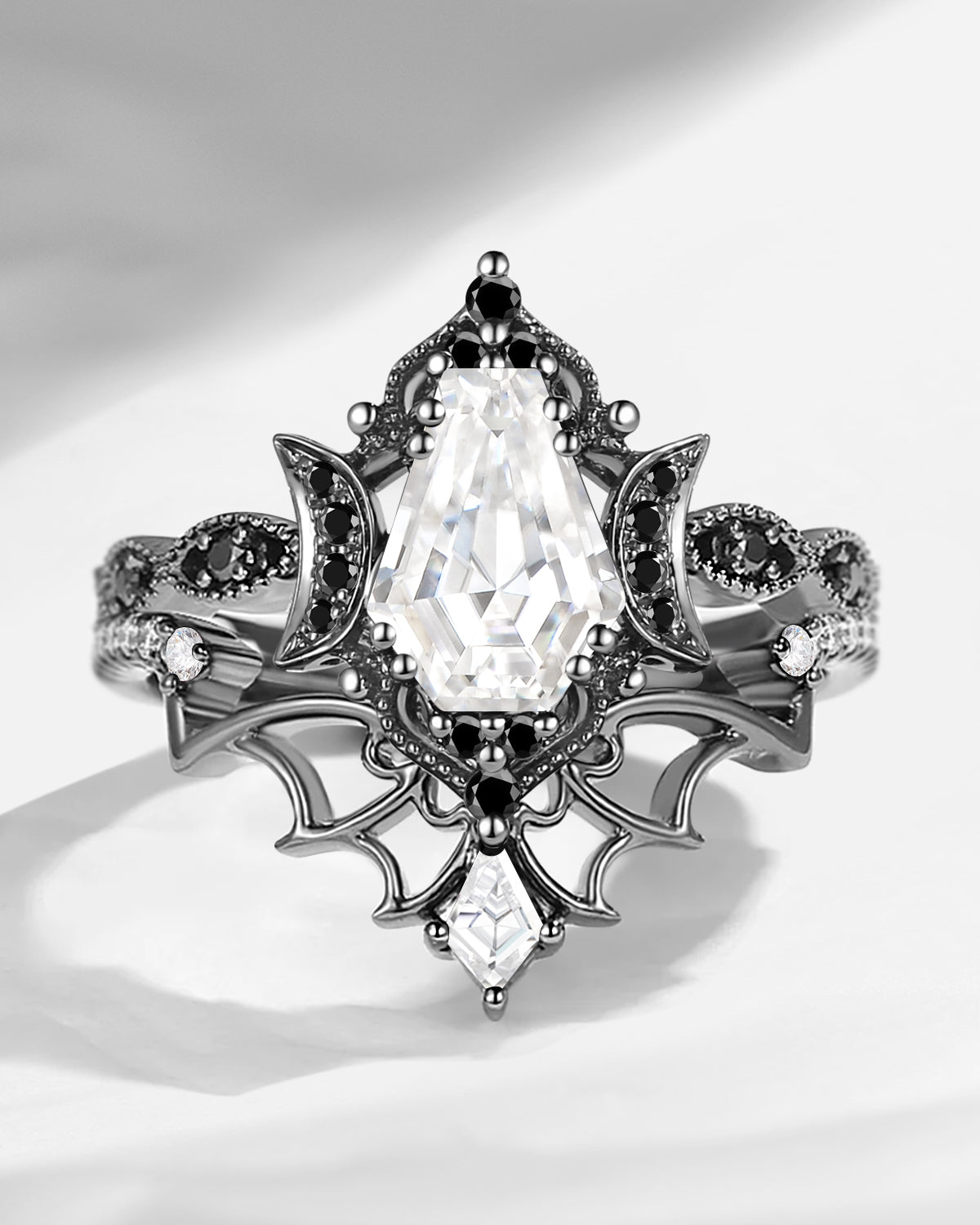 Coffin Cut Salt And Pepper Diamond Vintage Black Gold Bridal Set 2pcs - Bat Ring