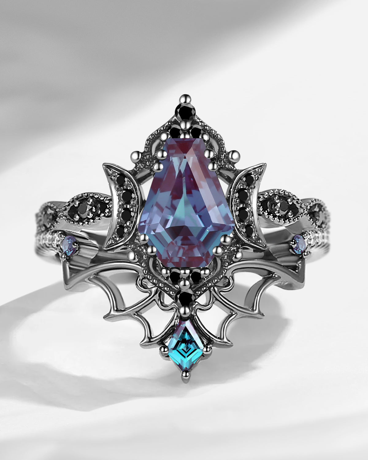 Crescent Moon | Coffin Cut Lab Alexandrite Black Gold Celtic Knot Ring Set 3pcs