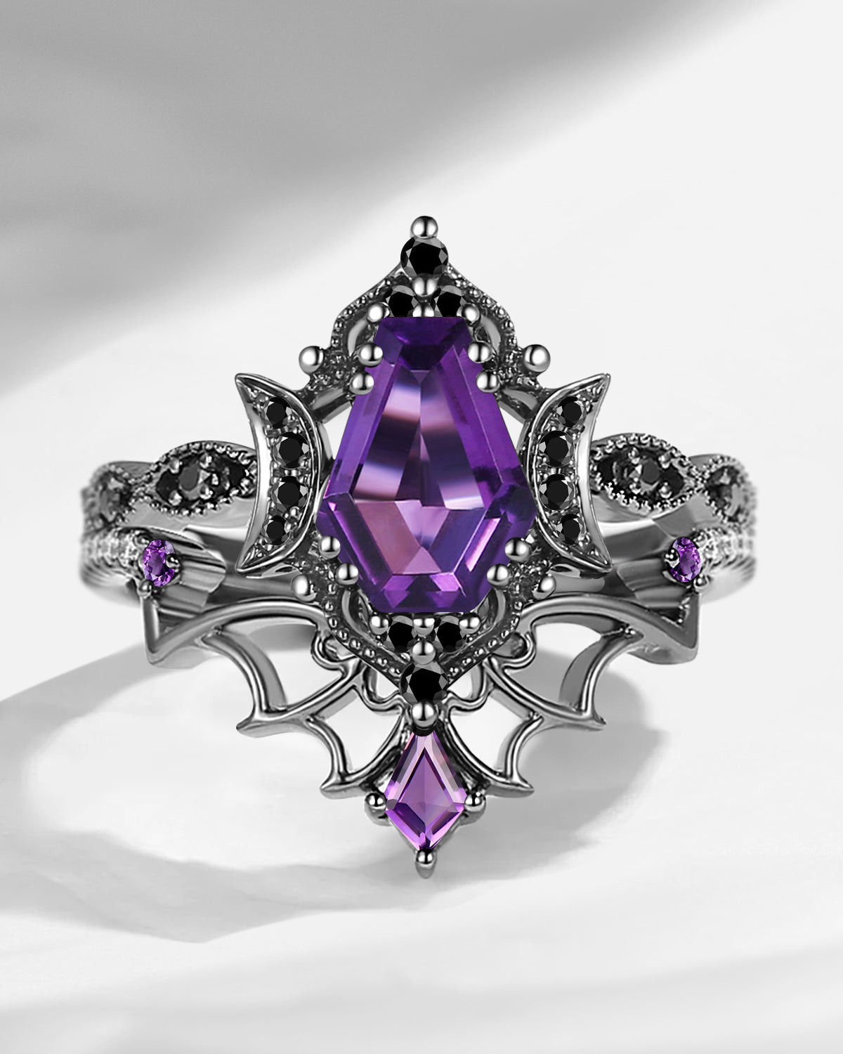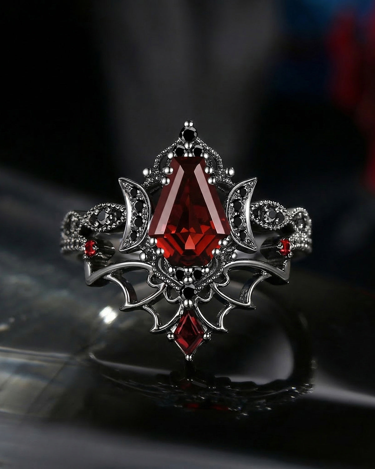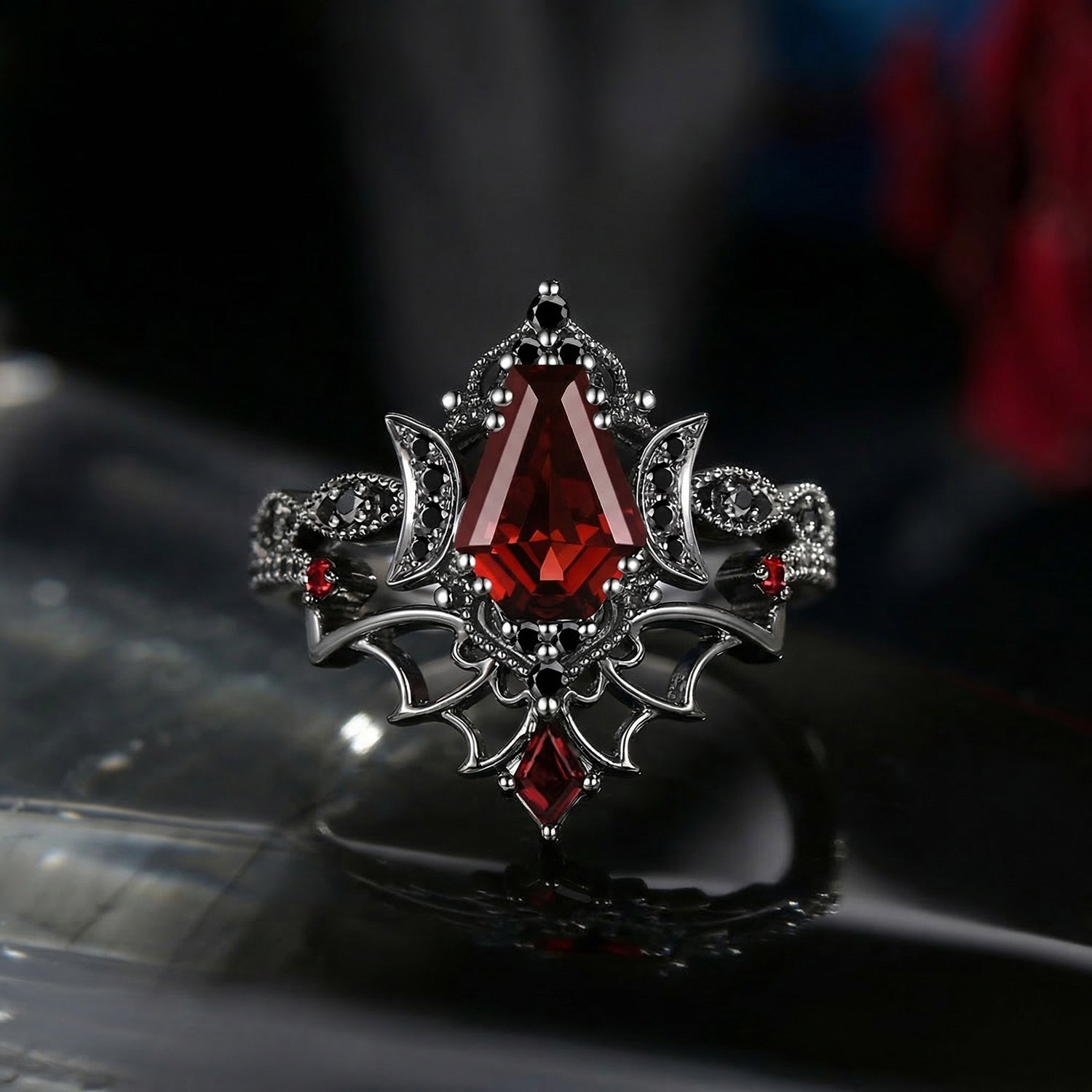 Crescent Moon | Coffin Cut Garnet Black Enamel 'Ultra Celestial' Ring Set 2pcs
