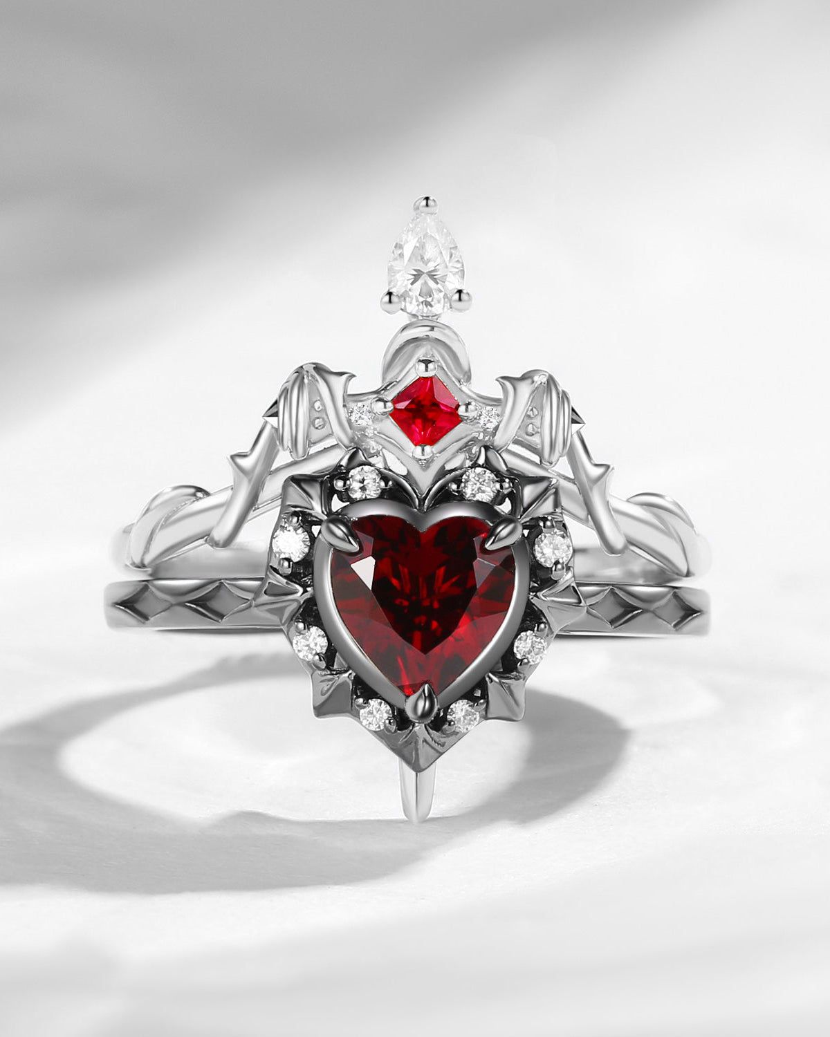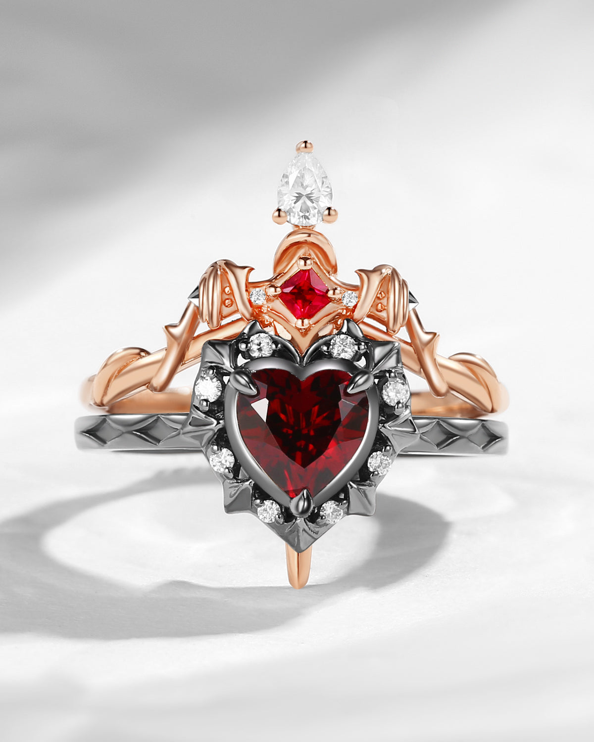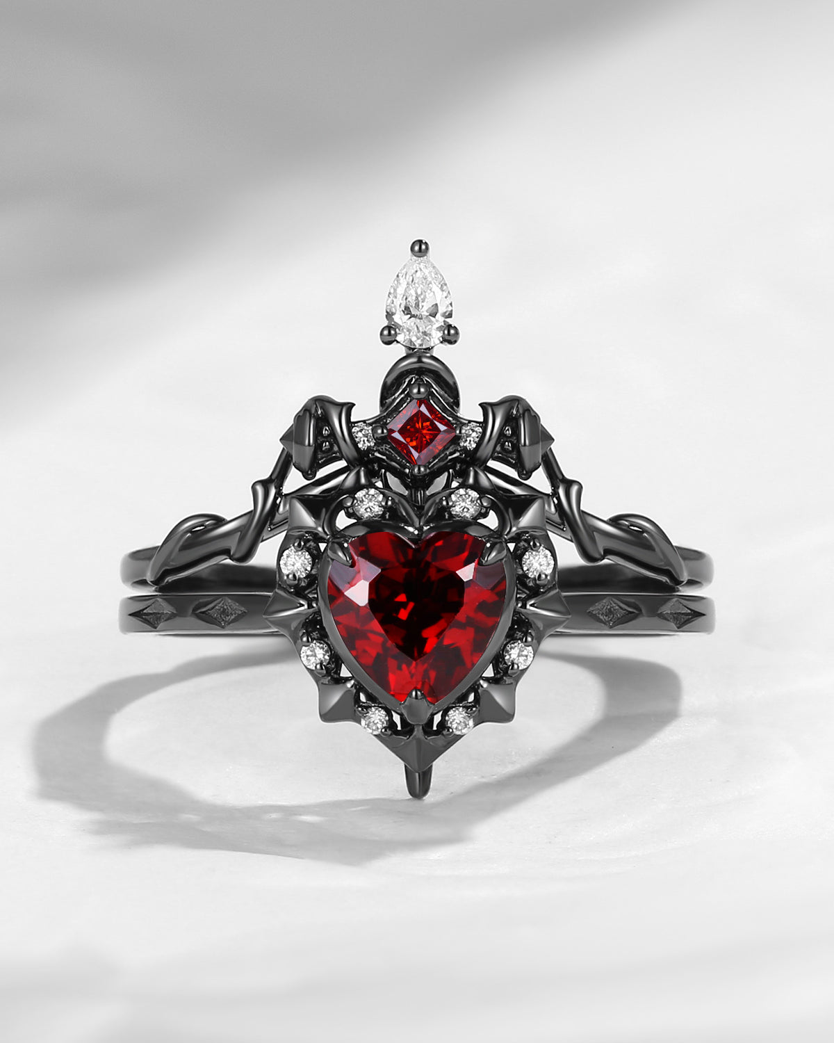 Retro Coffin Cut Garnet & Natural Ruby Vampire Gothic Engagement Ring Set 2pcs