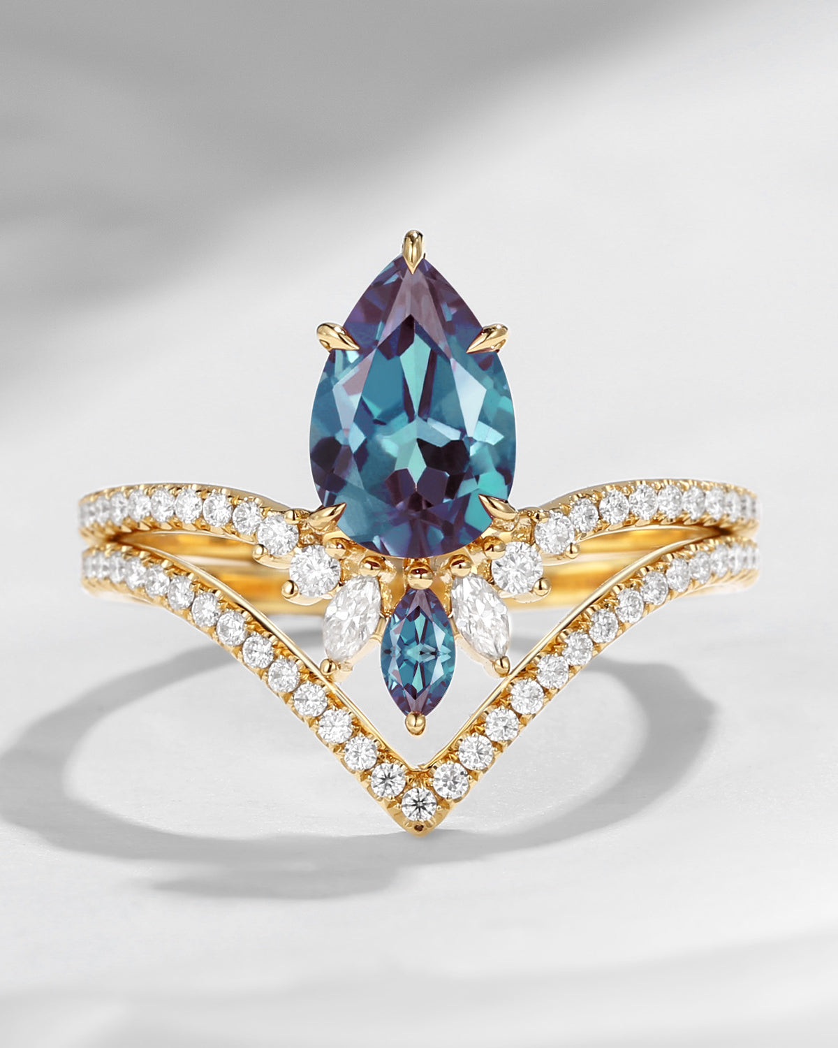 Firework Cut Coffin Lab Alexandrite Engagement Set 2pcs - White Dress