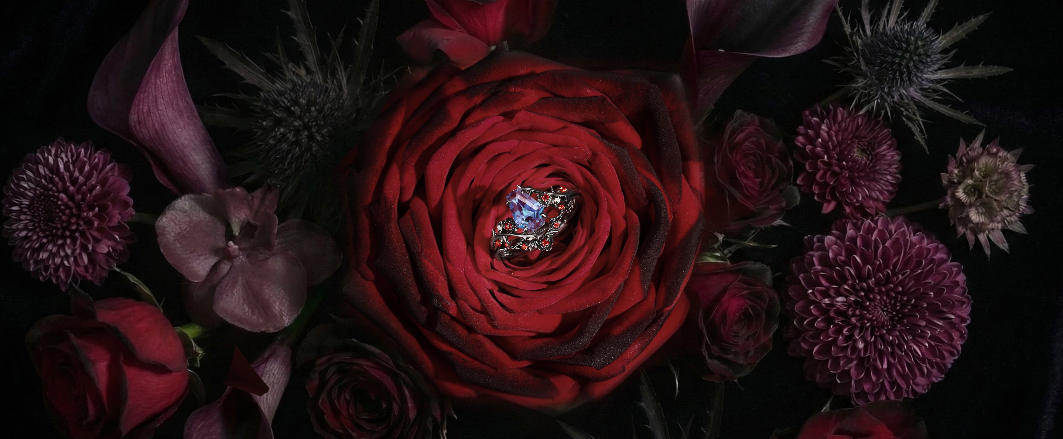 Nature Inspired Gothic Coffin Cut Lab Alexandrite 'Thorns & Roses' Bridal Set 2pcs