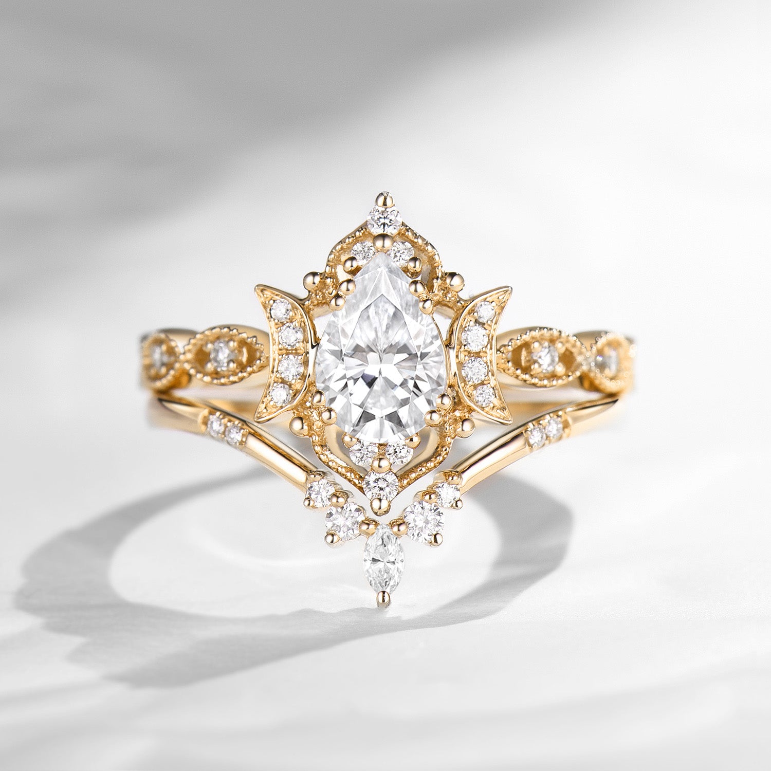 Pear Shaped Moissanite Engagement Ring Unique Crescent Ring Moon Wedding Ring Vine Boho Ring Cluster Bridal Set 2pcs Galaxy