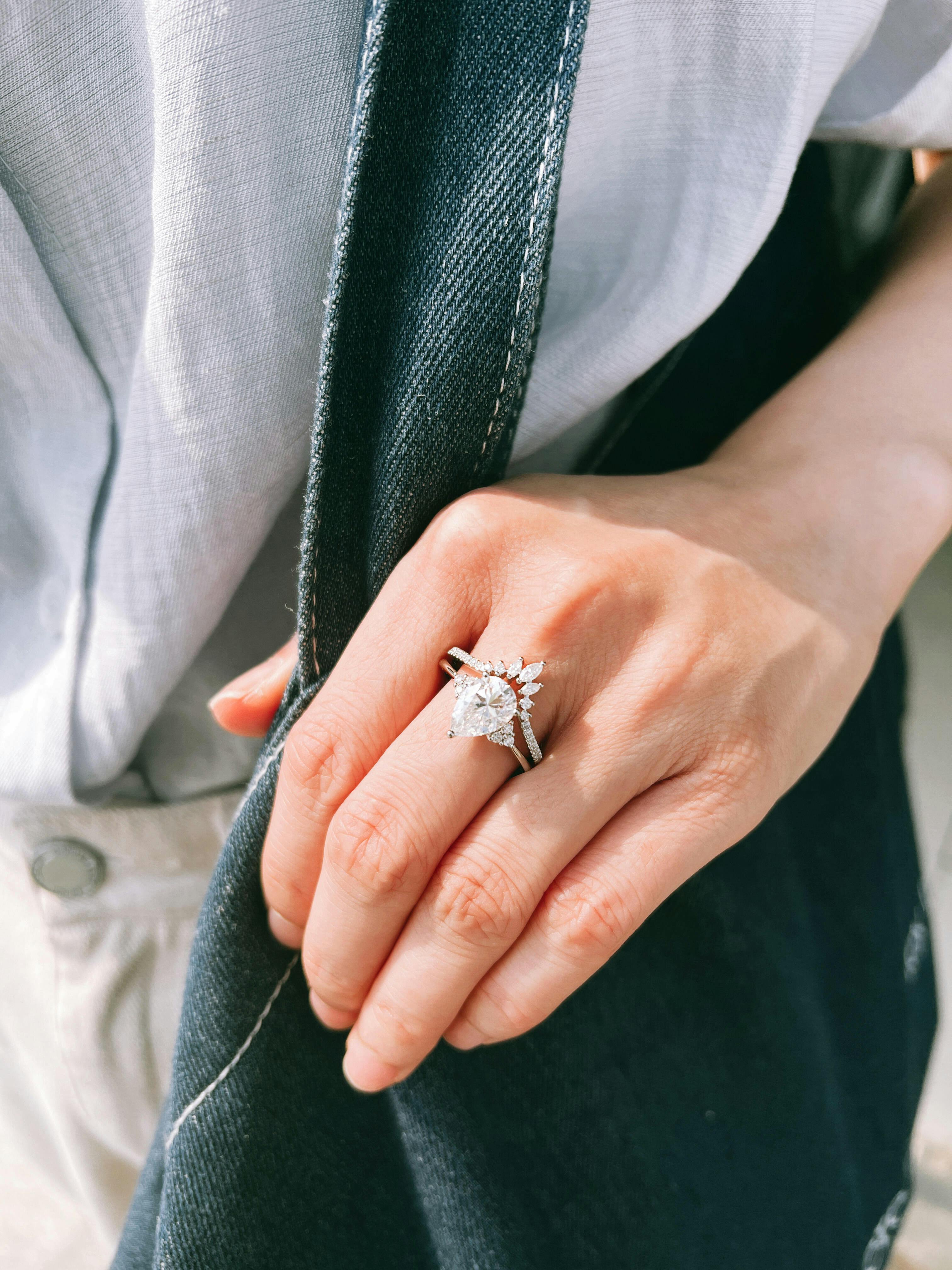 ⟢ Center Stone: Moissanite, in Pear Shaped