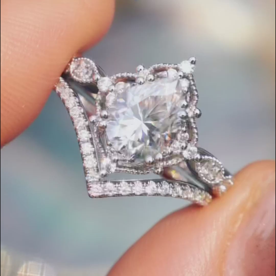 1.5ct Pear Shaped Moissanite Engagement Ring Set 2pcs Chevron Paved Wedding Ring Women Flower Vintage Inspired Ring 'Evelyn'