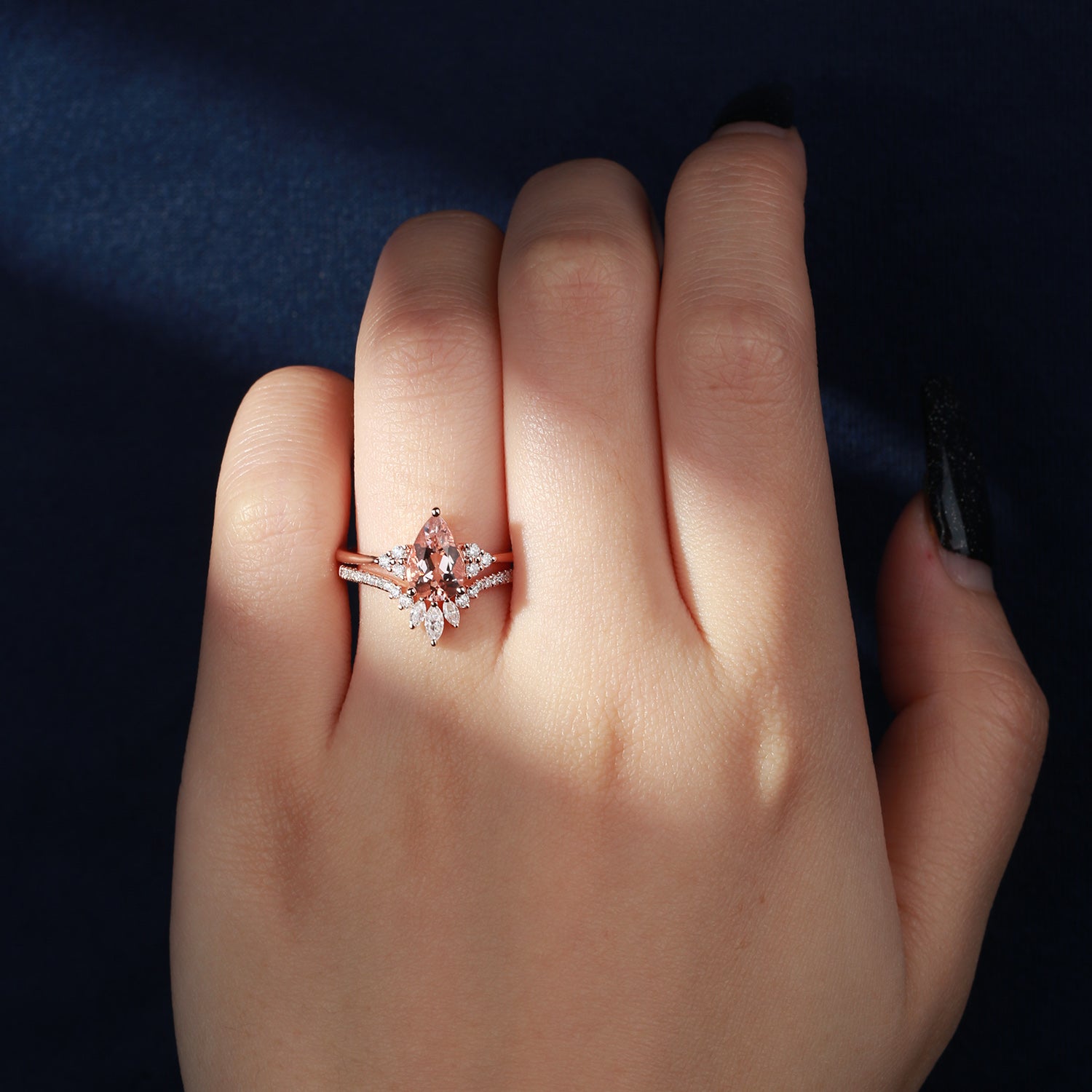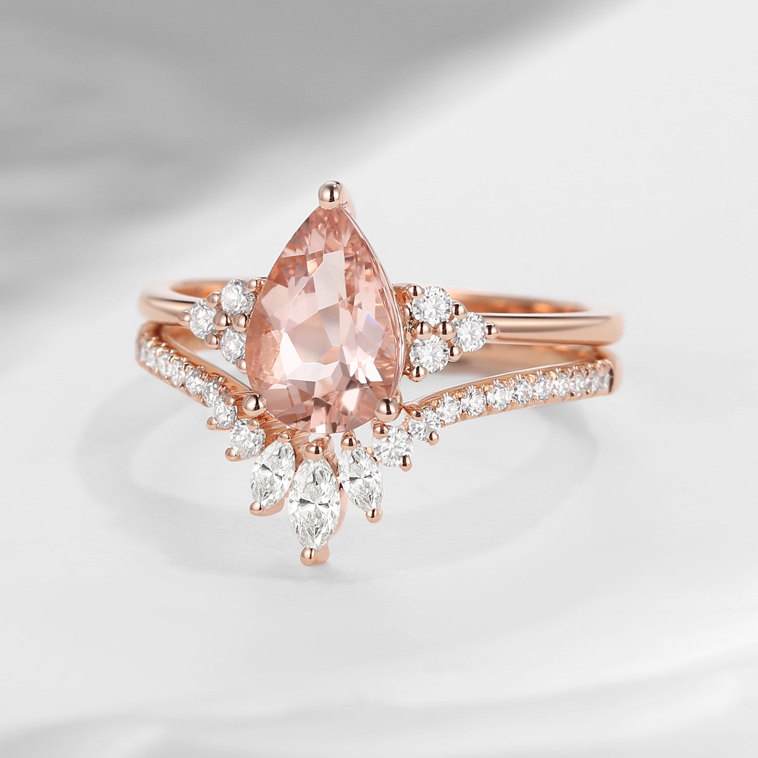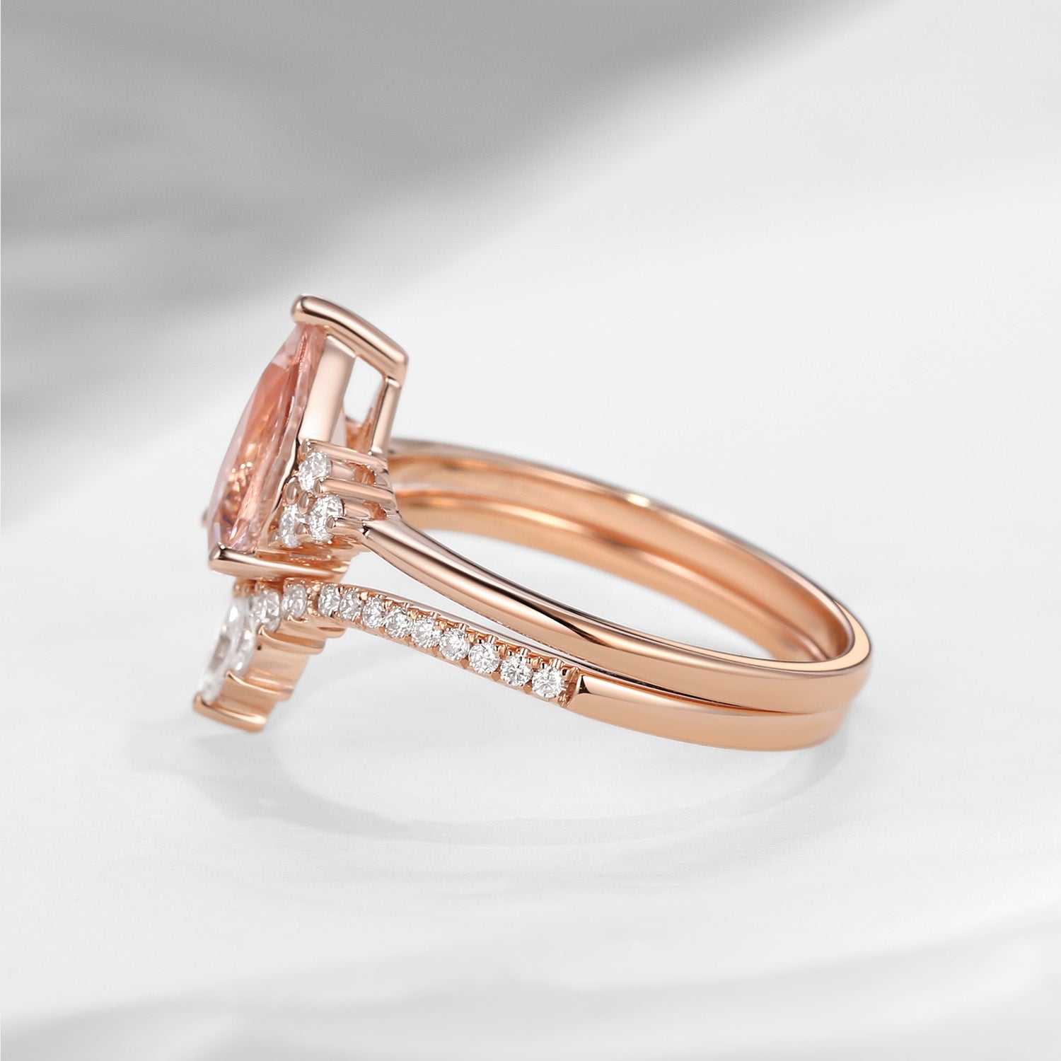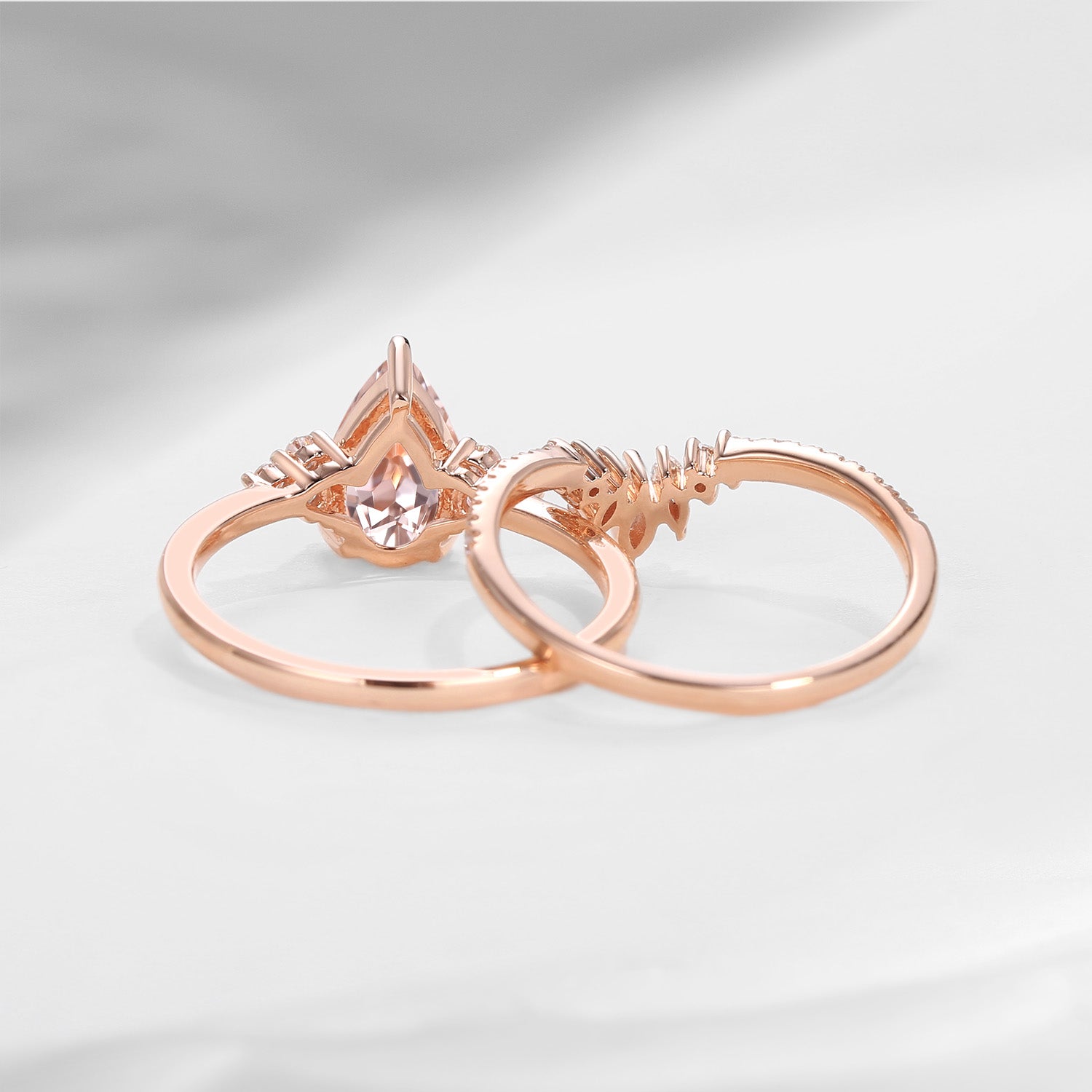 1.5ct Pear Shaped Morganite Classic Cluster Engagement Ring Set 2pcs - Vivian
