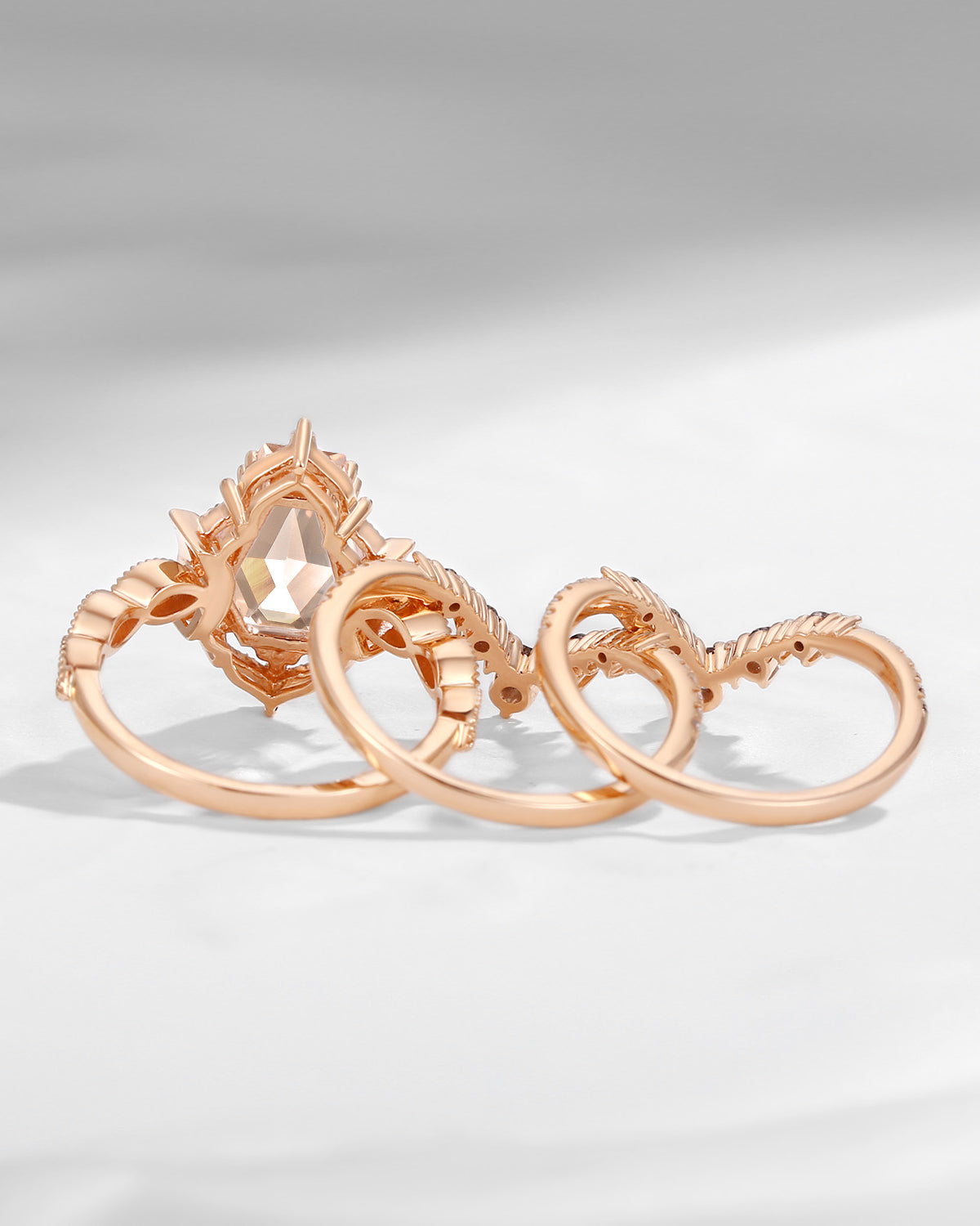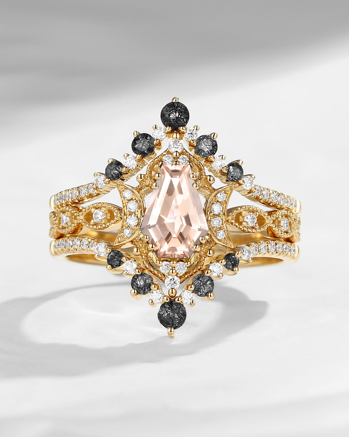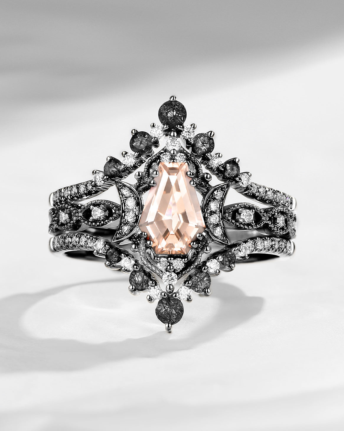 Crescent Moon | Unique Coffin Cut Natural Morganite Engagement Ring Set 3PCS - Till Death Do Us Part
