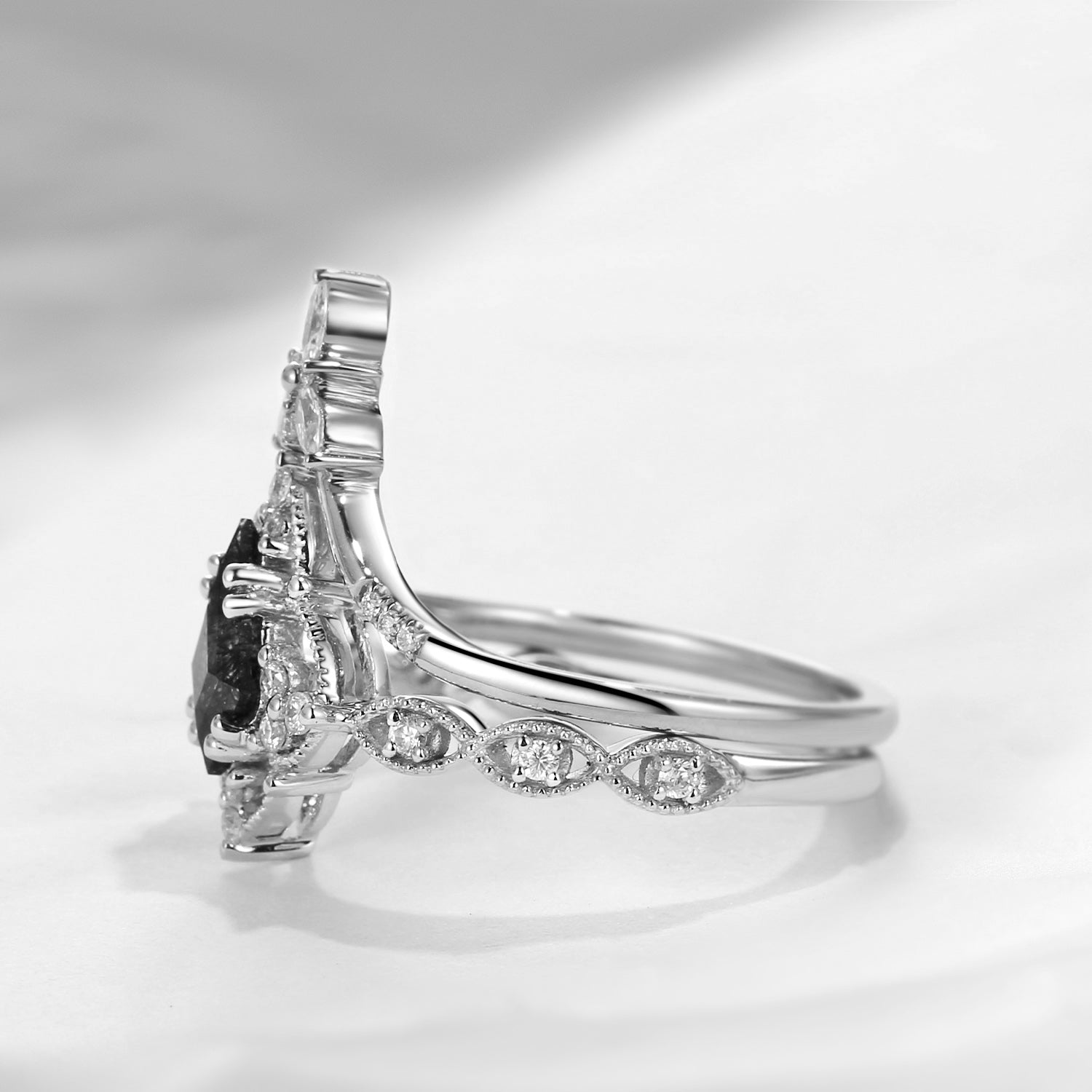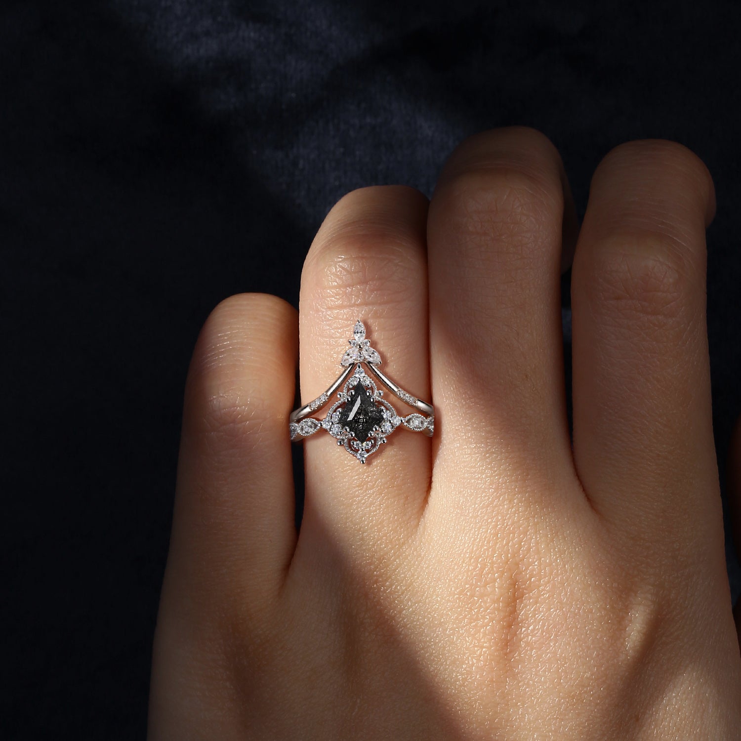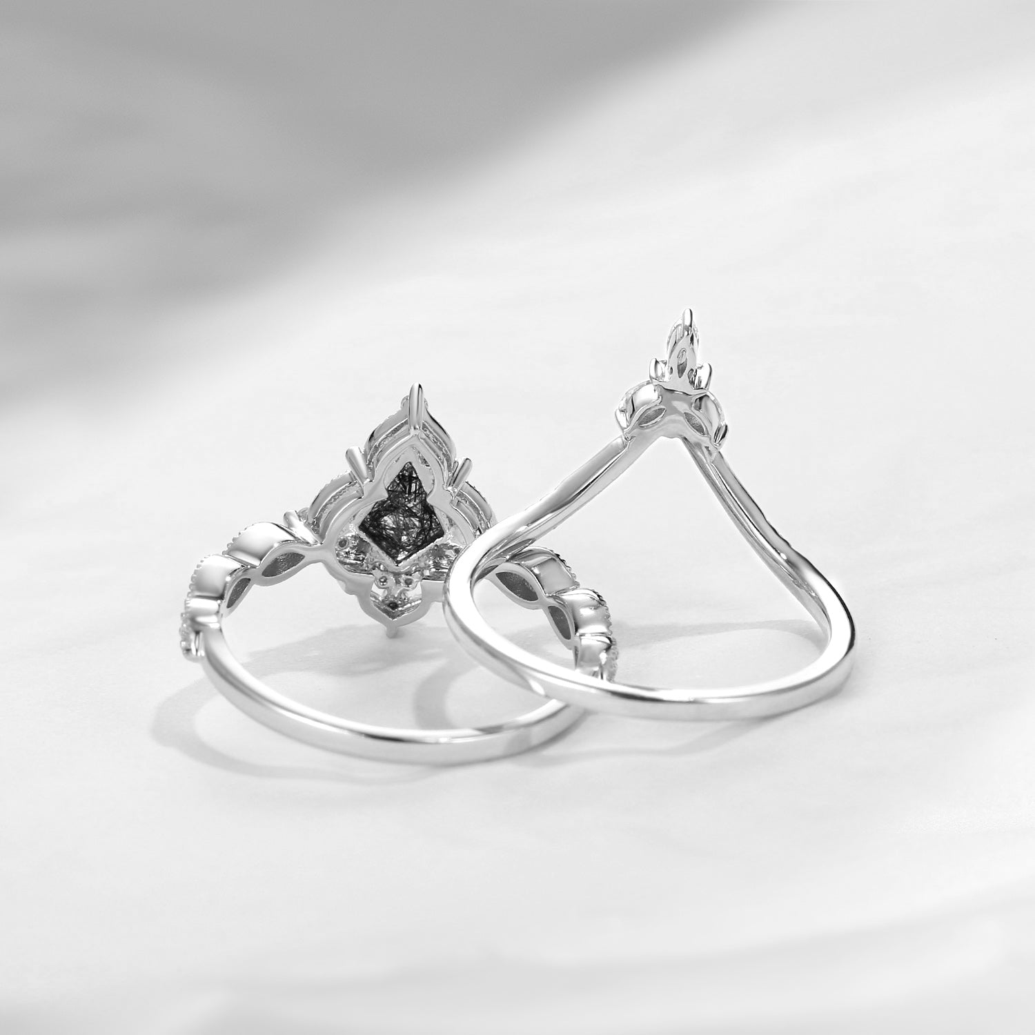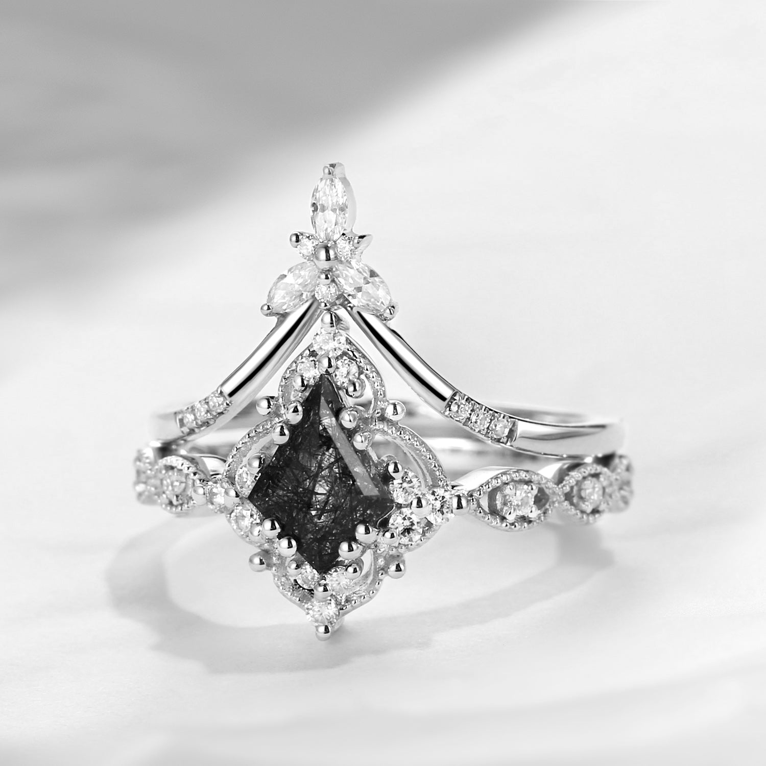 Kite Cut Black Rutilated Quartz Vintage Inspired Engagement Ring Set 2pcs