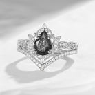 Unique Pear Shaped Black Rutilated Quartz Engagement Ring 2pcs White Gold Engagement Ring Antique Stacking Set Chevron Ring Vine Moon Halo