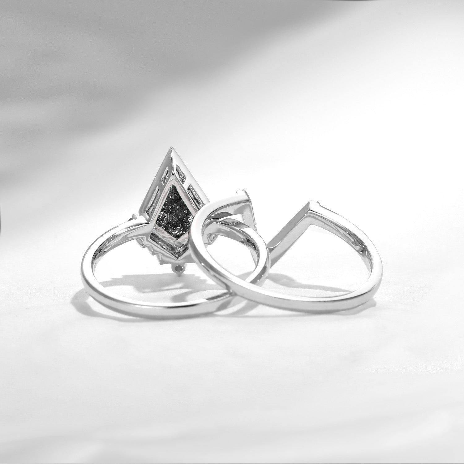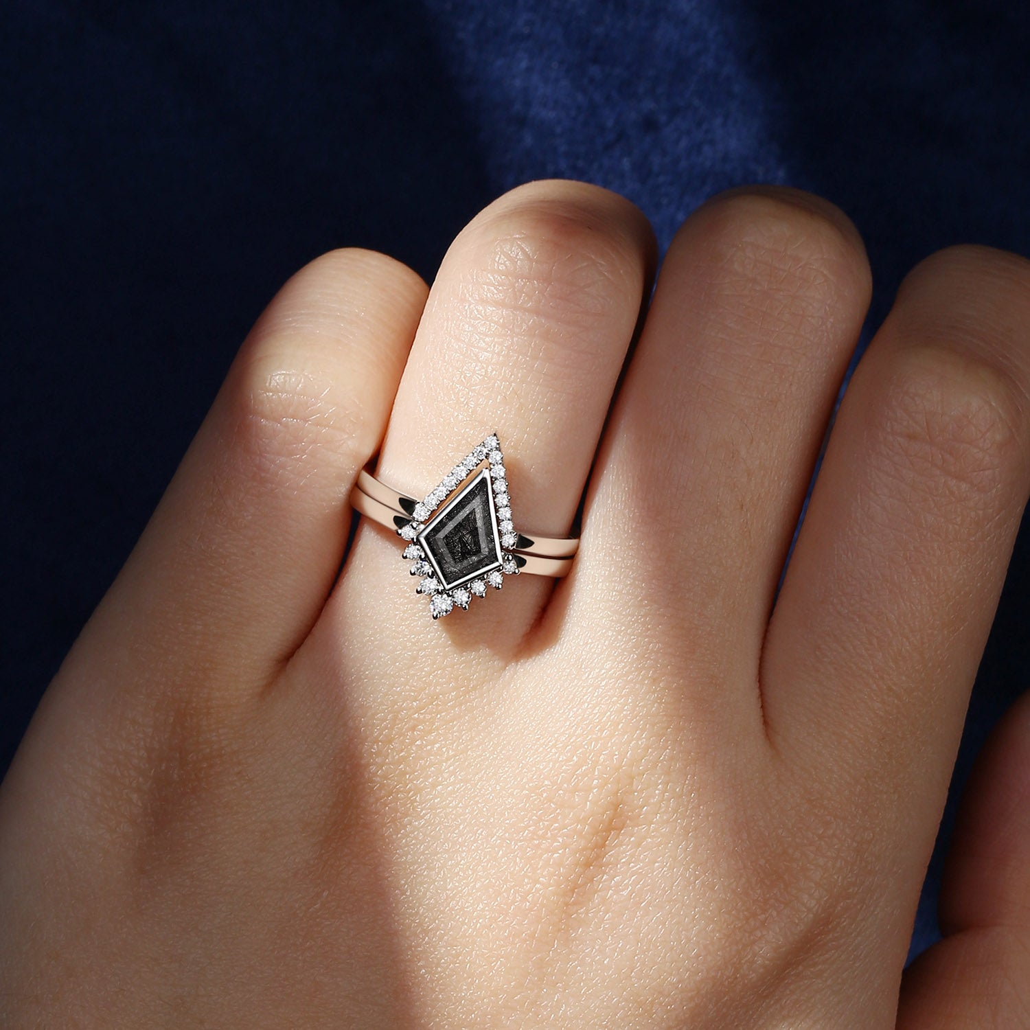 18K Art Deco Kite Shaped Black Rutilated Quartz Engagement Ring Set 2pcs - Statement
