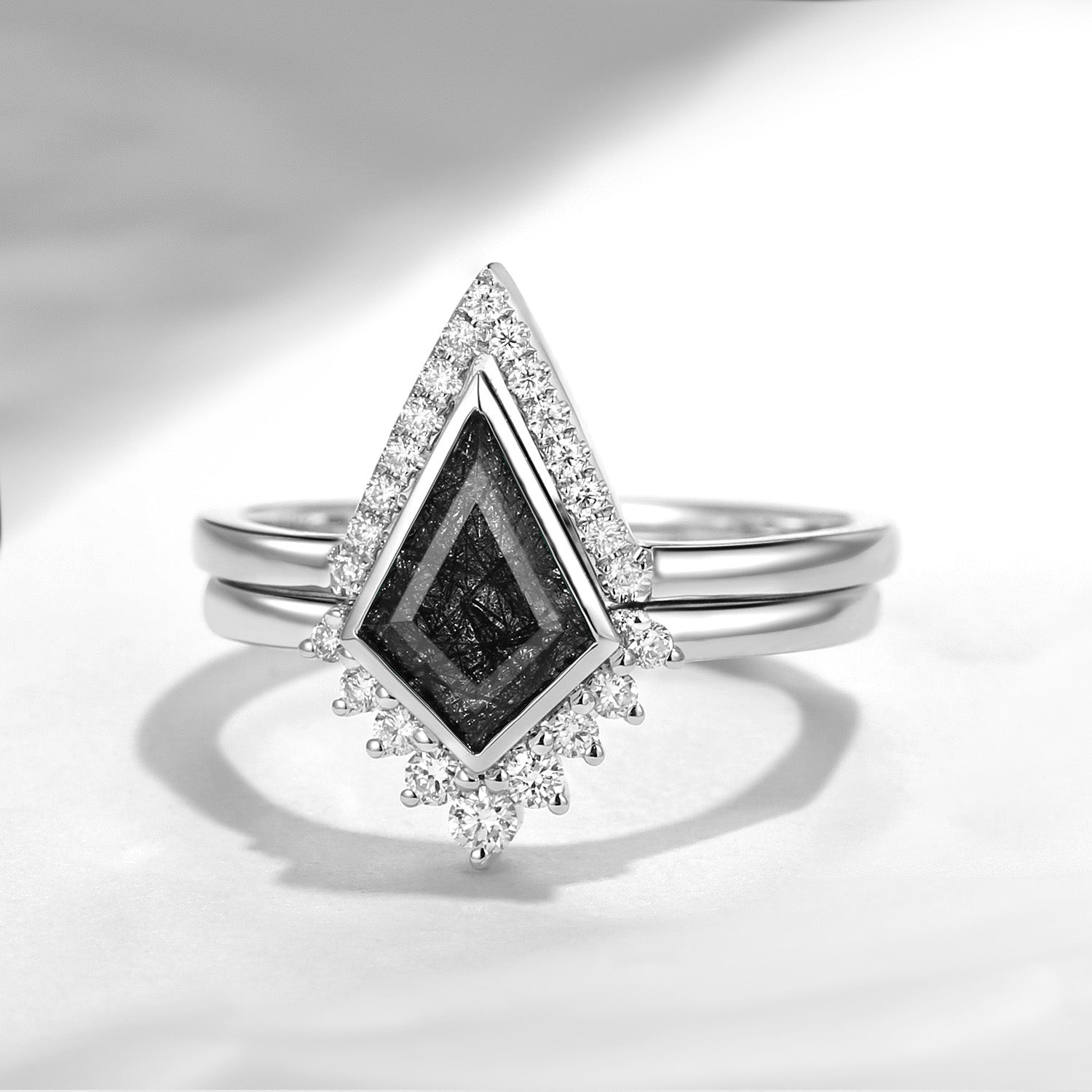 Art Deco Kite Shaped Engagement Ring Set White Gold Black Rutilated Quartz Ring Unique Art Deco Bezel Set