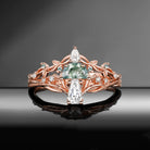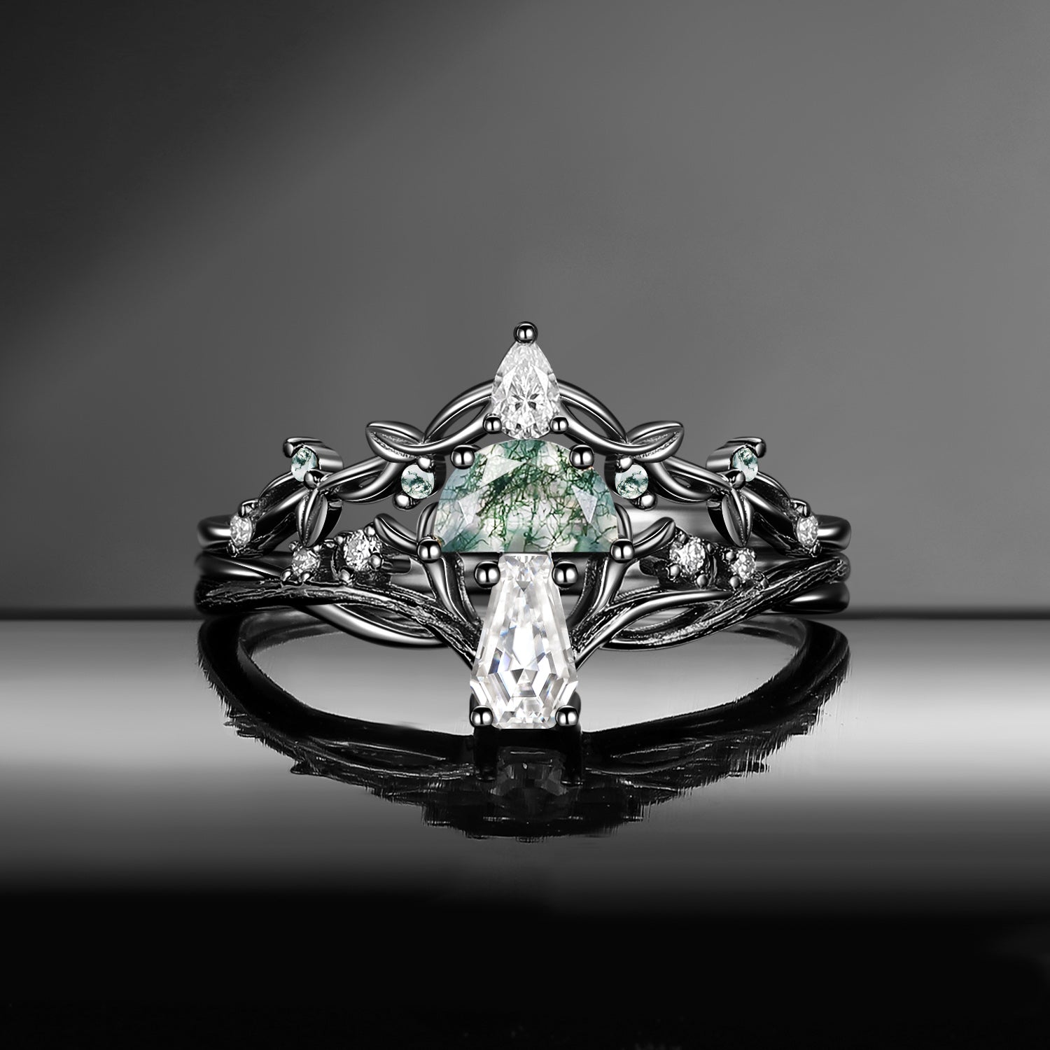 Bark Textured Half Moon Moss Agate & Coffin Moissanite 'Tree of Life' Leafy Mushroom Engagement Ring Set 2pcs