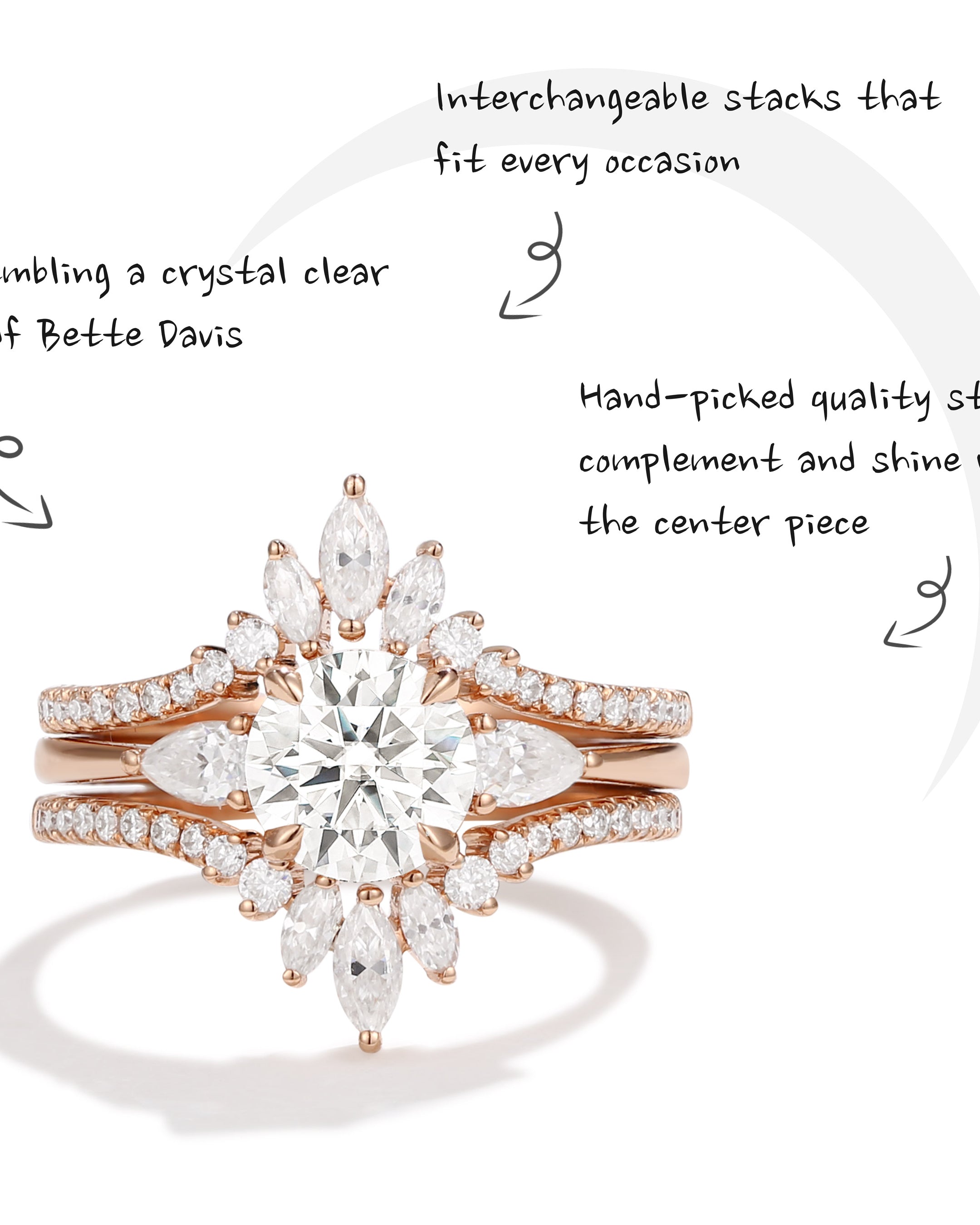 • Design - Mimicking the eyes of Bette Davis, we used different fancy color centers and different shapes of stones to emphasize the captivating gaze.