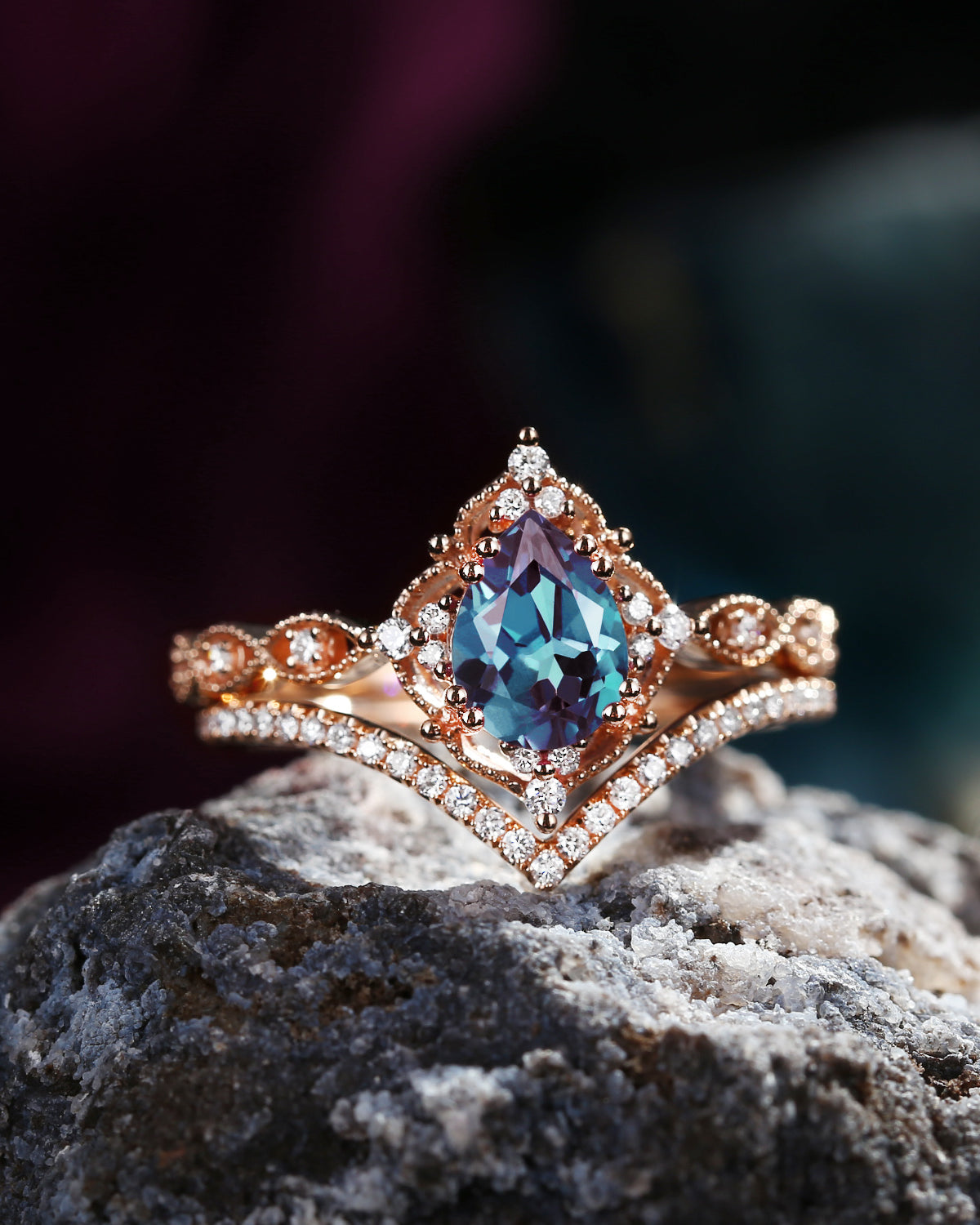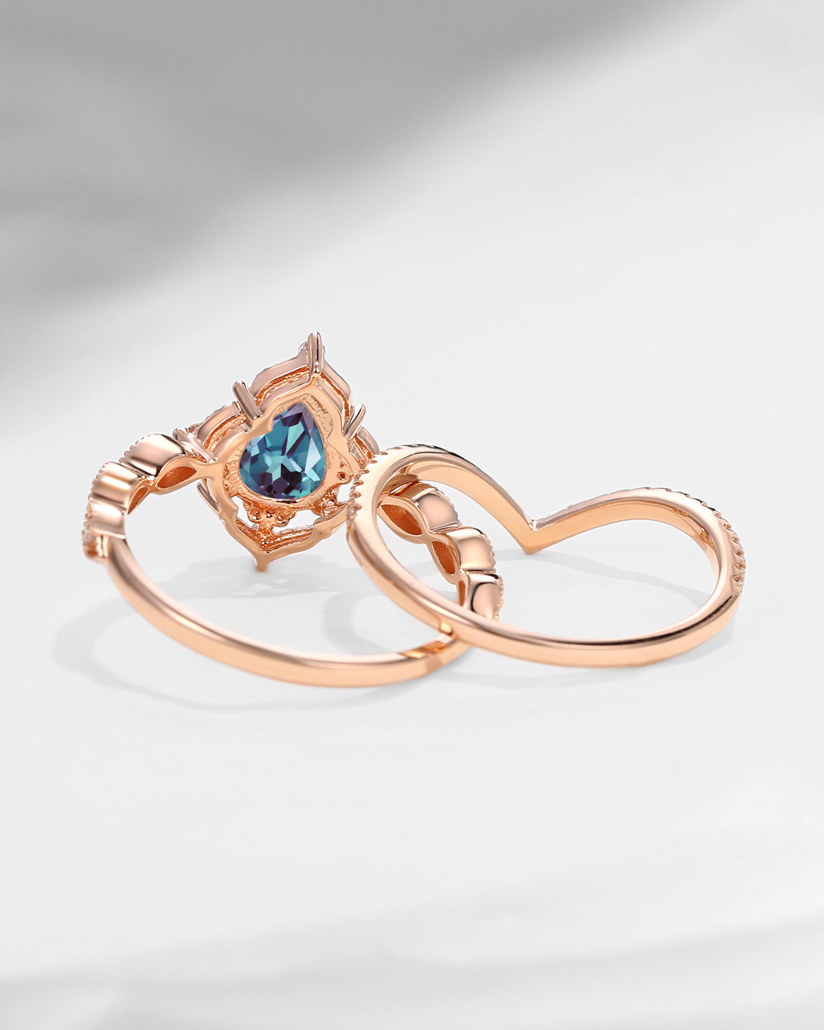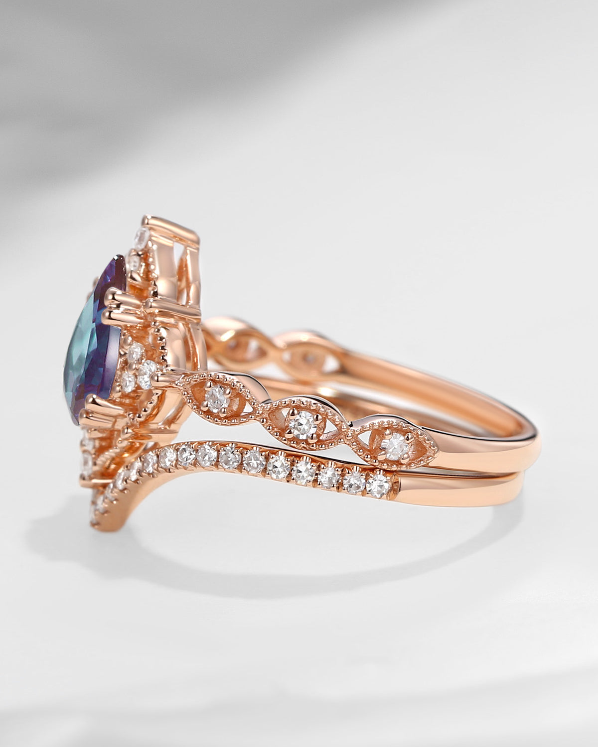 Celtic Moon | Pear Cut Lab Alexandrite Celtic Inspired Engagement Ring Set 2pcs