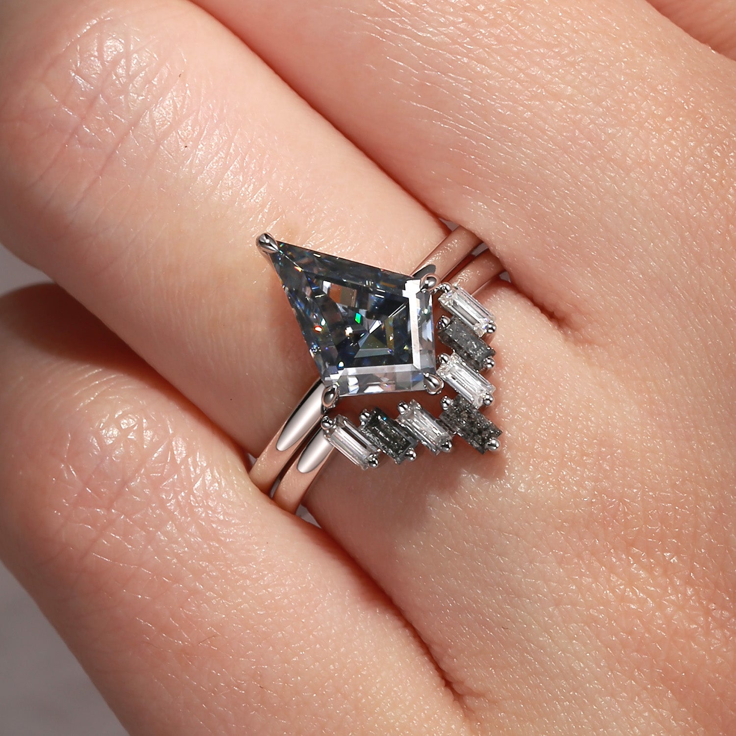 Classic Kite Cut Grey Moissanite & Salt And Pepper Diamond Engagement Ring 2pcs