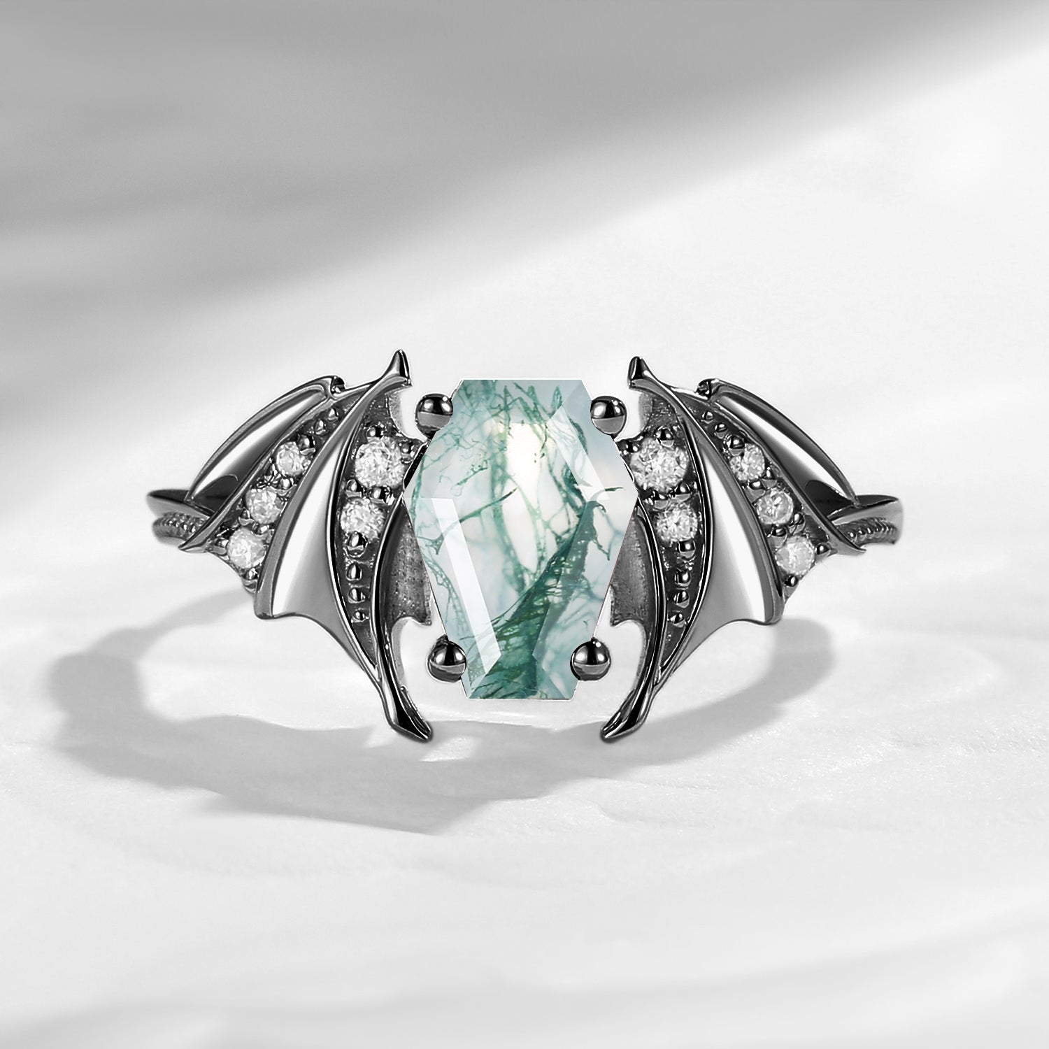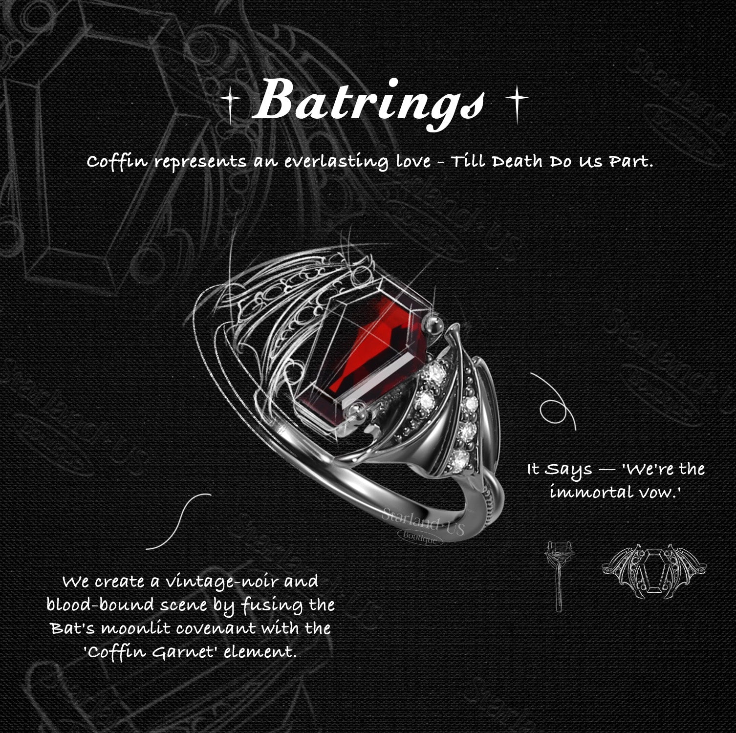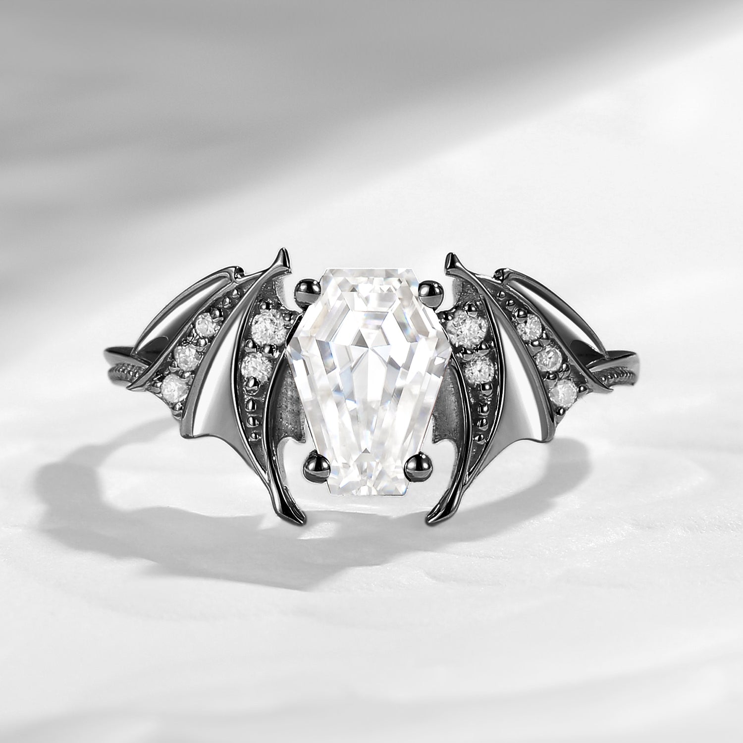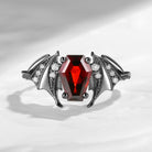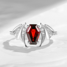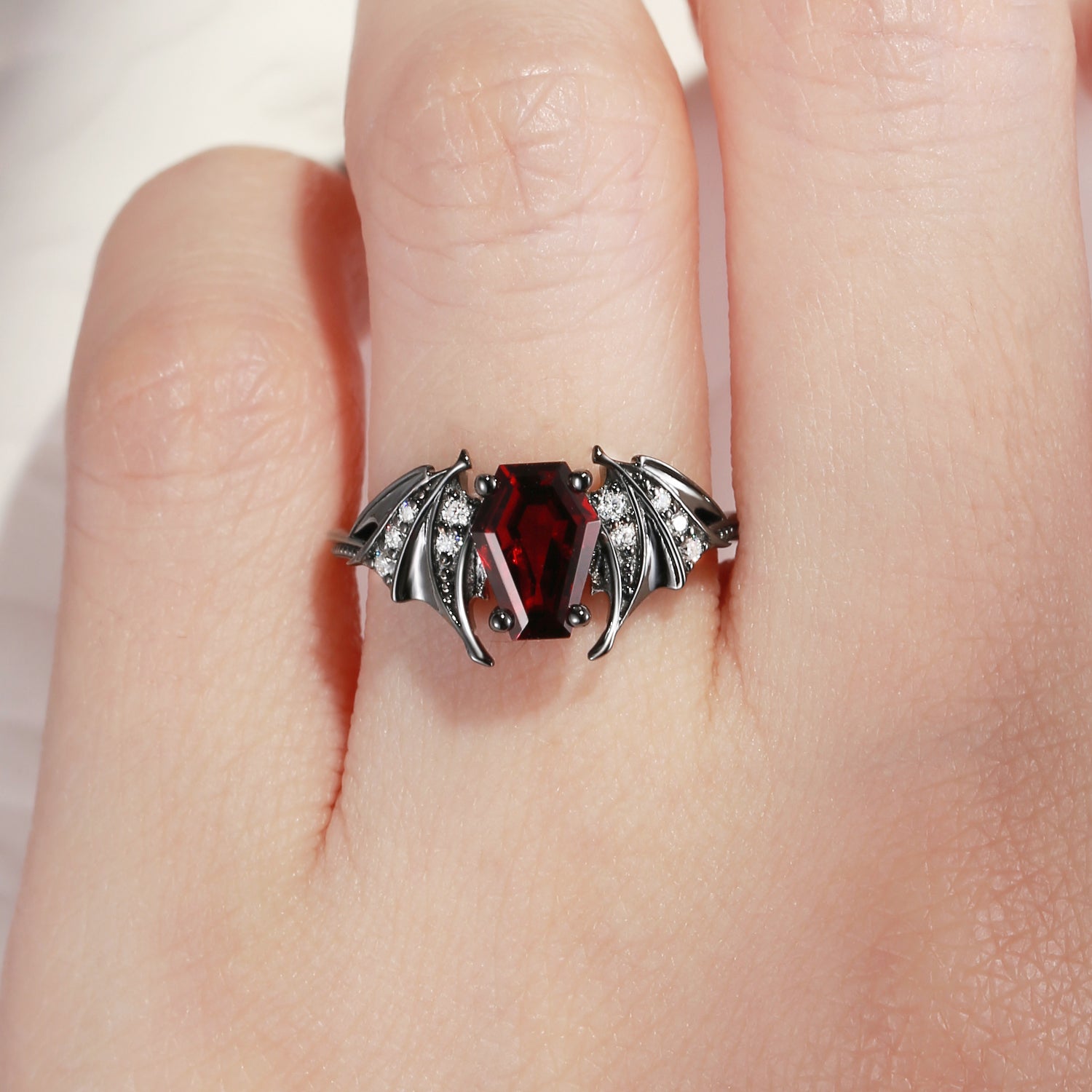 Coffin Cut Garnet Gothic Inspired Black Gold Engagement Ring - Bat Ring